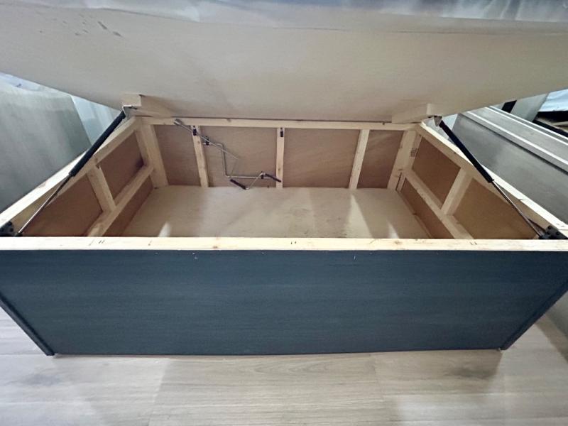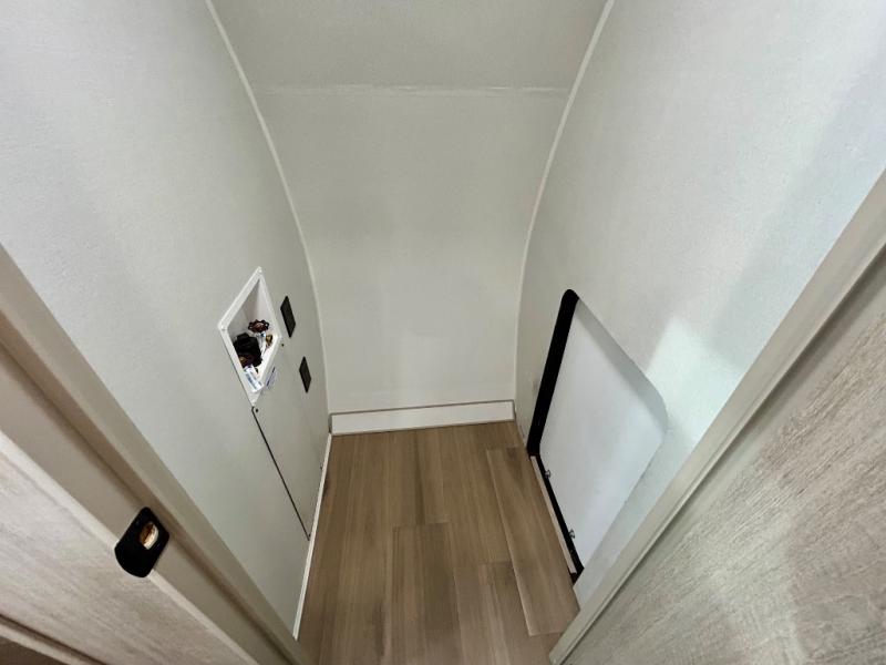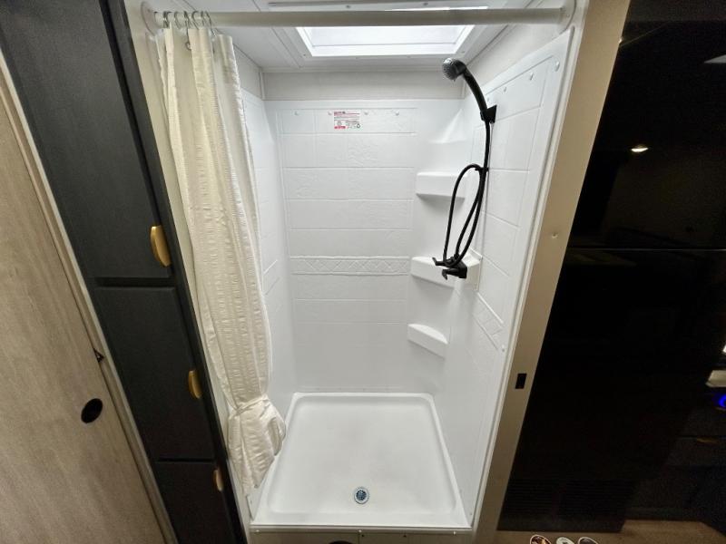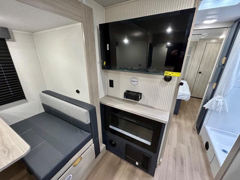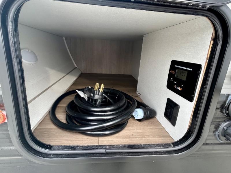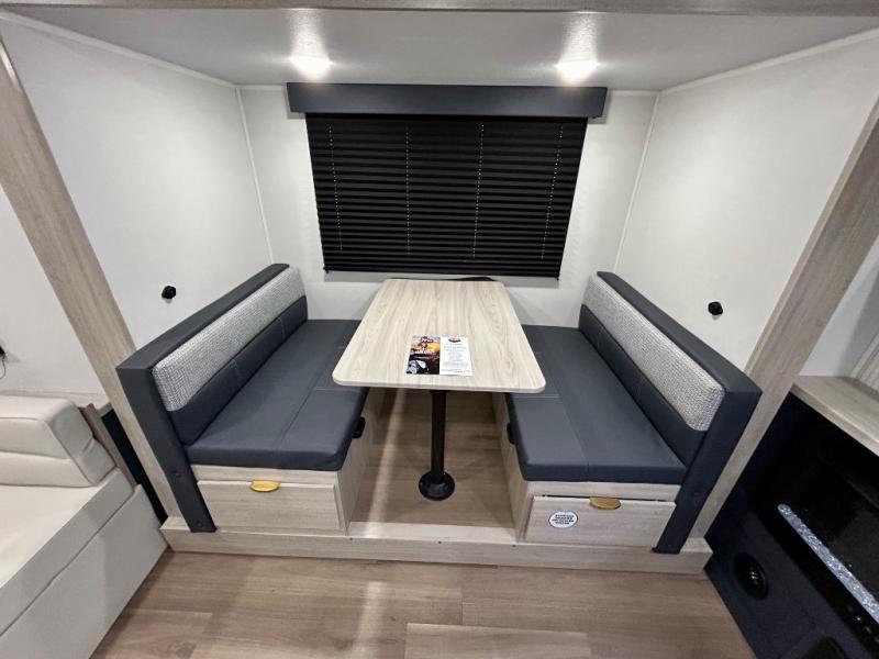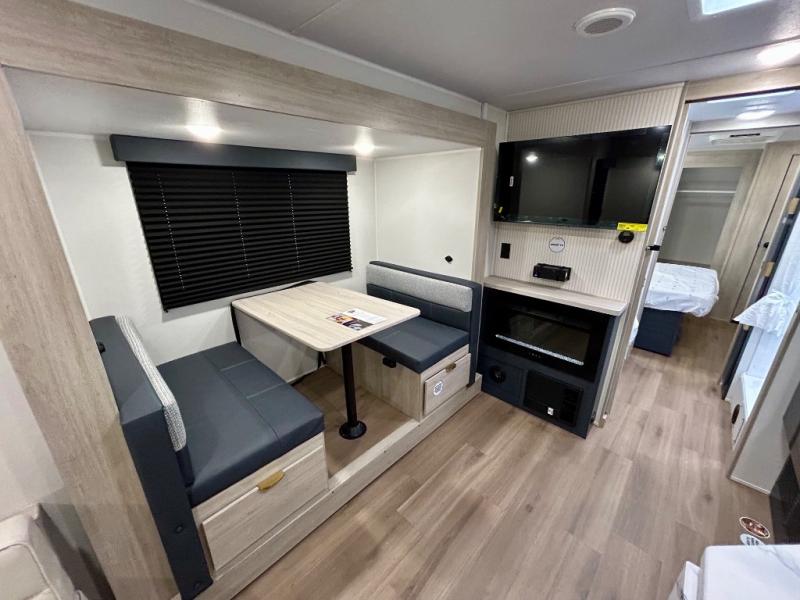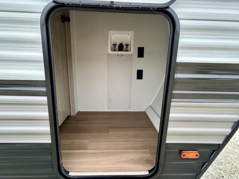 Chill in the plush jackknife sofa or gather around the booth dinette for epic game nights and laughter-filled meals. The countertop extension gives you extra space to whip up culinary masterpieces or tackle projects. The kitchen has everything you need: a sleek two-burner cooktop with a microwave below for speedy bites, a fridge to stash your faves, and overhead cabinets for clutter-free bliss. Furthermore, our walk-through bathroom is the perfect oasis, and you can get laundry sorted with washer/dryer prep and a handy hamper located in the bedroom. Also in the bedroom, you can sink into the front queen bed with heaps of storage underneath, and the wardrobe keeps your gear organized, so you can focus on making memories.