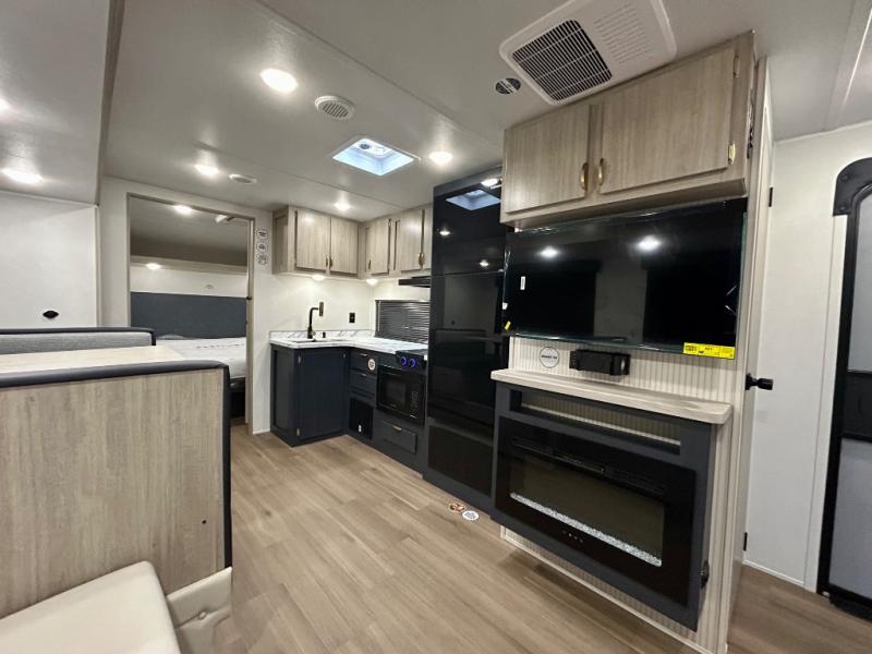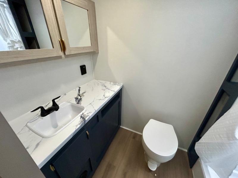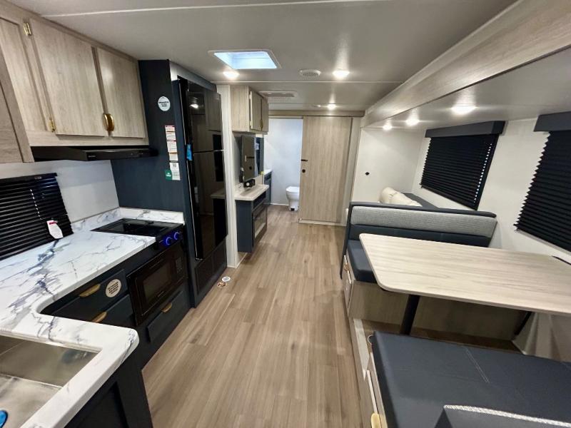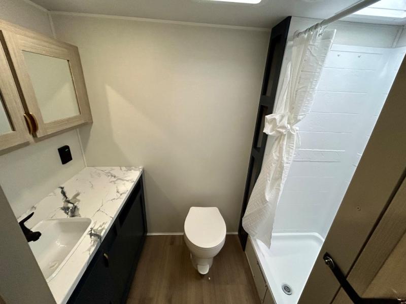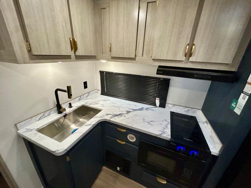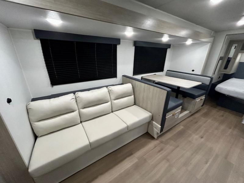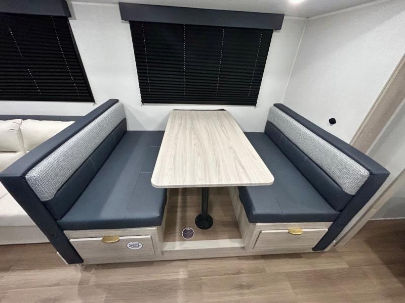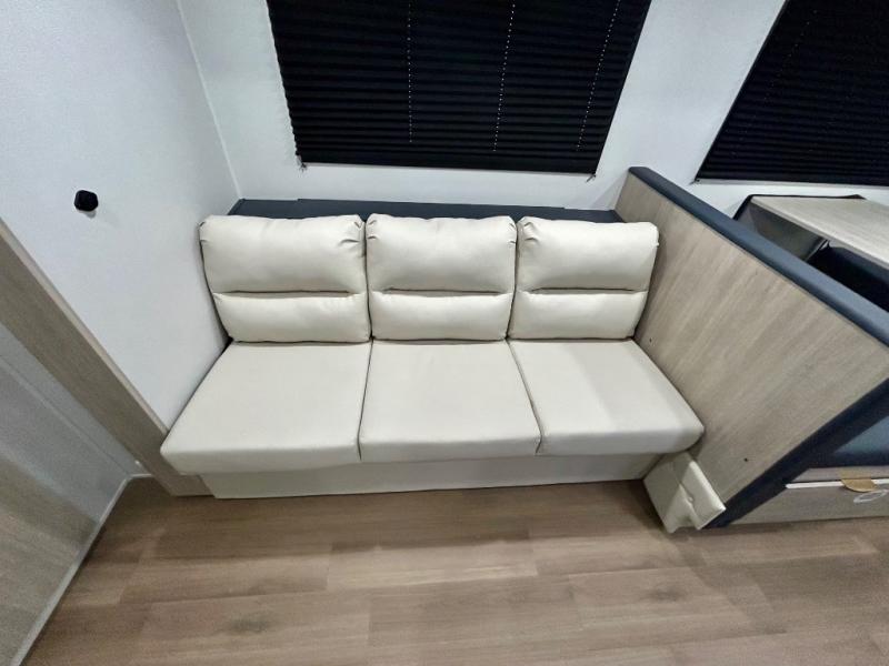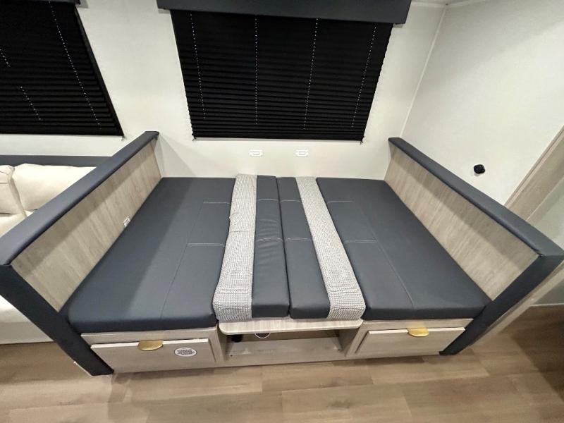 Ready to hit the road in style? The jackknife sofa is perfect for lounging, or receiving guests. The booth dinette is ready for meals or games, and the pantry, fridge, two-burner cooktop, and microwave allow for prep grub with ease. Plus, the king bed, wardrobes, and nightstands equal comfy nights and organized mornings. Also, the rear bathroom provides an ample private refresh zone!