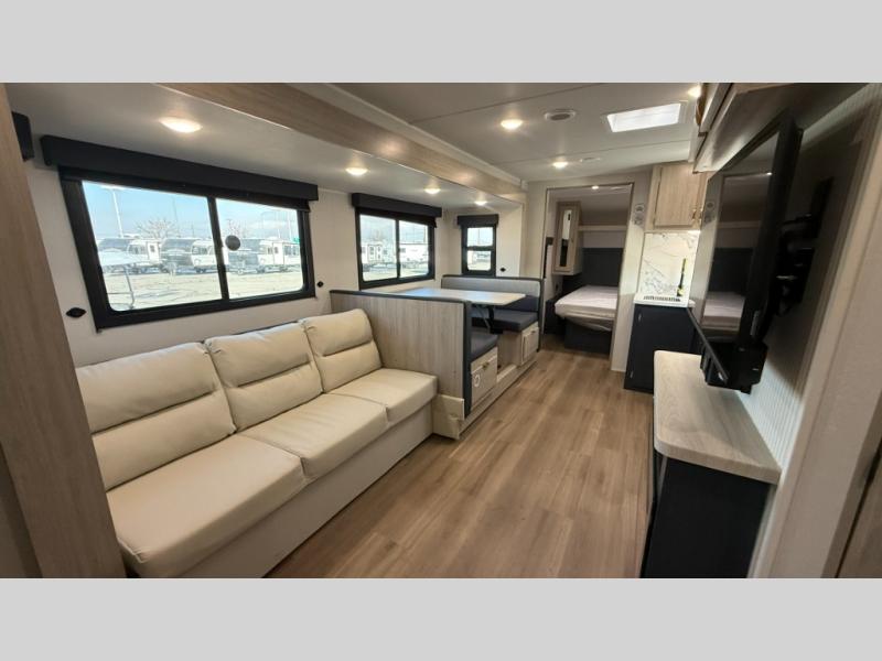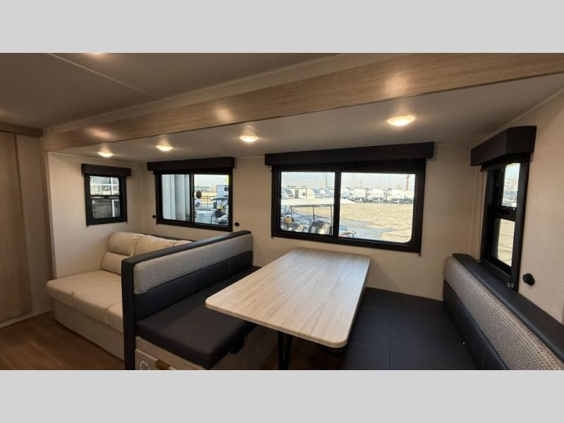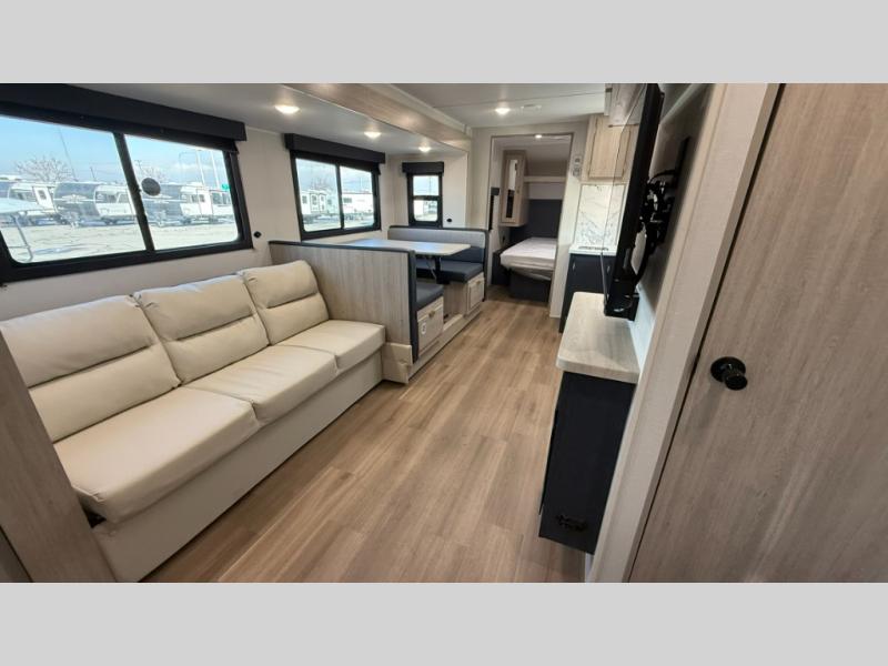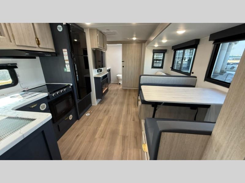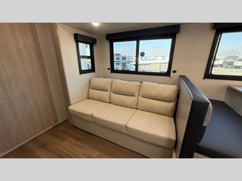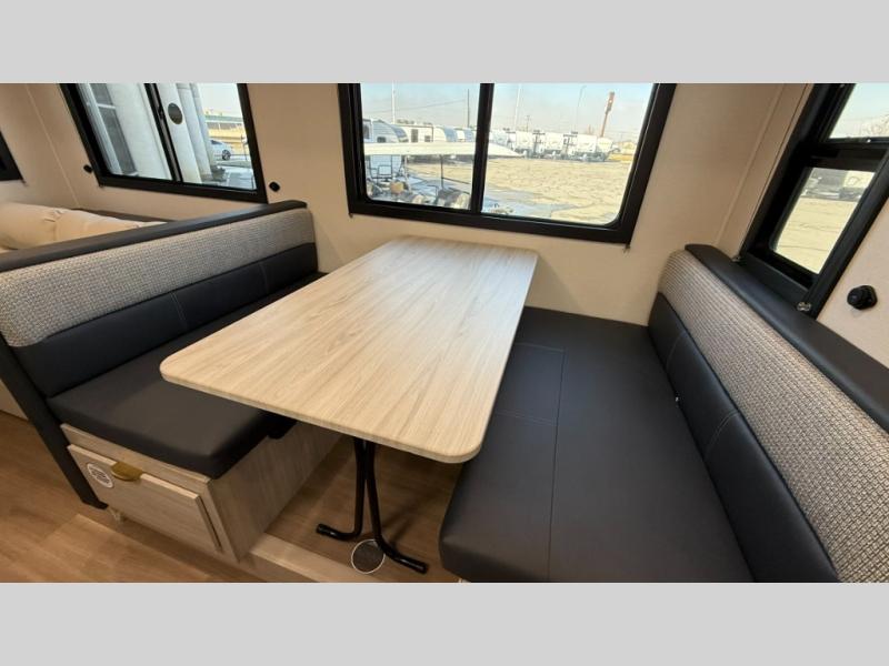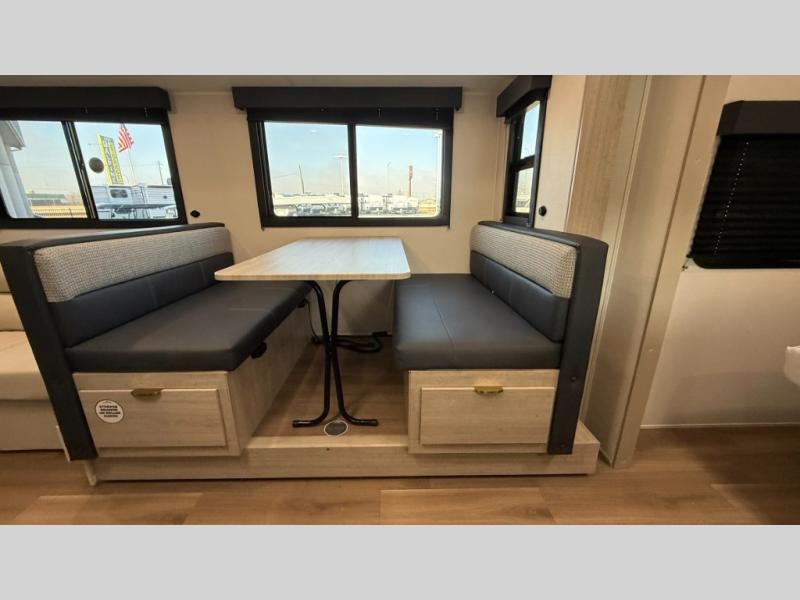 Ready to hit the road in style? The jackknife sofa is perfect for lounging, or receiving guests. The booth dinette is ready for meals or games, and the pantry, fridge, two-burner cooktop, and microwave allow for prep grub with ease. Plus, the king bed, wardrobes, and nightstands equal comfy nights and organized mornings. Also, the rear bathroom provides an ample private refresh zone!