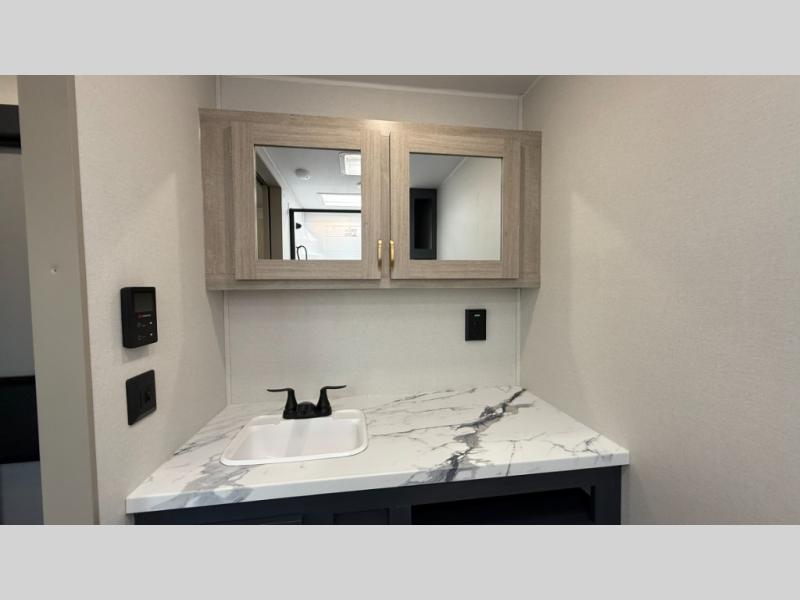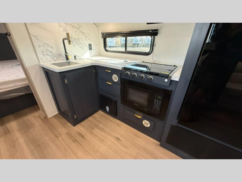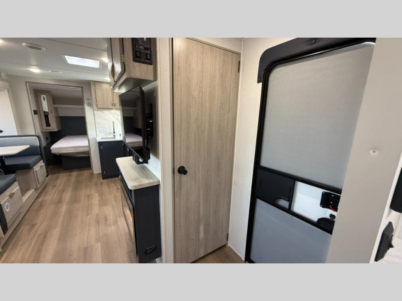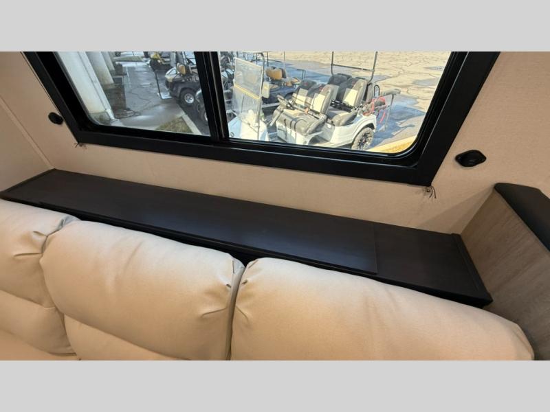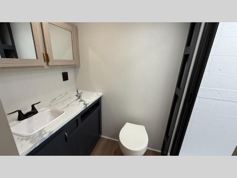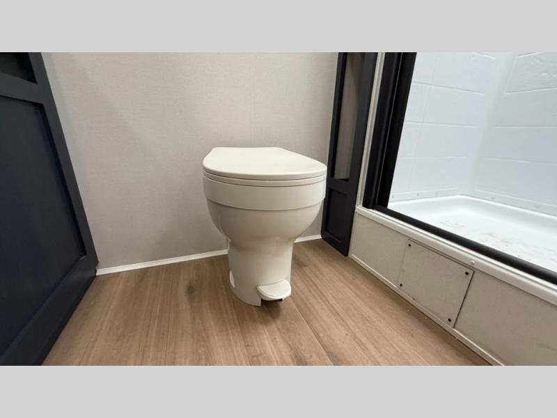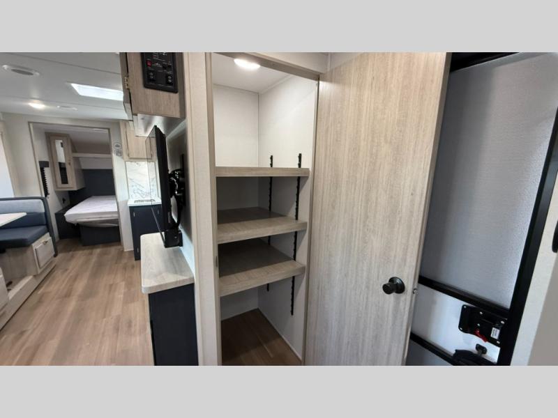 Ready to hit the road in style? The jackknife sofa is perfect for lounging, or receiving guests. The booth dinette is ready for meals or games, and the pantry, fridge, two-burner cooktop, and microwave allow for prep grub with ease. Plus, the king bed, wardrobes, and nightstands equal comfy nights and organized mornings. Also, the rear bathroom provides an ample private refresh zone!