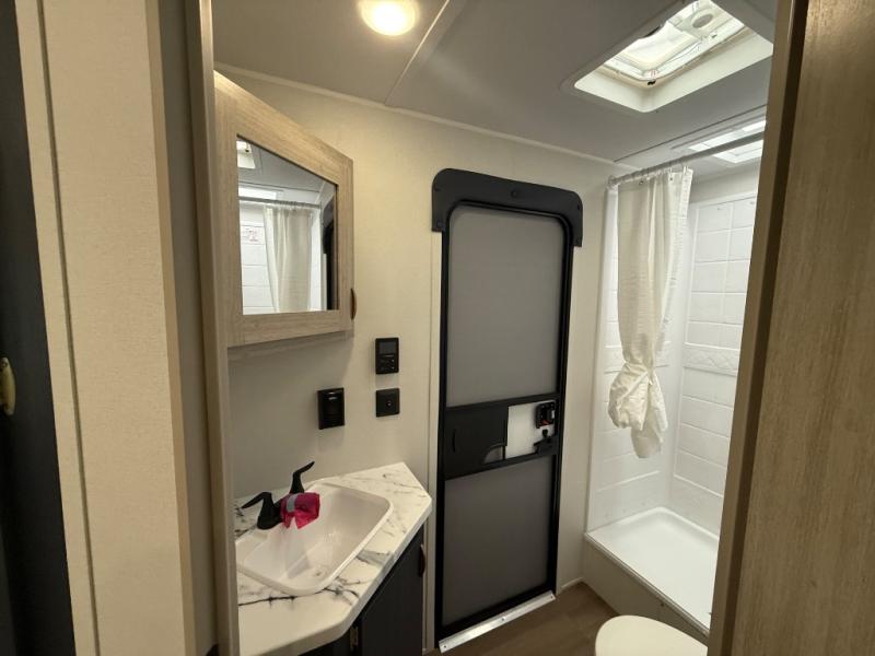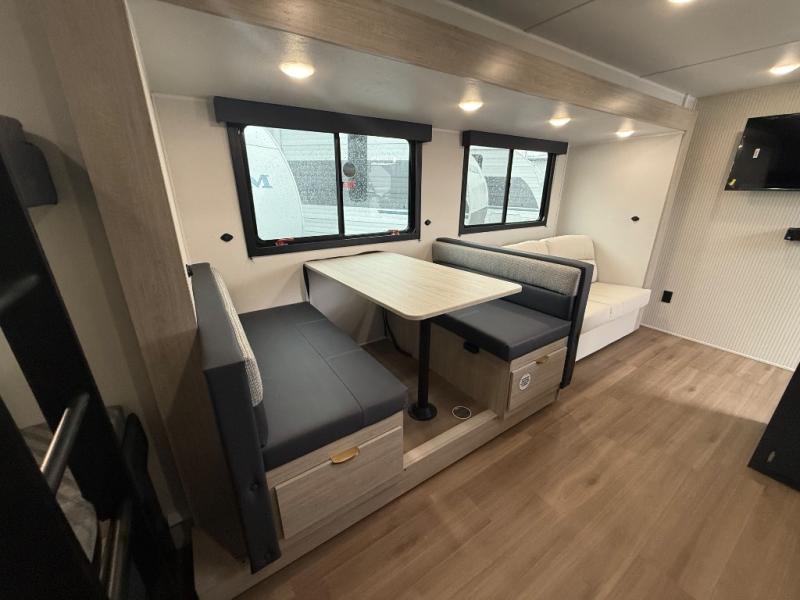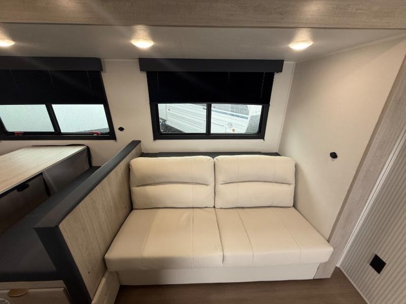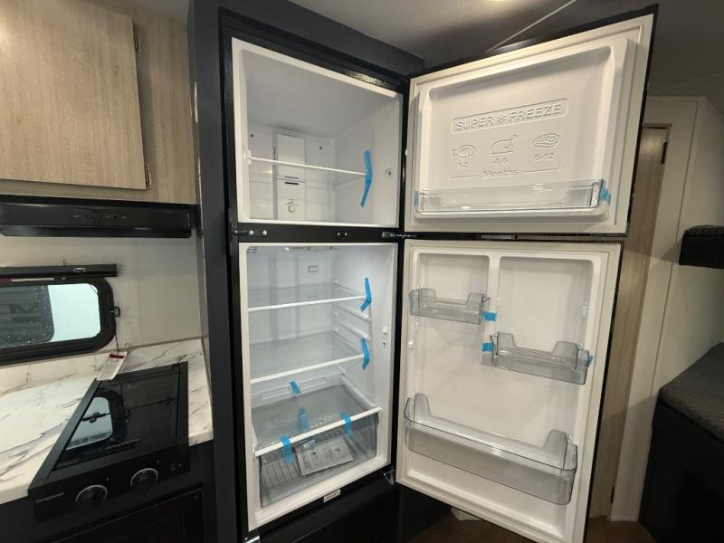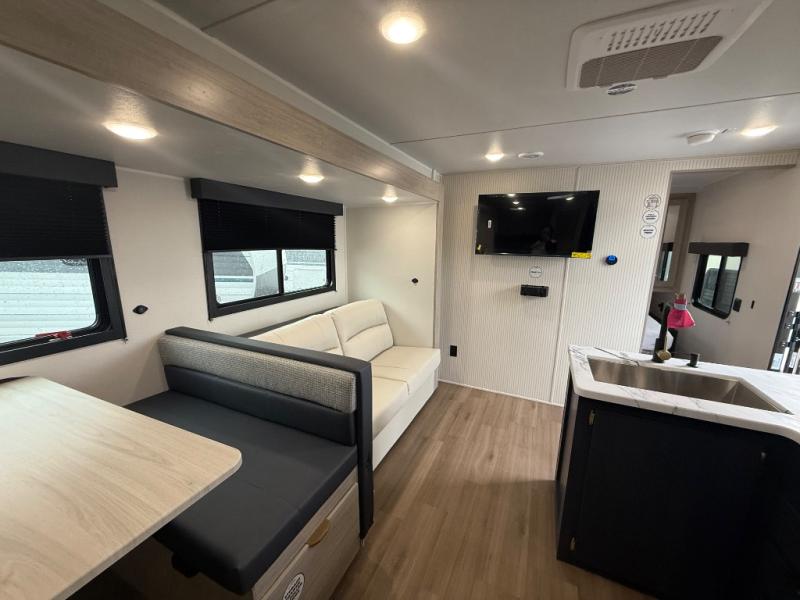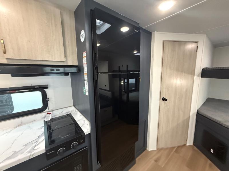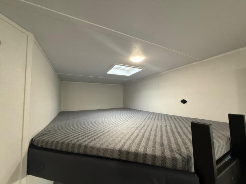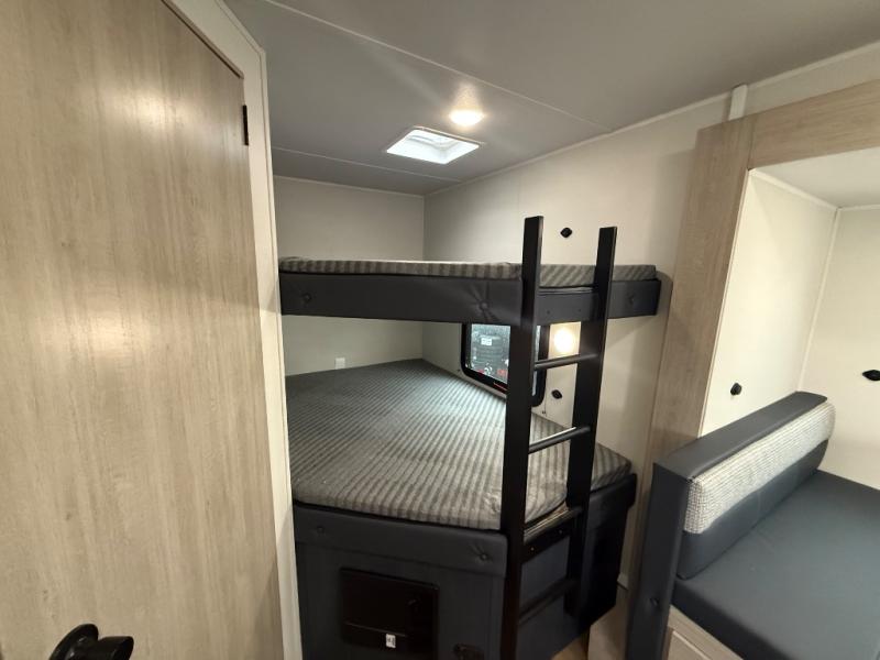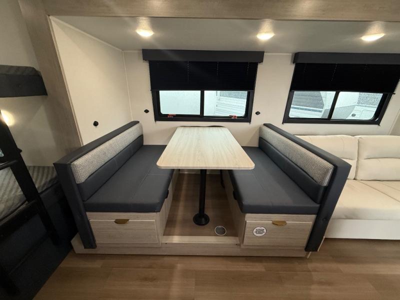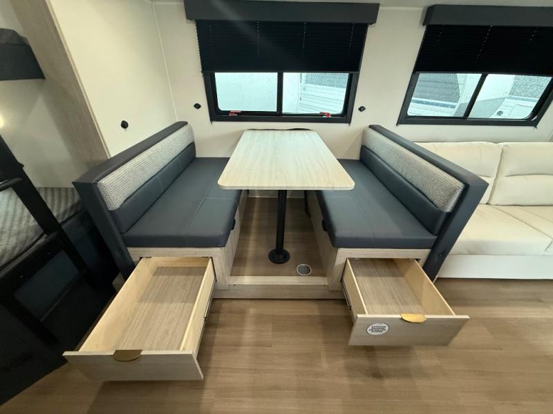 Bunk beds for the kiddos’ sleep! Front bedroom’s got a comfy king bed, wardrobes, and nightstands, perfect for grown-ups. The booth dinette is perfect for meals or games. Also, the jackknife sofa is ideal for extra chill space. Plus, the kitchen area adds a touch of feeling at home with its pantry, fridge, two-burner cooktop, microwave, and sink, ideal for preparing meals for the crew! And everyone will stay fresh with the full bathroom.