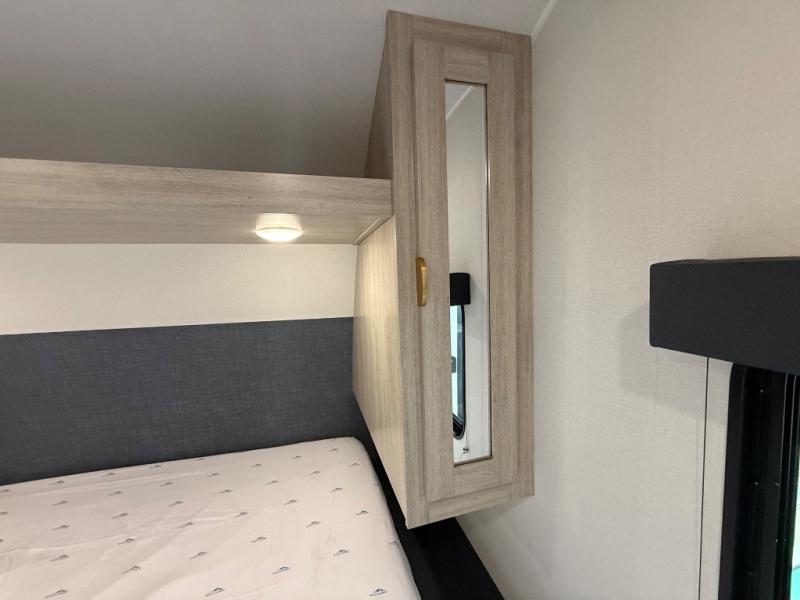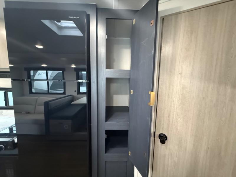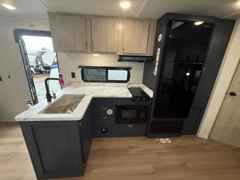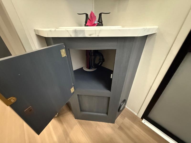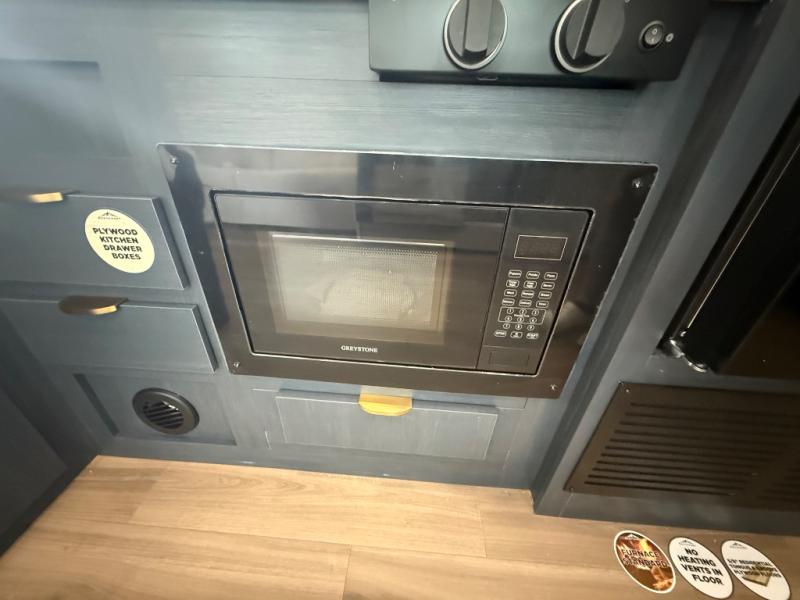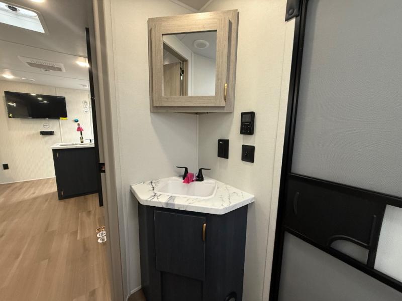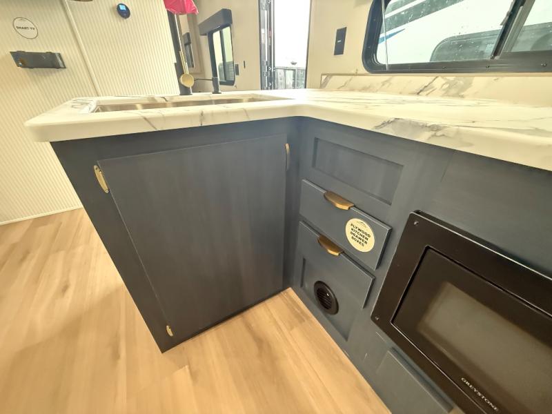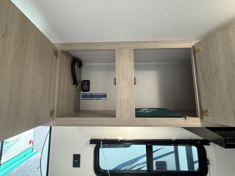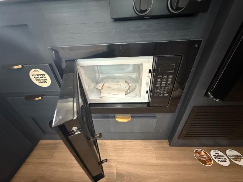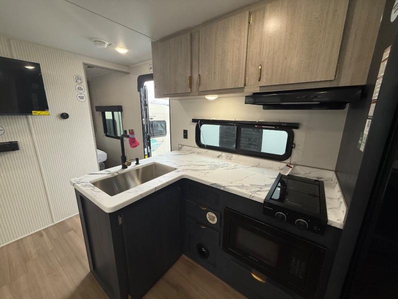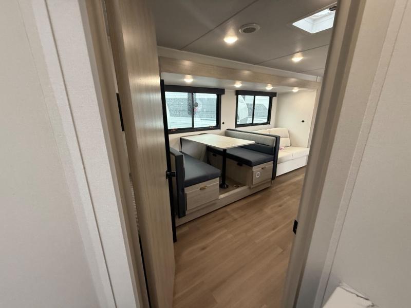 Bunk beds for the kiddos’ sleep! Front bedroom’s got a comfy king bed, wardrobes, and nightstands, perfect for grown-ups. The booth dinette is perfect for meals or games. Also, the jackknife sofa is ideal for extra chill space. Plus, the kitchen area adds a touch of feeling at home with its pantry, fridge, two-burner cooktop, microwave, and sink, ideal for preparing meals for the crew! And everyone will stay fresh with the full bathroom.