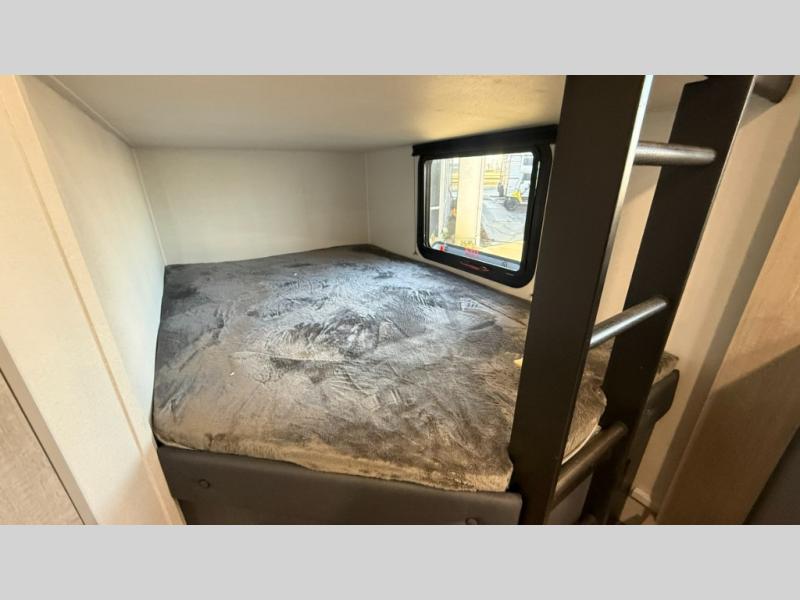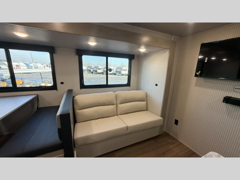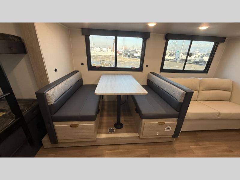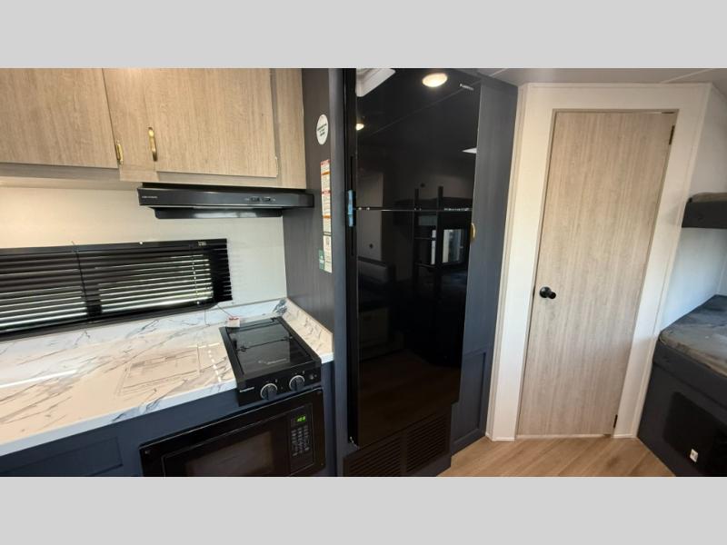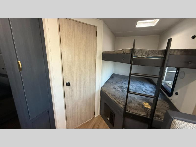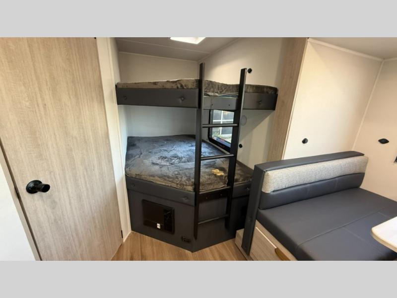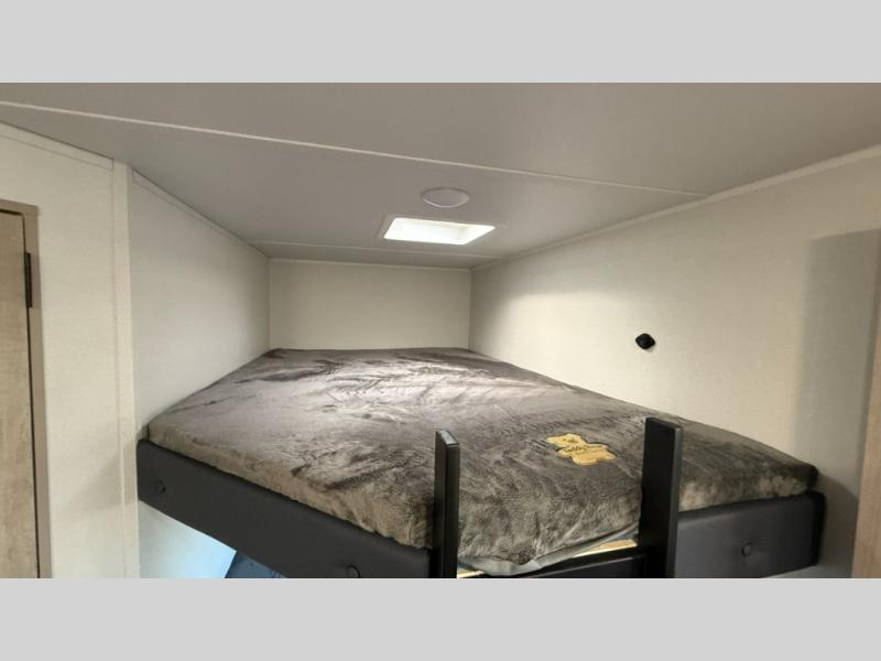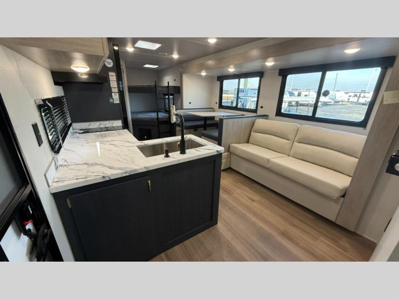 Bunk beds for the kiddos’ sleep! Front bedroom’s got a comfy king bed, wardrobes, and nightstands, perfect for grown-ups. The booth dinette is perfect for meals or games. Also, the jackknife sofa is ideal for extra chill space. Plus, the kitchen area adds a touch of feeling at home with its pantry, fridge, two-burner cooktop, microwave, and sink, ideal for preparing meals for the crew! And everyone will stay fresh with the full bathroom.