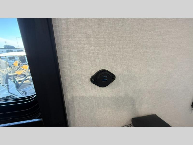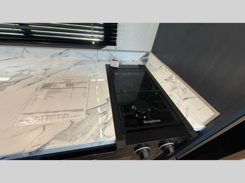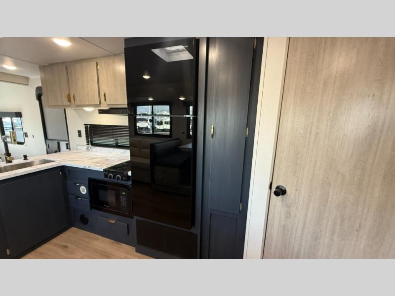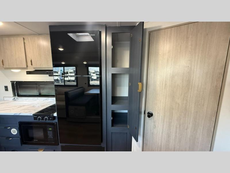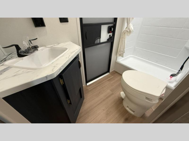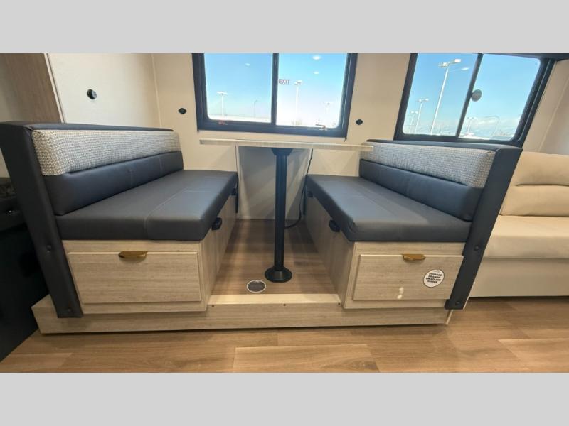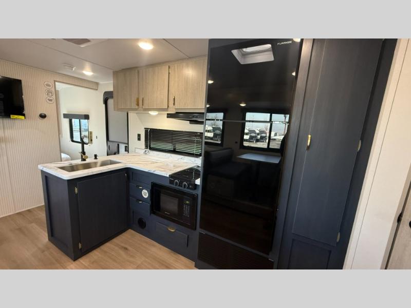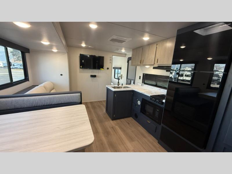 Bunk beds for the kiddos’ sleep! Front bedroom’s got a comfy king bed, wardrobes, and nightstands, perfect for grown-ups. The booth dinette is perfect for meals or games. Also, the jackknife sofa is ideal for extra chill space. Plus, the kitchen area adds a touch of feeling at home with its pantry, fridge, two-burner cooktop, microwave, and sink, ideal for preparing meals for the crew! And everyone will stay fresh with the full bathroom.