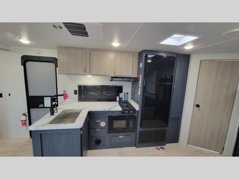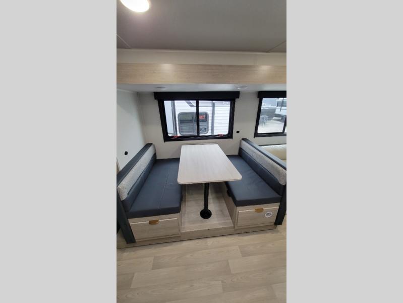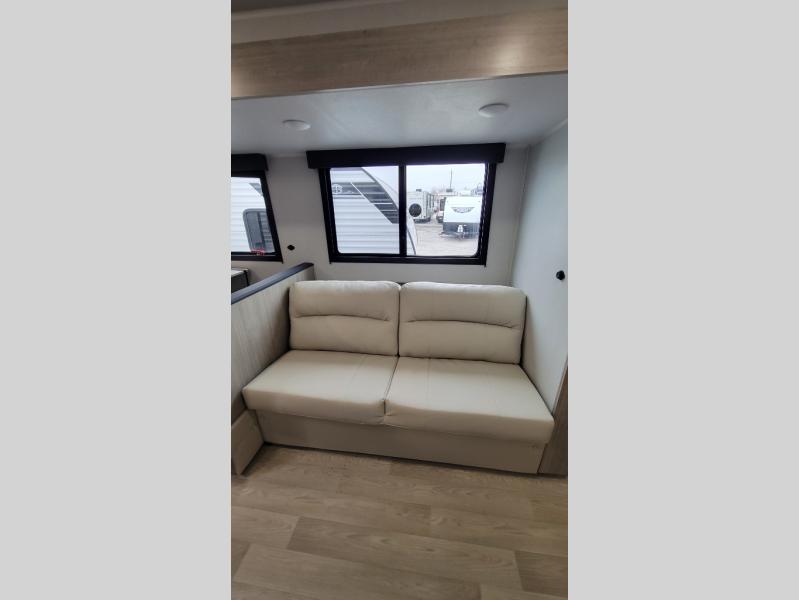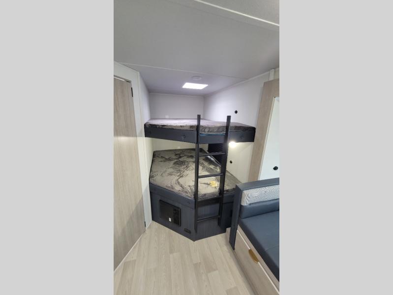 Bunk beds for the kiddos’ sleep! Front bedroom’s got a comfy king bed, wardrobes, and nightstands, perfect for grown-ups. The booth dinette is perfect for meals or games. Also, the jackknife sofa is ideal for extra chill space. Plus, the kitchen area adds a touch of feeling at home with its pantry, fridge, two-burner cooktop, microwave, and sink, ideal for preparing meals for the crew! And everyone will stay fresh with the full bathroom.