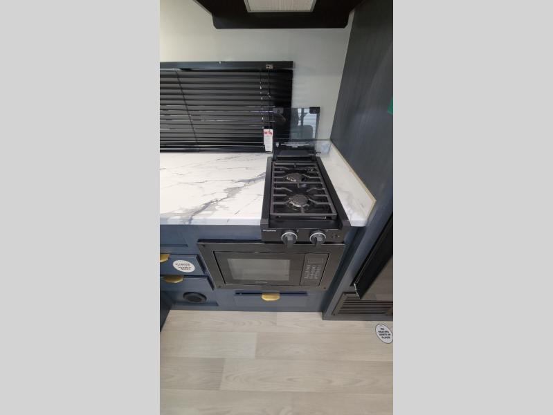 Bunk beds for the kiddos’ sleep! Front bedroom’s got a comfy king bed, wardrobes, and nightstands, perfect for grown-ups. The booth dinette is perfect for meals or games. Also, the jackknife sofa is ideal for extra chill space. Plus, the kitchen area adds a touch of feeling at home with its pantry, fridge, two-burner cooktop, microwave, and sink, ideal for preparing meals for the crew! And everyone will stay fresh with the full bathroom.