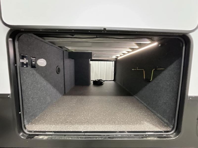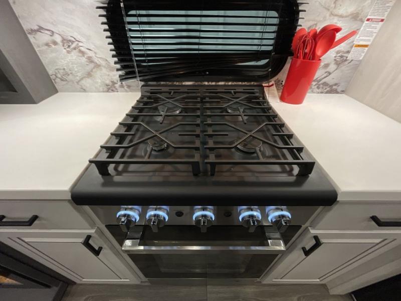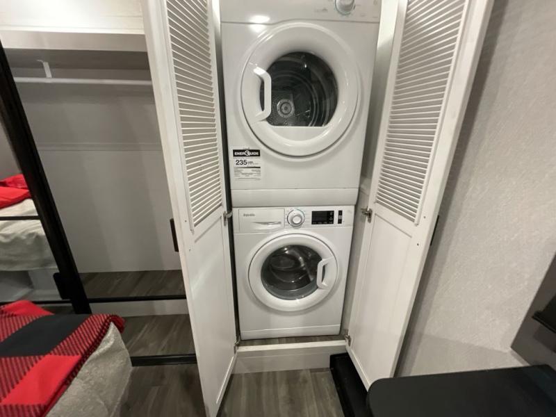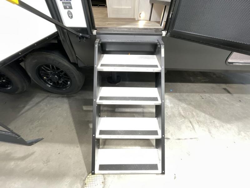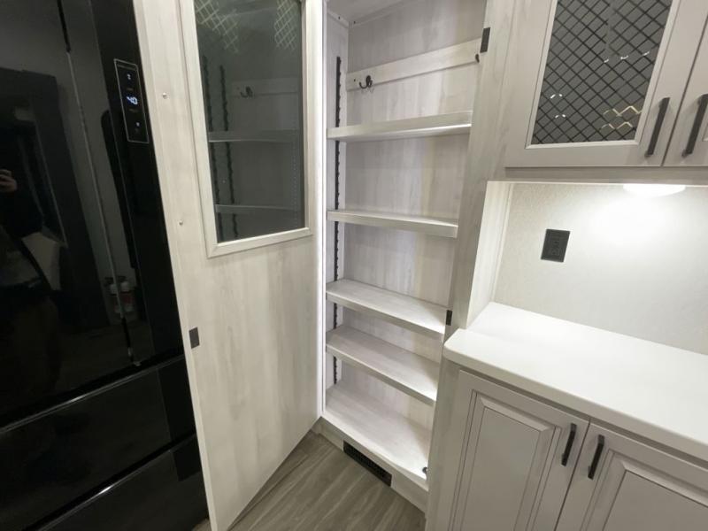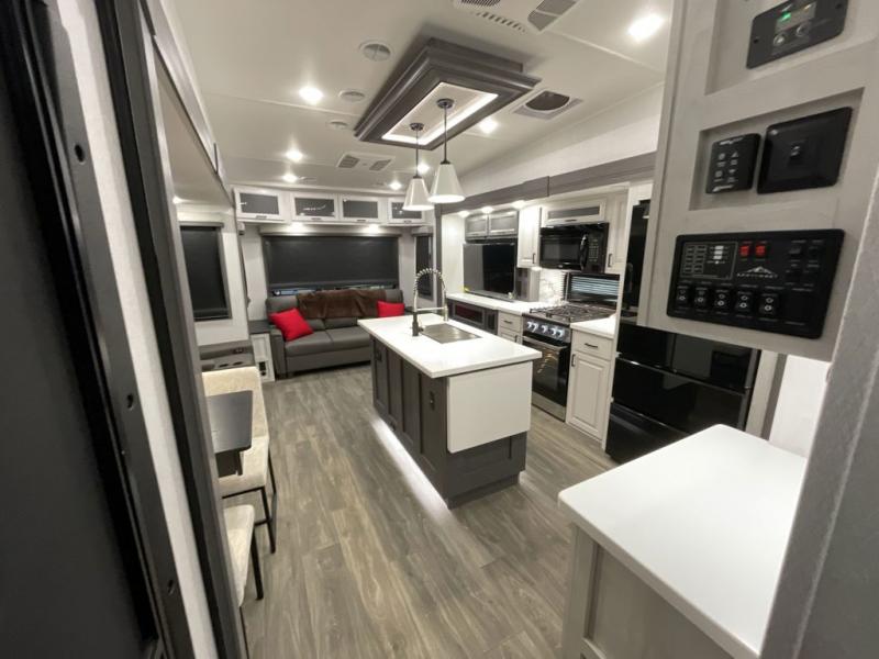 There isn't a thing you won't love about this Ahara fifth wheel! It offers you an excellent front bedroom that has a king bed slide with drawers under the bed, a sliding dresser top with hidden storage across from the bed for adding a TV, a closet with washer/dryer prep, and a large closet with sliding doors for your clothes. The kitchen is also quite amazing with its pantry, hutch, 16-cubic foot 12V refrigerator, four-burner range, 30" microwave, and a kitchen island with countertop extensions. As you sit back on the theater seating or 78" sofa, you'll be kept warm by the 5,100 BTU electric fireplace below the TV, and you can also sit in one of the chairs at the free-standing dinette if you need to work on the computer.