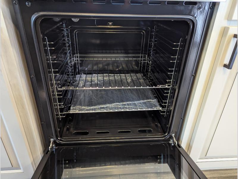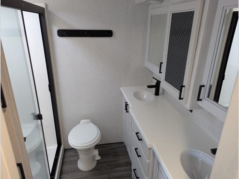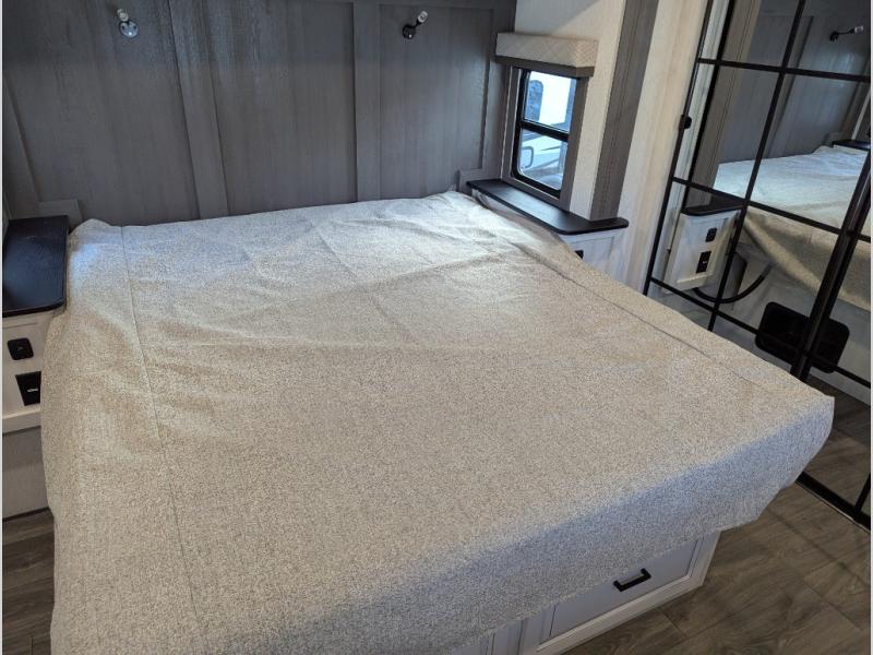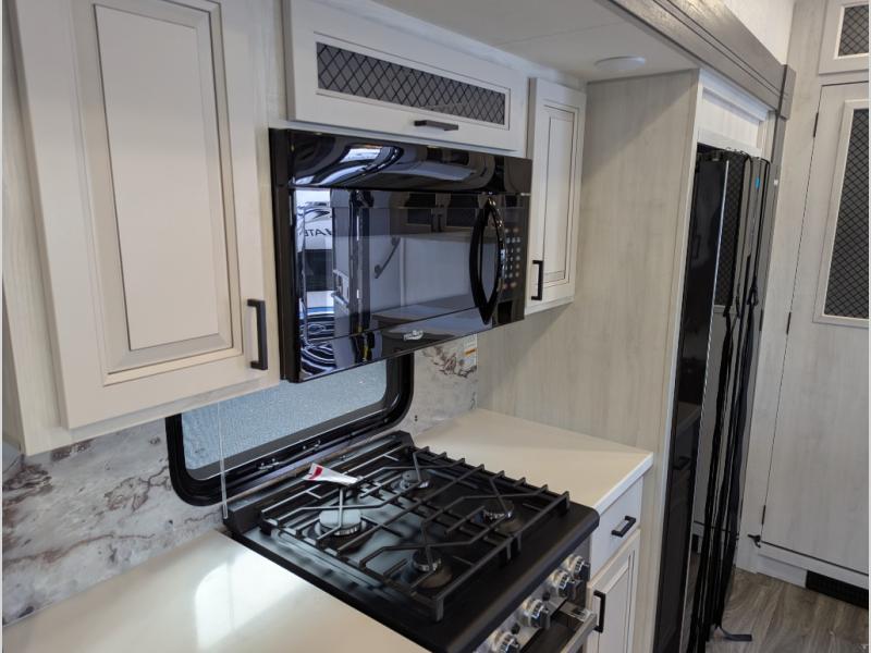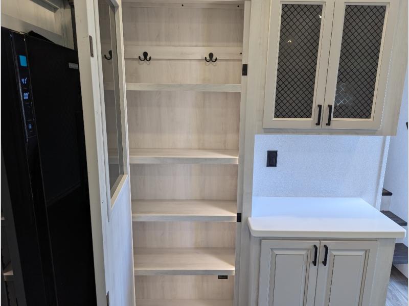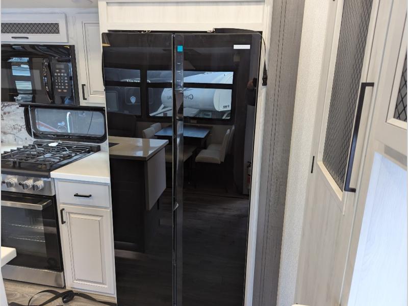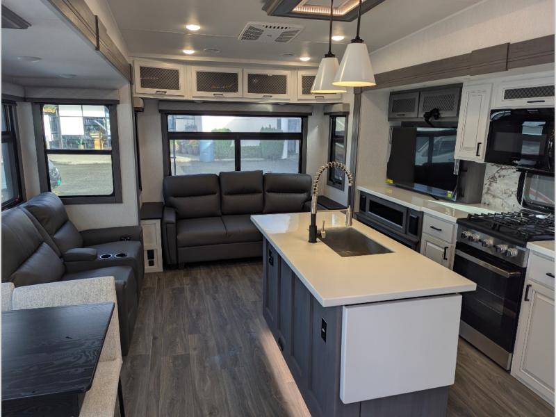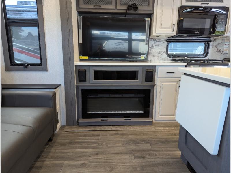 Besides the dimensions and the weights, the only real difference between this Ahara fifth wheel and model 325RL is the bedroom and bathroom configuration. This model offers you a private bedroom that has a king bed slide with drawers under the bed, a sliding dresser top with hidden storage across from the bed, a closet with washer/dryer prep, and a large closet with sliding doors for your clothes. The full bathroom is located right next to the bedroom, and it offers you a dual-sink vanity which is helpful because it allows two people to wash their face and brush their teeth at the same time. The kitchen is quite amazing with its kitchen island with countertop extensions, pantry and hutch, 16-cubic foot 12V refrigerator, and 24" residential oven. As you sit back on the theater seating or 78" sofa, you'll be kept warm by the 5,100 BTU electric fireplace below the TV.