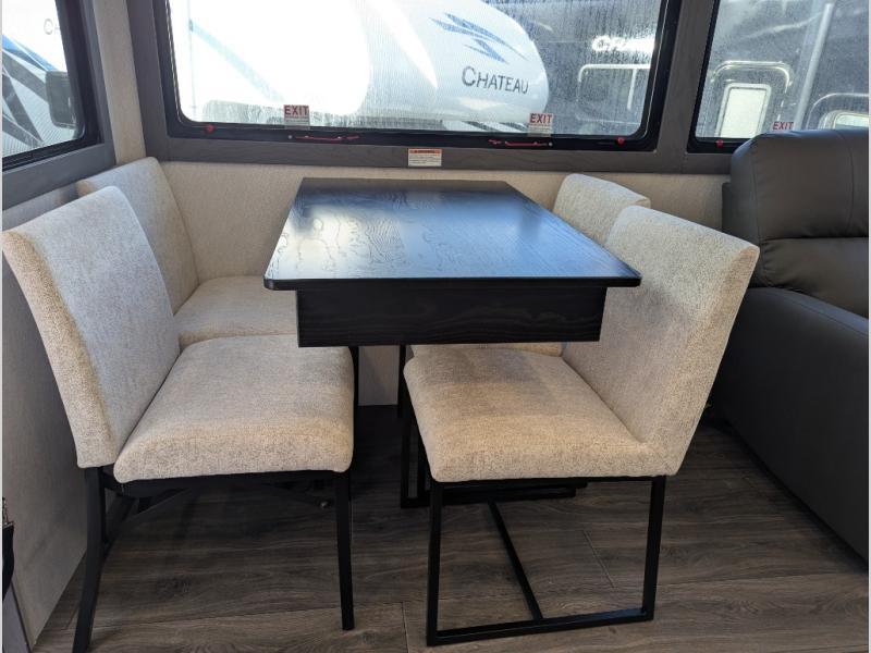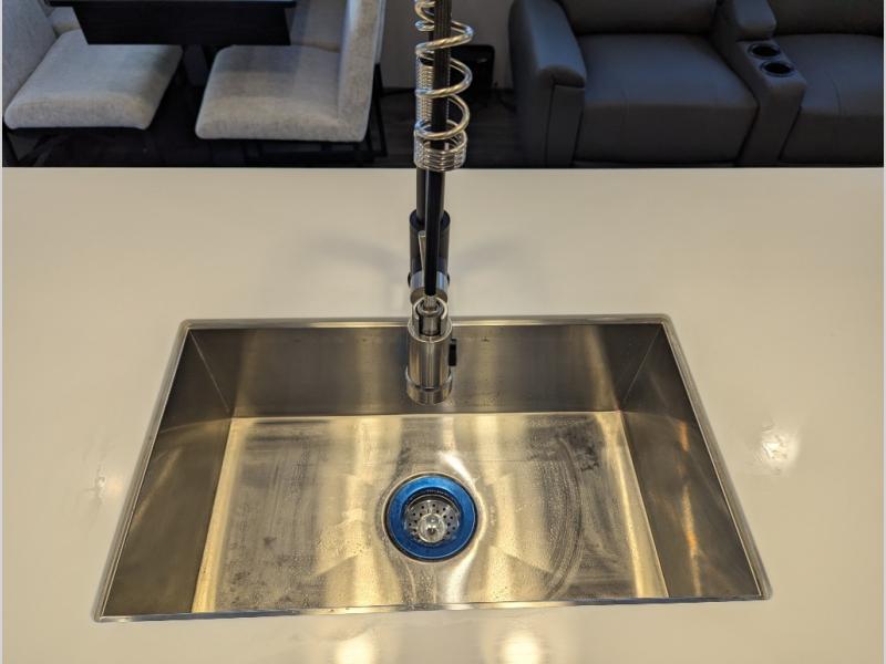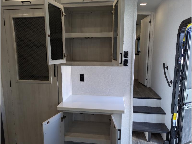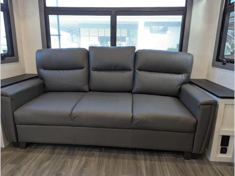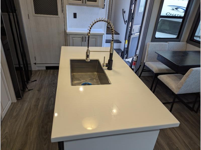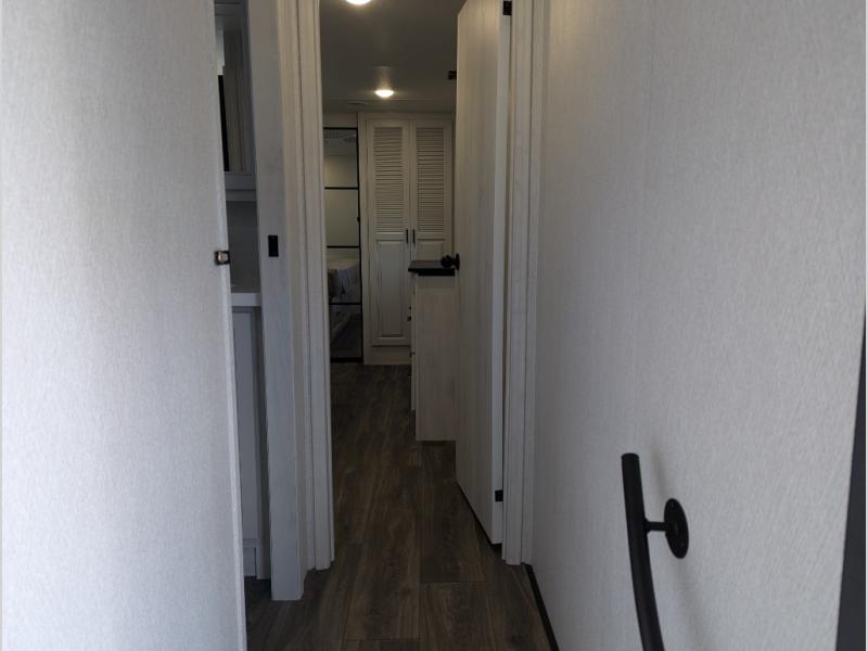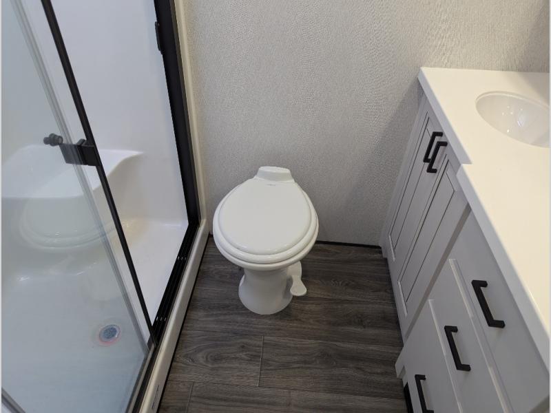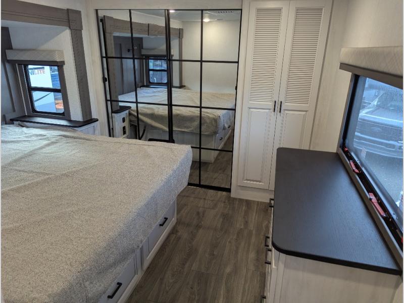 Besides the dimensions and the weights, the only real difference between this Ahara fifth wheel and model 325RL is the bedroom and bathroom configuration. This model offers you a private bedroom that has a king bed slide with drawers under the bed, a sliding dresser top with hidden storage across from the bed, a closet with washer/dryer prep, and a large closet with sliding doors for your clothes. The full bathroom is located right next to the bedroom, and it offers you a dual-sink vanity which is helpful because it allows two people to wash their face and brush their teeth at the same time. The kitchen is quite amazing with its kitchen island with countertop extensions, pantry and hutch, 16-cubic foot 12V refrigerator, and 24" residential oven. As you sit back on the theater seating or 78" sofa, you'll be kept warm by the 5,100 BTU electric fireplace below the TV.