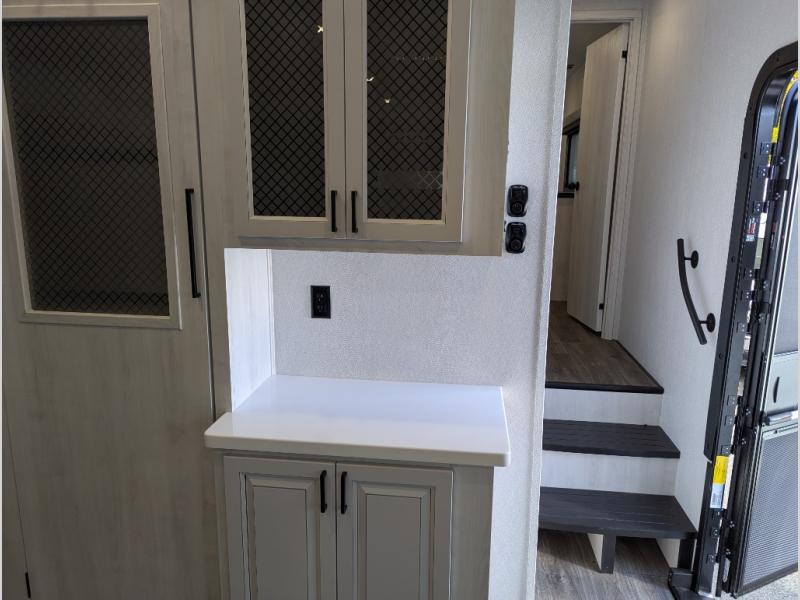 There is just too much luxury to name on the EAST TO WEST Ahara fifth wheel! These units are quite impressive, and once you see them, you'll know what we mean. The Ahara first grabs your attention with its fully painted aerodynamic fiberglass front cap, 102" wide-body chassis, and deep tint square frameless windows. For towing, you'll find a MORryde CRE 3000 suspension, LED marker lights, LED taillights with back-up lights, and rear view camera prep. Traveling in different climates is also made easy with the high-efficiency triple A/C system, 40,000 BTU high-capacity furnace, plus heated, insulated, and enclosed underbelly found within the Climate Package. Head inside to enjoy Slow Rise roller shades, a flush floor kitchen slide to help prevent trips, and solid surface countertops in the kitchen and bath to name a few luxuries!
