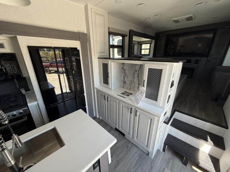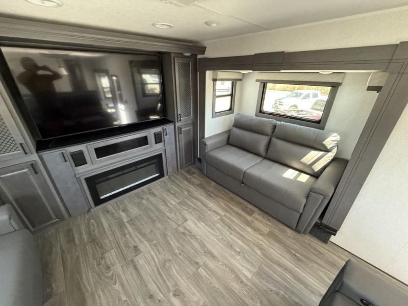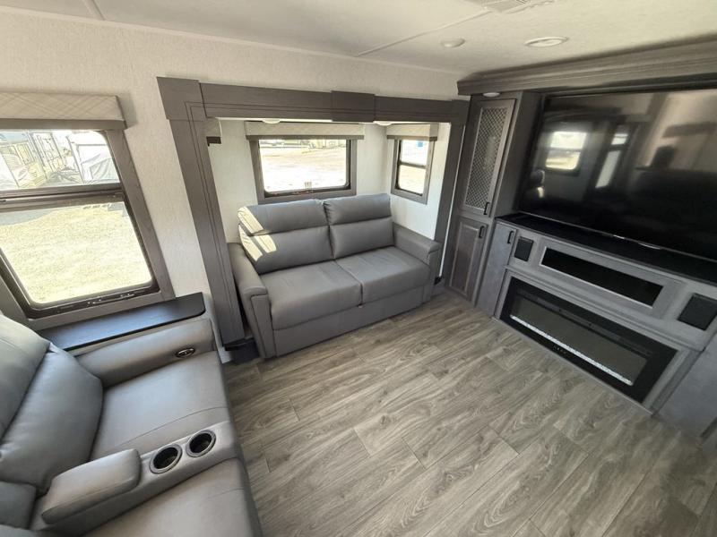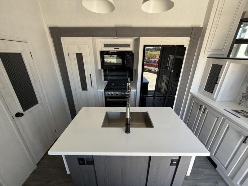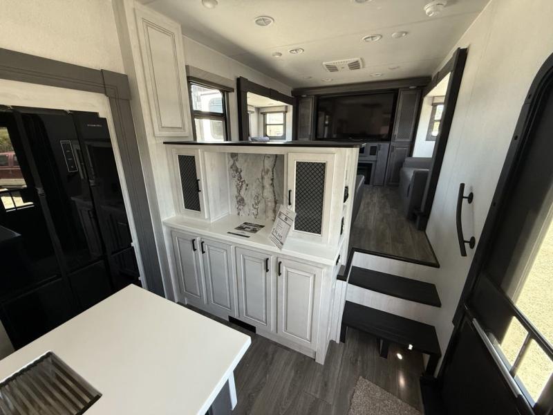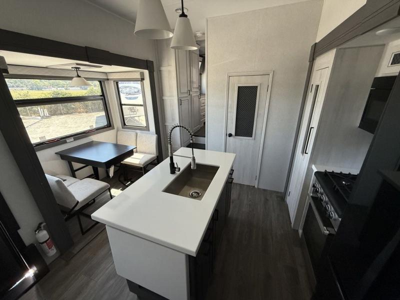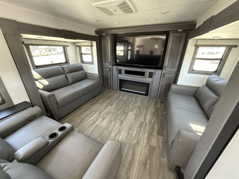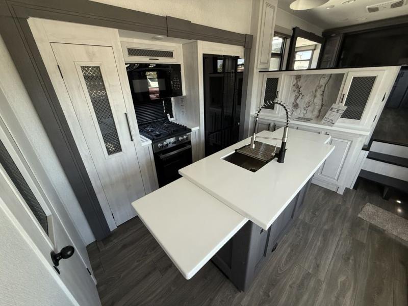 If you've been looking for a luxury fifth wheel to call your new home away from home, take a look at this Ahara! The front living area will be a favorite hangout spot with its dual hide-a-bed sofas, theater seating, and 65" TV with a fireplace. And since there are dual opposing slides here, your guests will have plenty of space to fold down the sofas at night for a great night's rest. If you're looking for your bedroom, head to the back and you'll enjoy a king bed slide out, a dresser, two closets, plus your own full rear bath. The dual bath sinks are sure to come in handy when you're both getting ready for bed, and the spacious shower with a skylight will provide natural light as you clean up in the morning. There is even a closet with washer and dryer prep if you plan to go full-time. In the morning you can prepare breakfast on the four burner cooktop or in the 30" over-the-range residential microwave, and the 16 cu. ft. 12V French door refrigerator includes a double drawer freezer to hold more food. There is a free-standing dinette, a hutch to store nice dishes, and a half bath located off of this room for convenience!