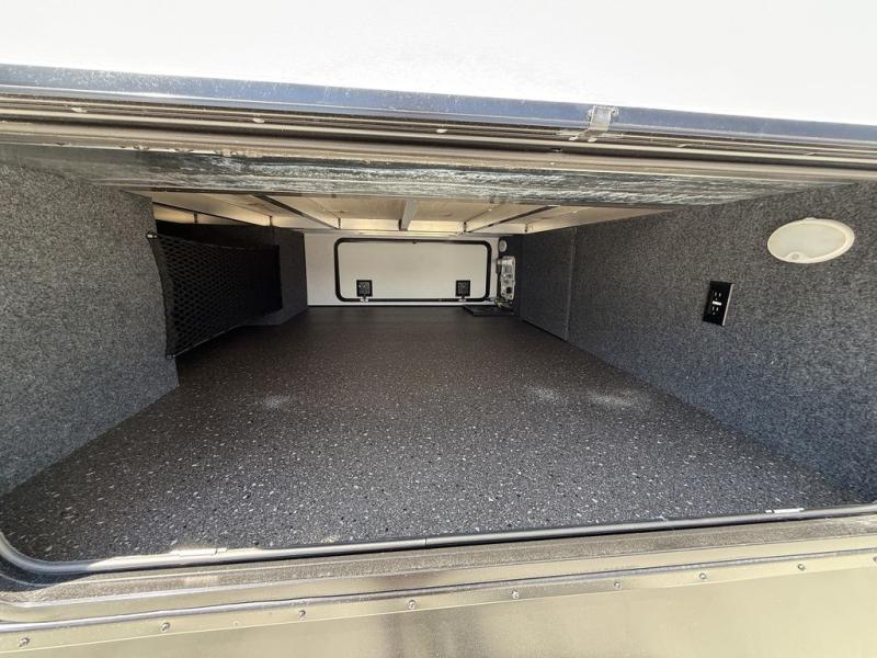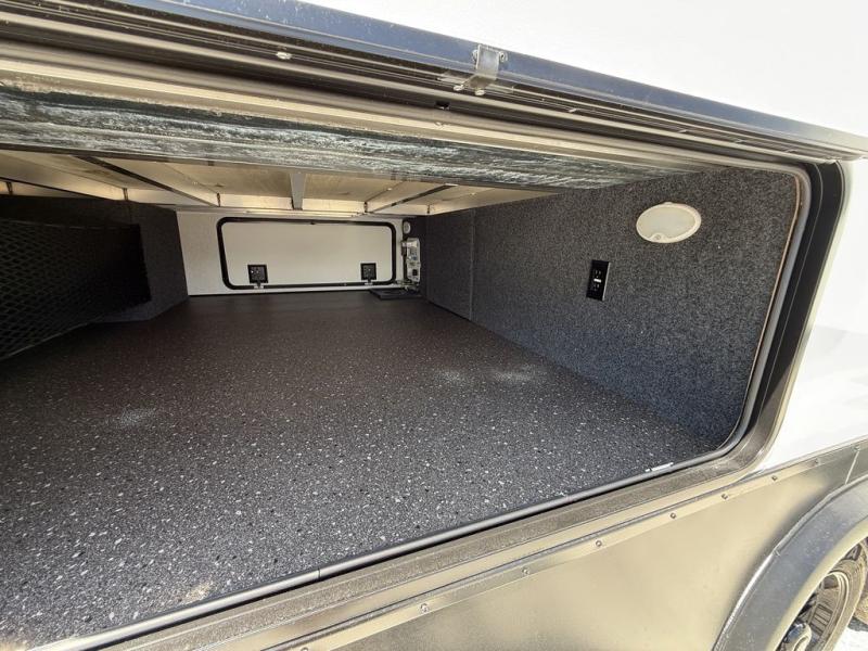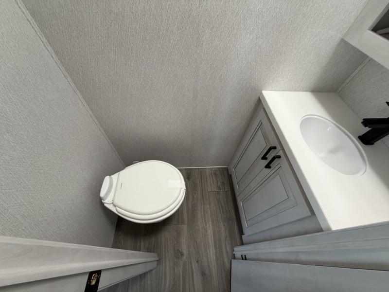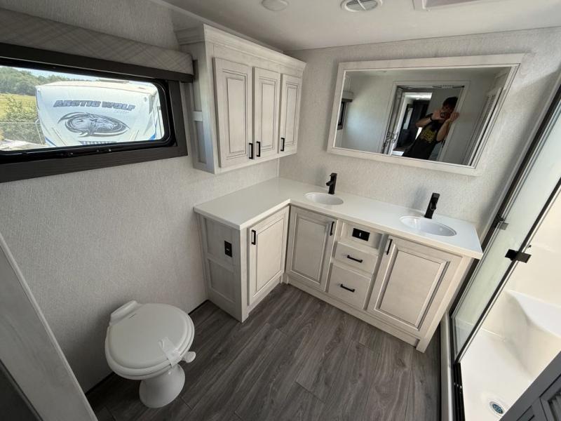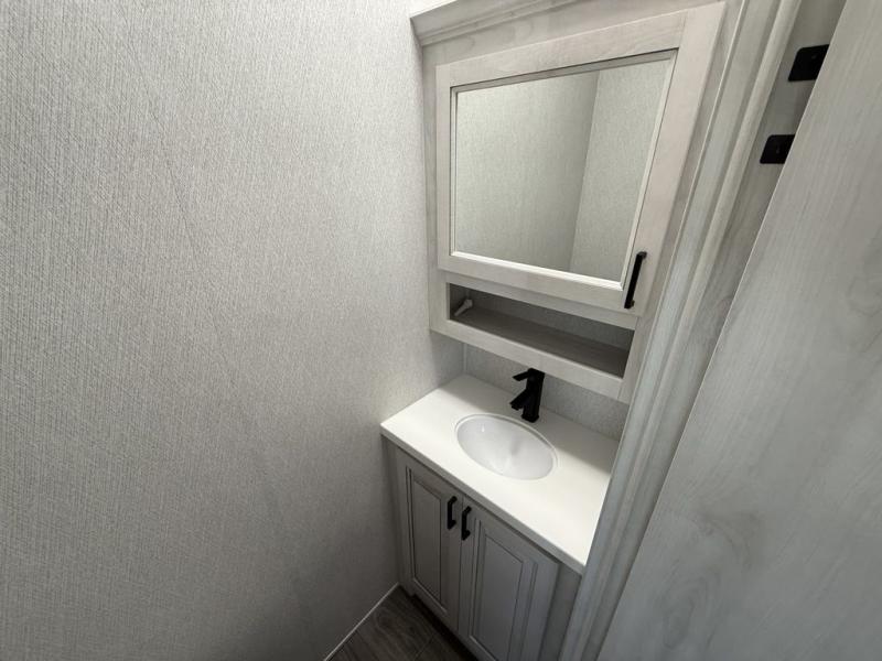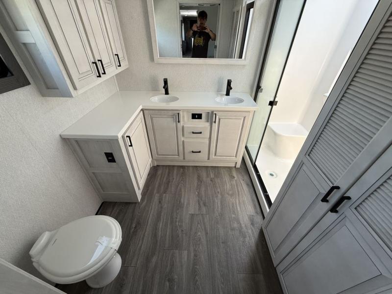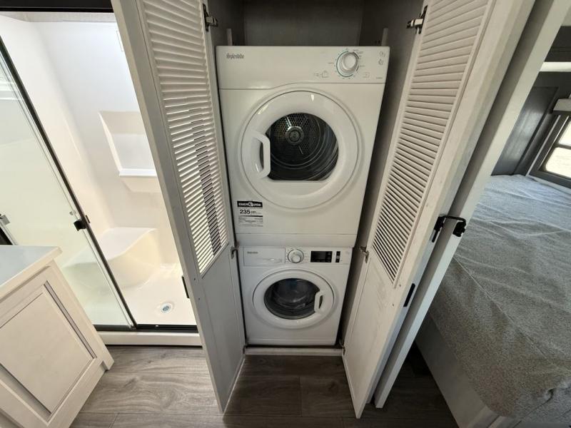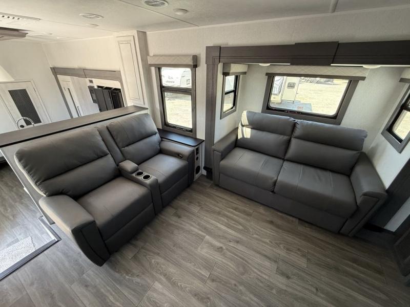 If you've been looking for a luxury fifth wheel to call your new home away from home, take a look at this Ahara! The front living area will be a favorite hangout spot with its dual hide-a-bed sofas, theater seating, and 65" TV with a fireplace. And since there are dual opposing slides here, your guests will have plenty of space to fold down the sofas at night for a great night's rest. If you're looking for your bedroom, head to the back and you'll enjoy a king bed slide out, a dresser, two closets, plus your own full rear bath. The dual bath sinks are sure to come in handy when you're both getting ready for bed, and the spacious shower with a skylight will provide natural light as you clean up in the morning. There is even a closet with washer and dryer prep if you plan to go full-time. In the morning you can prepare breakfast on the four burner cooktop or in the 30" over-the-range residential microwave, and the 16 cu. ft. 12V French door refrigerator includes a double drawer freezer to hold more food. There is a free-standing dinette, a hutch to store nice dishes, and a half bath located off of this room for convenience!