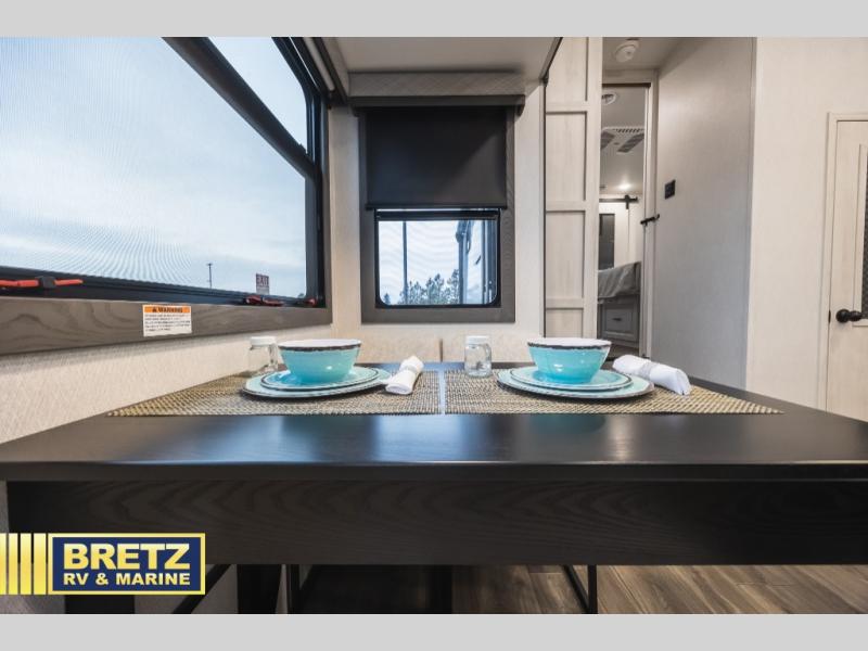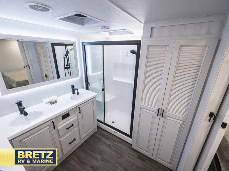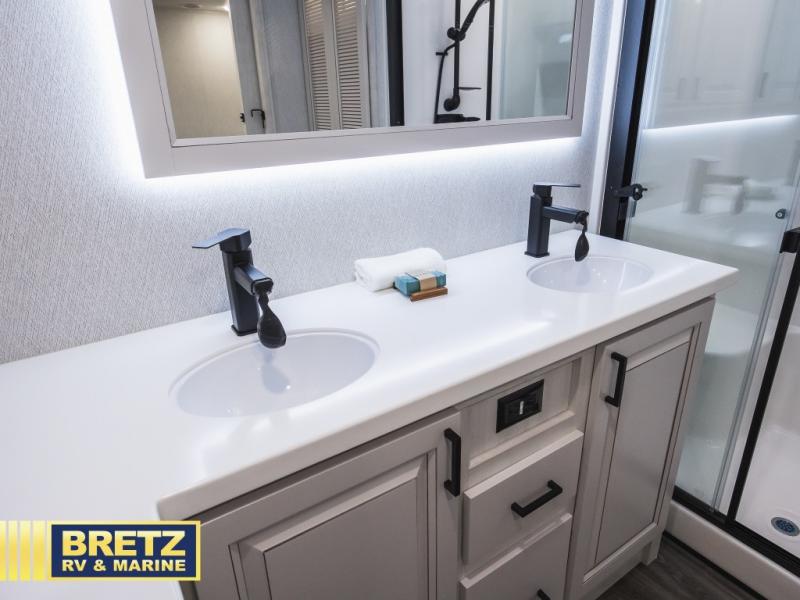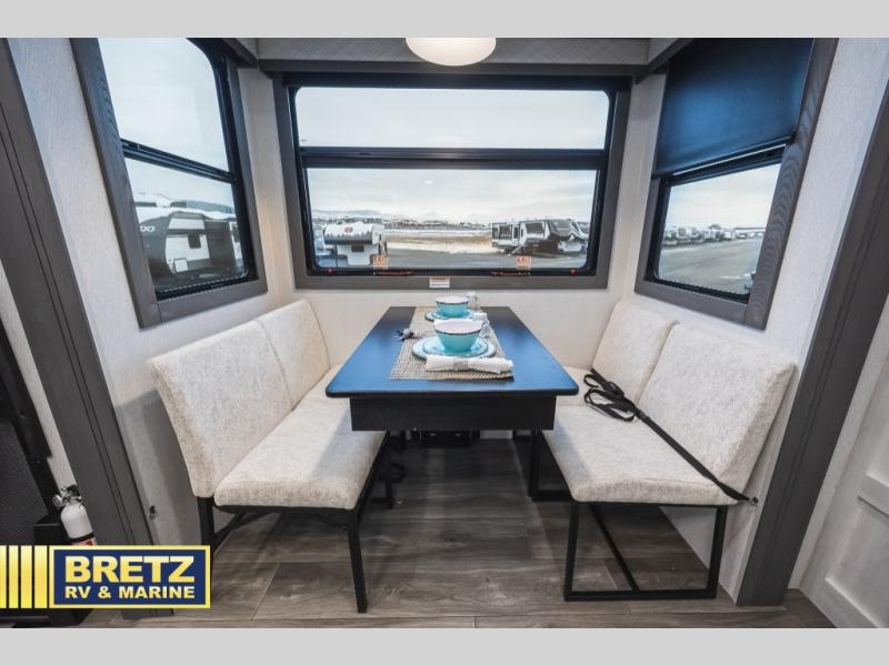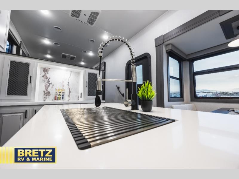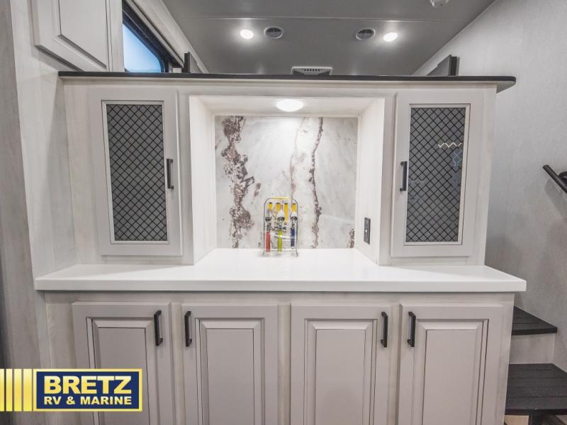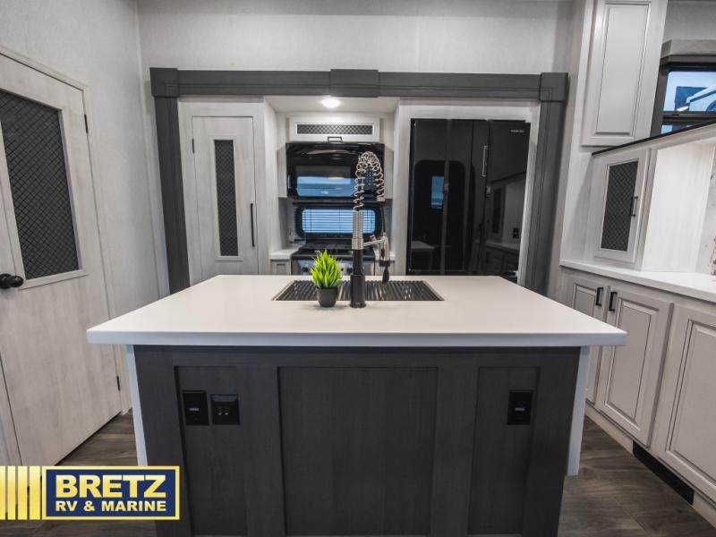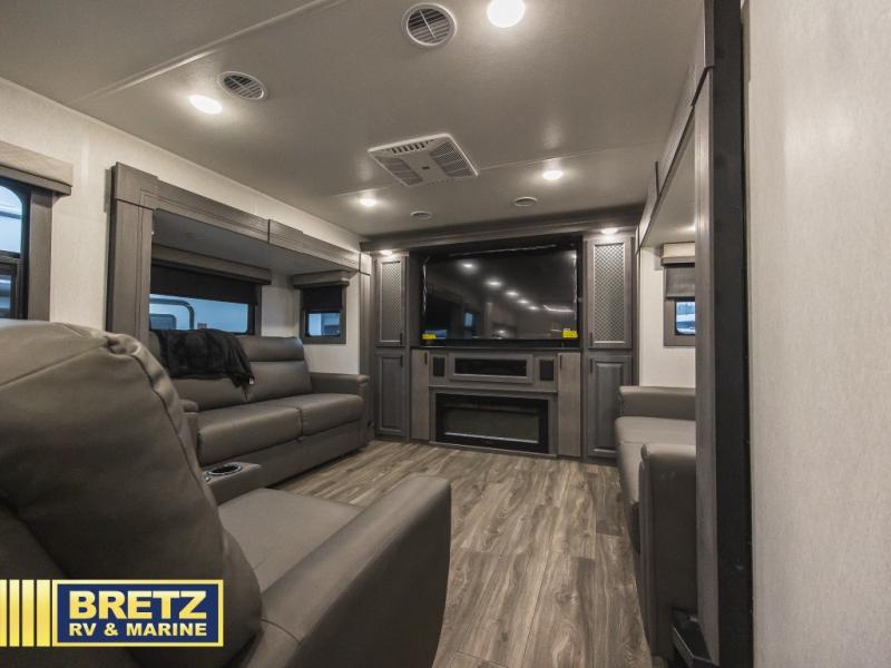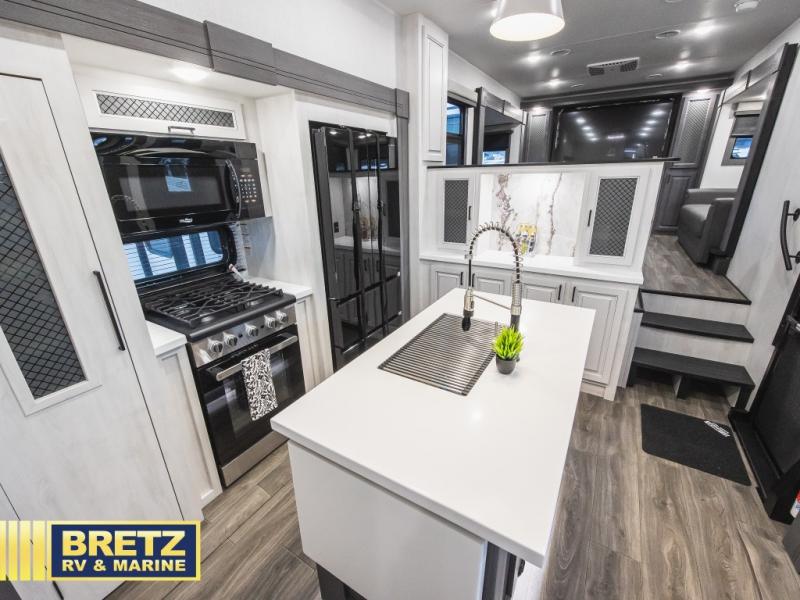 If you've been looking for a luxury fifth wheel to call your new home away from home, take a look at this Ahara! The front living area will be a favorite hangout spot with its dual hide-a-bed sofas, theater seating, and 65" TV with a fireplace. And since there are dual opposing slides here, your guests will have plenty of space to fold down the sofas at night for a great night's rest. If you're looking for your bedroom, head to the back and you'll enjoy a king bed slide out, a dresser, two closets, plus your own full rear bath. The dual bath sinks are sure to come in handy when you're both getting ready for bed, and the spacious shower with a skylight will provide natural light as you clean up in the morning. There is even a closet with washer and dryer prep if you plan to go full-time. In the morning you can prepare breakfast on the four burner cooktop or in the 30" over-the-range residential microwave, and the 16 cu. ft. 12V French door refrigerator includes a double drawer freezer to hold more food. There is a free-standing dinette, a hutch to store nice dishes, and a half bath located off of this room for convenience!