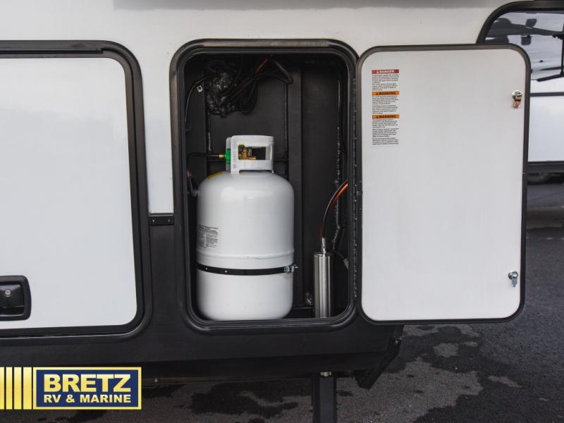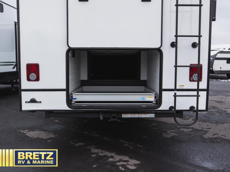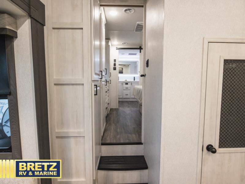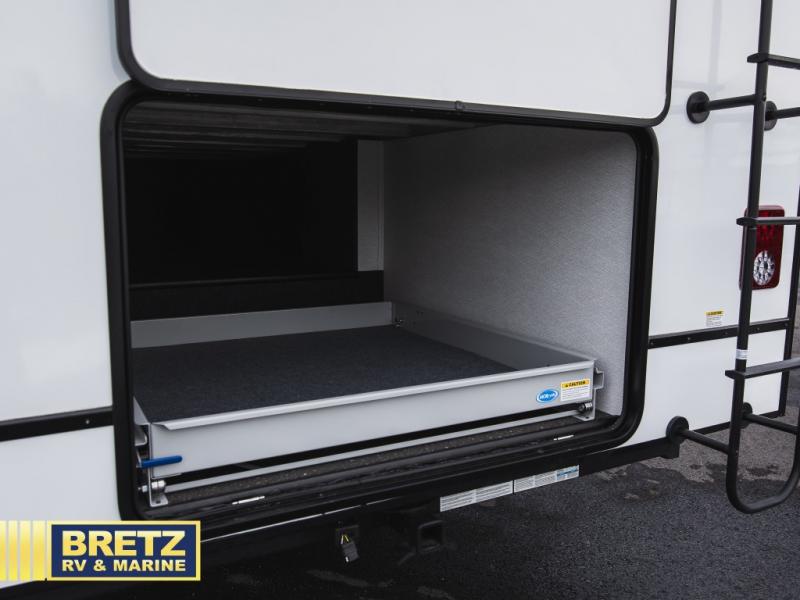 There is just too much luxury to name on the EAST TO WEST Ahara fifth wheel! These units are quite impressive, and once you see them, you'll know what we mean. The Ahara first grabs your attention with its fully painted aerodynamic fiberglass front cap, 102" wide-body chassis, and deep tint square frameless windows. For towing, you'll find a MORryde CRE 3000 suspension, LED marker lights, LED taillights with back-up lights, and rear view camera prep. Traveling in different climates is also made easy with the high-efficiency triple A/C system, 40,000 BTU high-capacity furnace, plus heated, insulated, and enclosed underbelly found within the Climate Package. Head inside to enjoy Slow Rise roller shades, a flush floor kitchen slide to help prevent trips, and solid surface countertops in the kitchen and bath to name a few luxuries!
