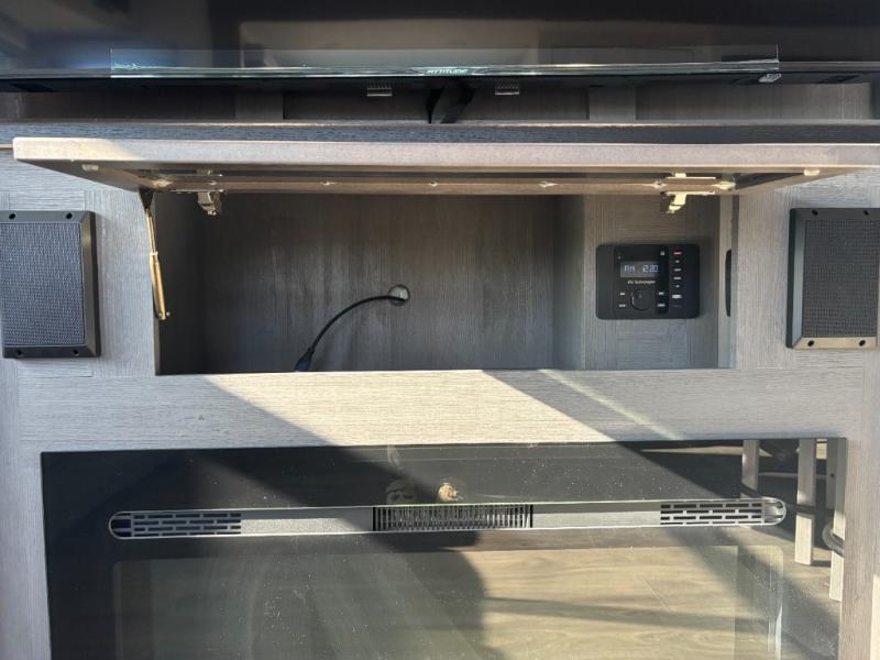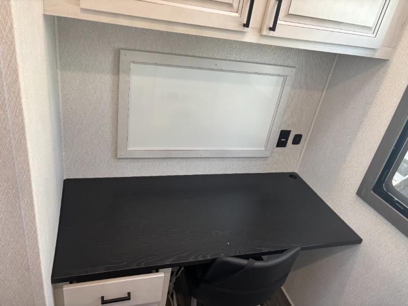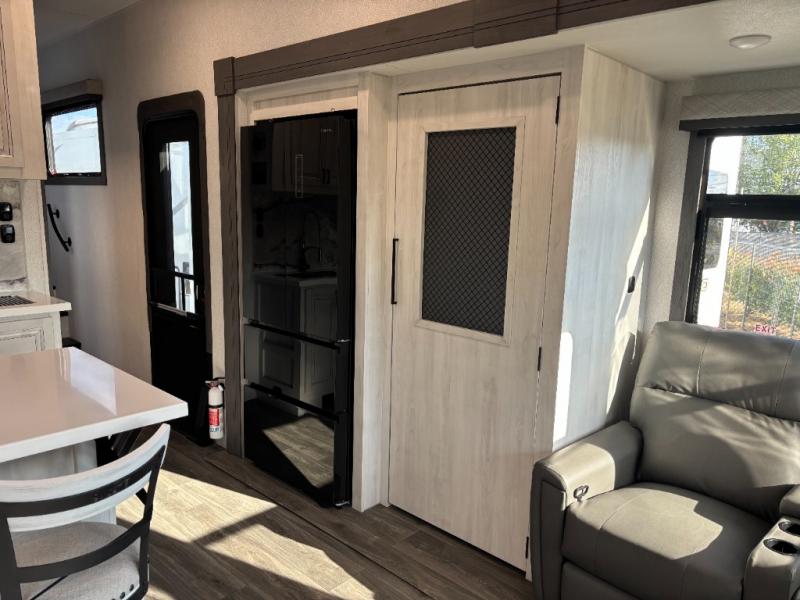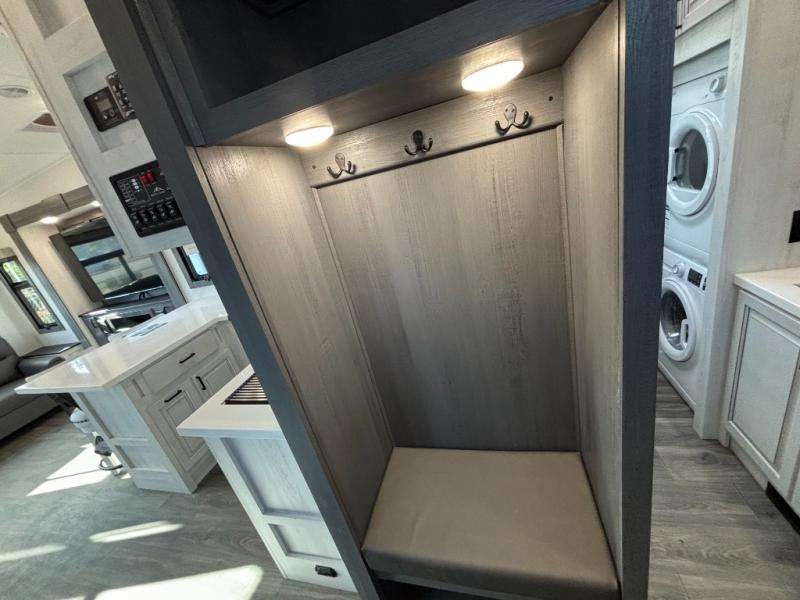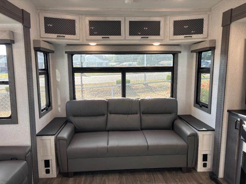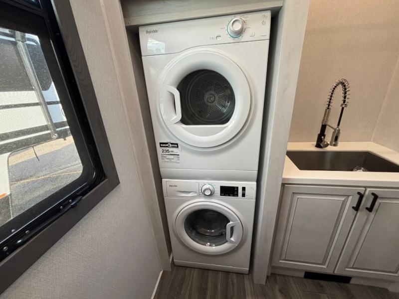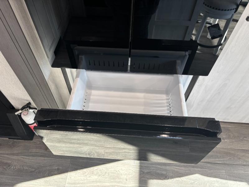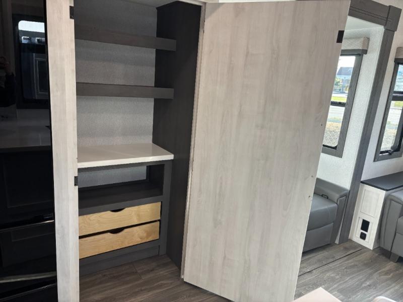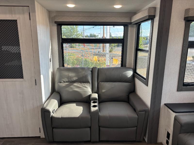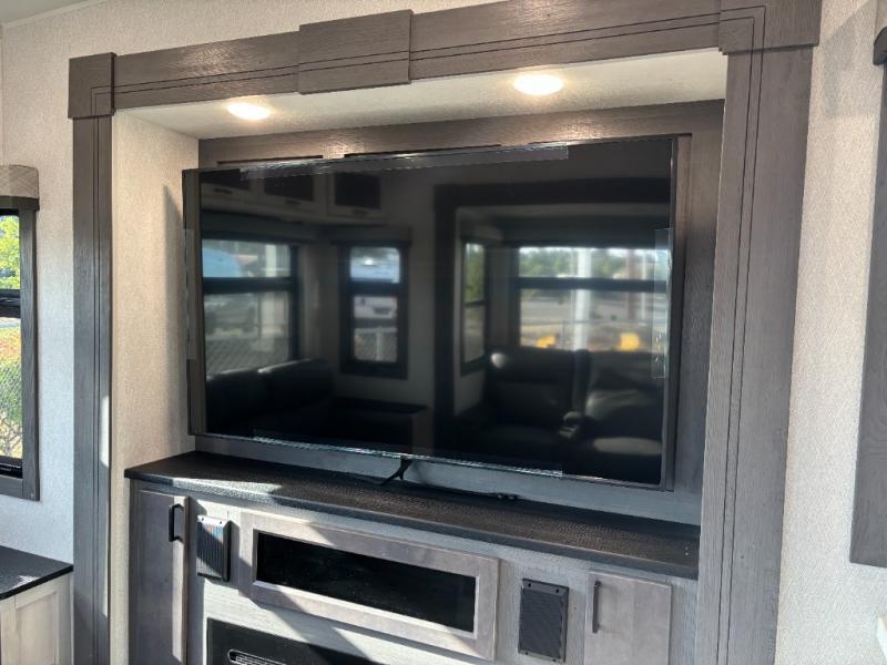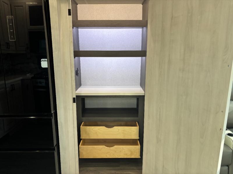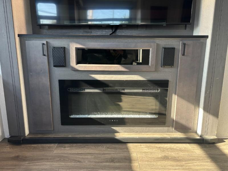 Head to the lake in this spacious fifth wheel for four! You will love the front private bedroom with a king bed slide out, sliding dresser top with hidden storage, and front closet to keep your clothes organized. The full bath is right next to the bedroom for easy access at night, and you're going to love having the utility room in this unit. There is stackable washer and dryer prep, a desk or laundry table, plus a sink with a mirror, making this room multi-functional! A full kitchen includes a u-shaped counter, a four burner range and an over-the-range microwave, plus a 16 cu. ft. refrigerator and walk-in pantry with a coffee bar and shelves. There is also a breakfast bar with seating here where you can visit with the chef while dinner is being made. Last but not least, the rear living area will be a favorite place to hang out with theater seating, a rear 78" EZ out sofa, and a TV with a fireplace!