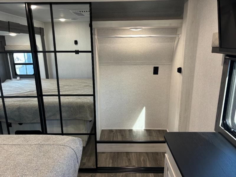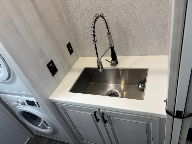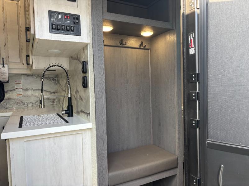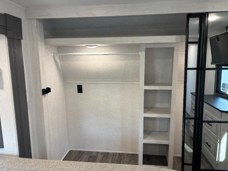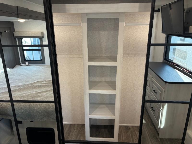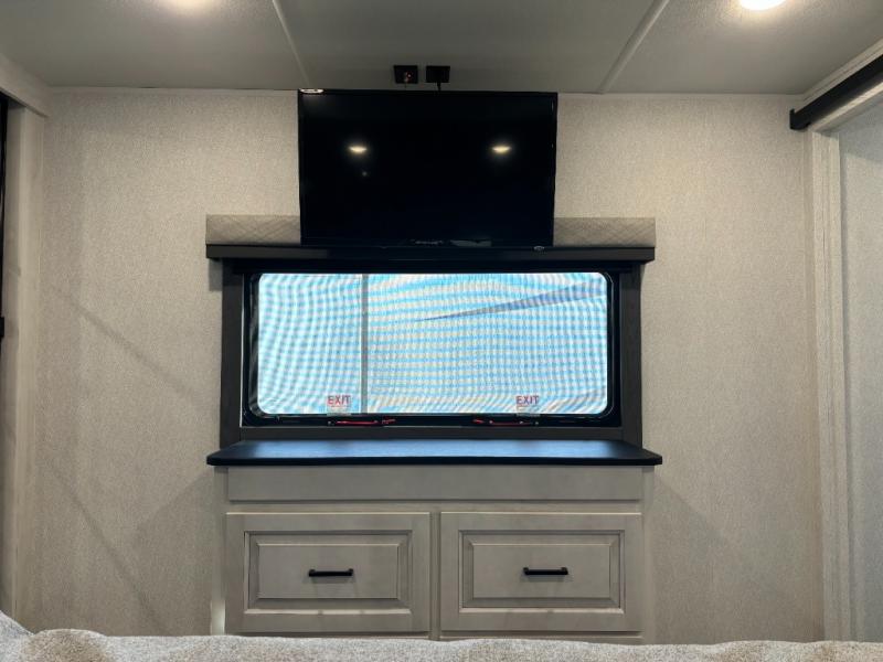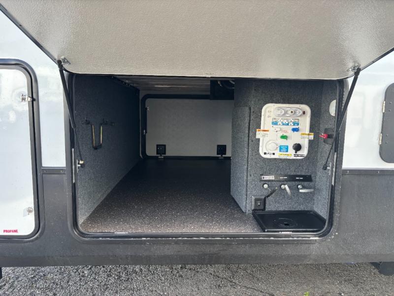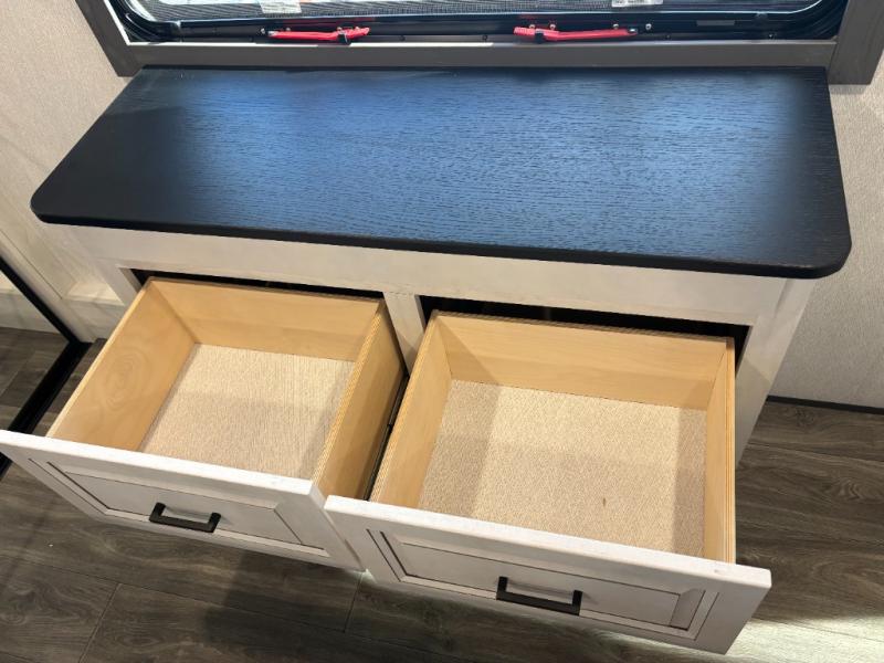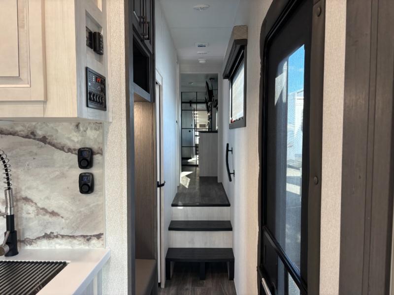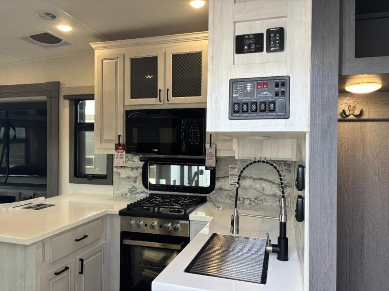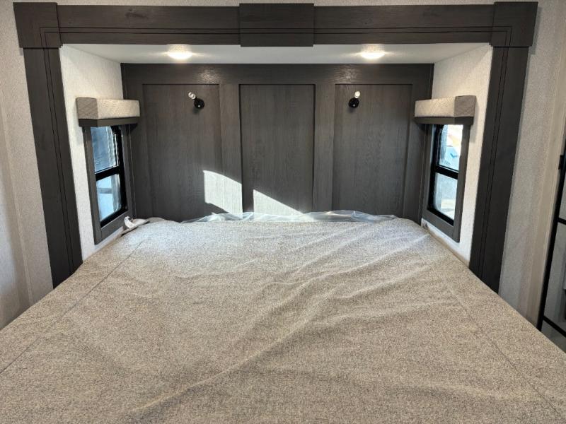 Head to the lake in this spacious fifth wheel for four! You will love the front private bedroom with a king bed slide out, sliding dresser top with hidden storage, and front closet to keep your clothes organized. The full bath is right next to the bedroom for easy access at night, and you're going to love having the utility room in this unit. There is stackable washer and dryer prep, a desk or laundry table, plus a sink with a mirror, making this room multi-functional! A full kitchen includes a u-shaped counter, a four burner range and an over-the-range microwave, plus a 16 cu. ft. refrigerator and walk-in pantry with a coffee bar and shelves. There is also a breakfast bar with seating here where you can visit with the chef while dinner is being made. Last but not least, the rear living area will be a favorite place to hang out with theater seating, a rear 78" EZ out sofa, and a TV with a fireplace!