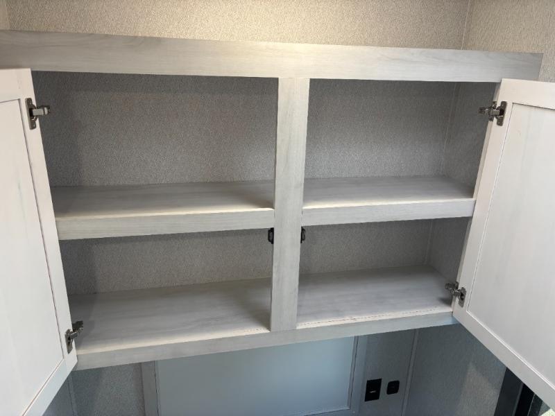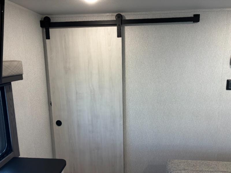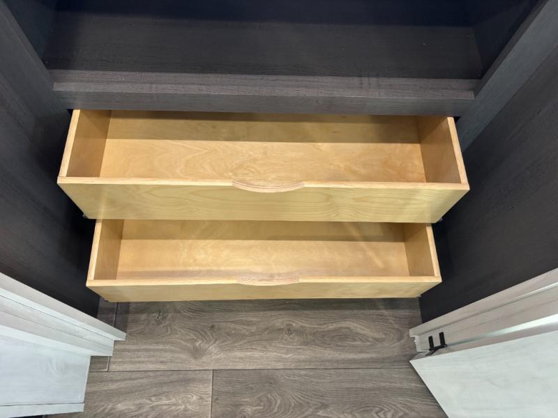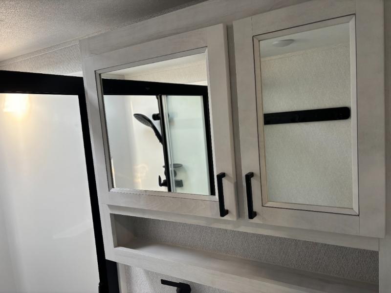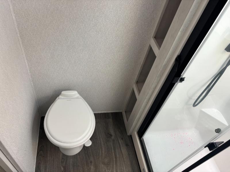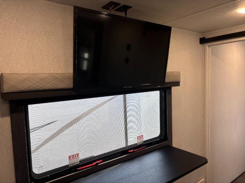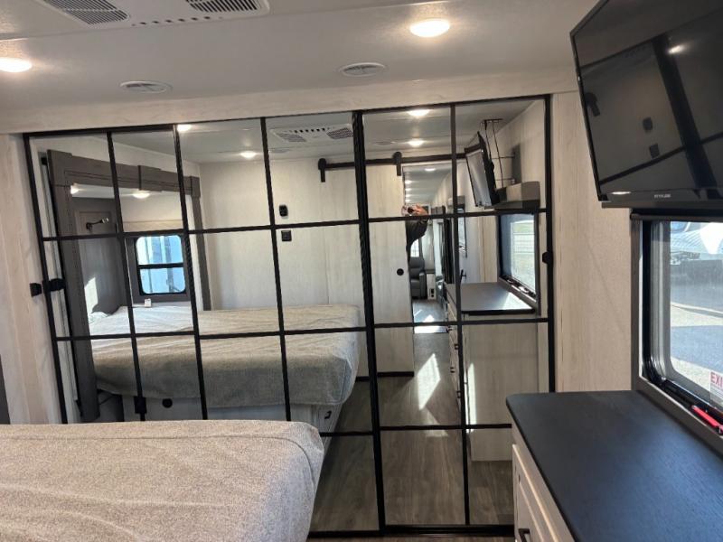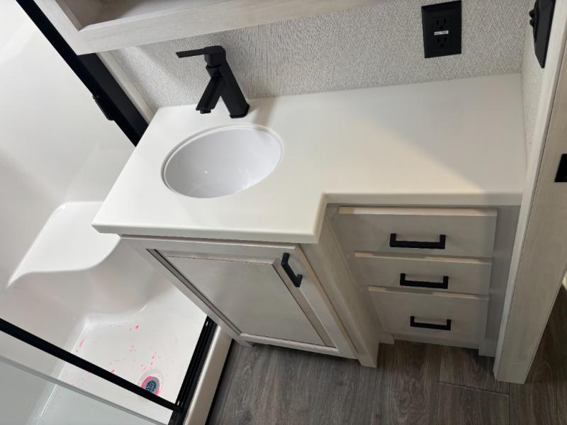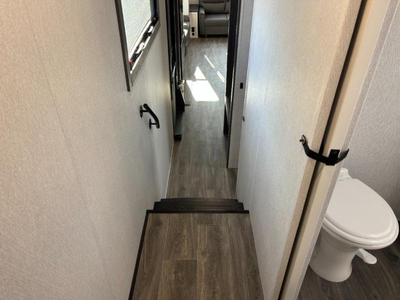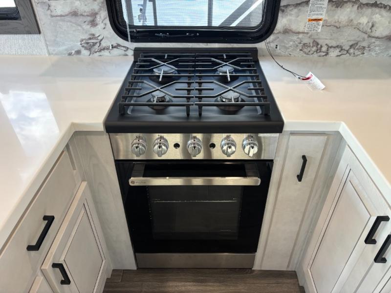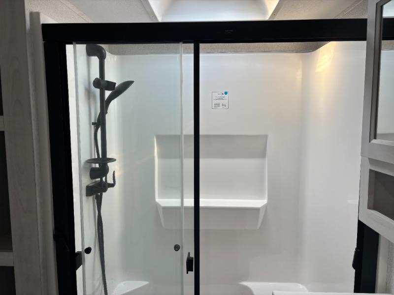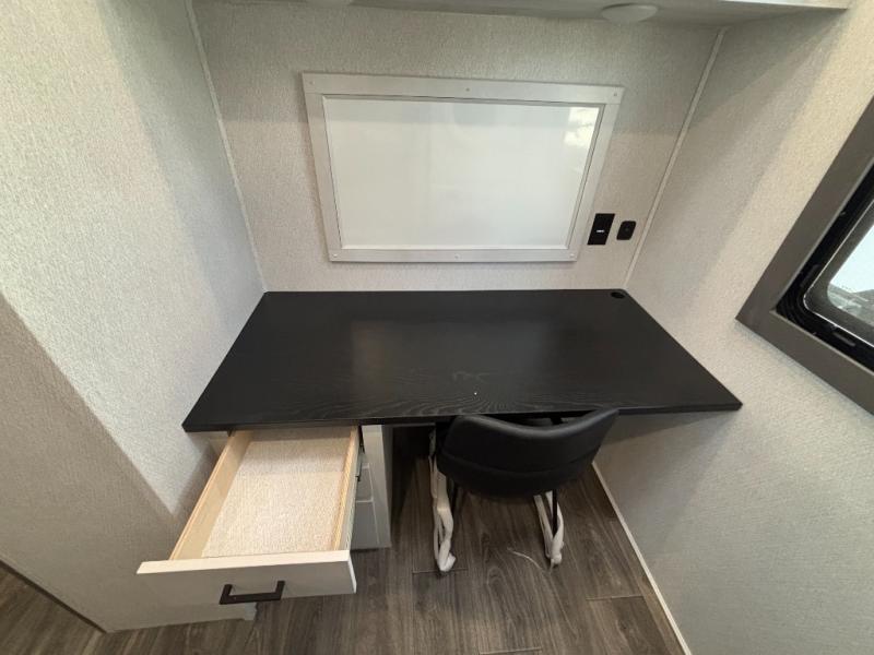Head to the lake in this spacious fifth wheel for four! You will love the front private bedroom with a king bed slide out, sliding dresser top with hidden storage, and front closet to keep your clothes organized. The full bath is right next to the bedroom for easy access at night, and you're going to love having the utility room in this unit. There is stackable washer and dryer prep, a desk or laundry table, plus a sink with a mirror, making this room multi-functional! A full kitchen includes a u-shaped counter, a four burner range and an over-the-range microwave, plus a 16 cu. ft. refrigerator and walk-in pantry with a coffee bar and shelves. There is also a breakfast bar with seating here where you can visit with the chef while dinner is being made. Last but not least, the rear living area will be a favorite place to hang out with theater seating, a rear 78" EZ out sofa, and a TV with a fireplace!