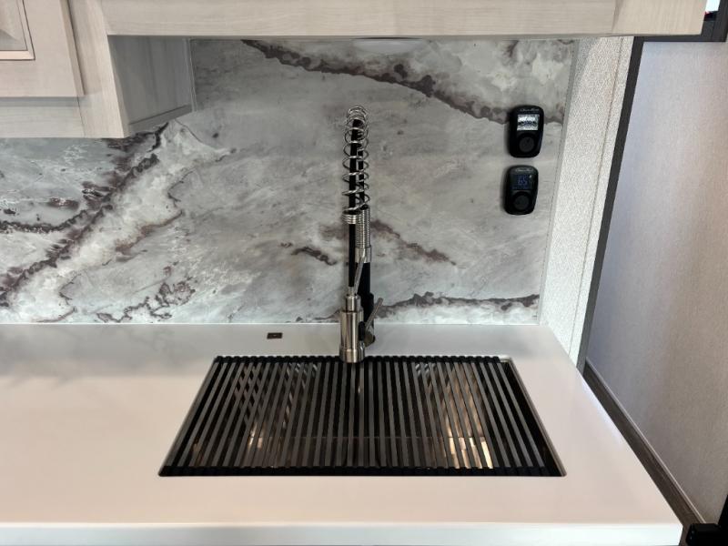 There is just too much luxury to name on the EAST TO WEST Ahara fifth wheel! These units are quite impressive, and once you see them, you'll know what we mean. The Ahara first grabs your attention with its fully painted aerodynamic fiberglass front cap, 102" wide-body chassis, and deep tint square frameless windows. For towing, you'll find a MORryde CRE 3000 suspension, LED marker lights, LED taillights with back-up lights, and rear view camera prep. Traveling in different climates is also made easy with the high-efficiency triple A/C system, 40,000 BTU high-capacity furnace, plus heated, insulated, and enclosed underbelly found within the Climate Package. Head inside to enjoy Slow Rise roller shades, a flush floor kitchen slide to help prevent trips, and solid surface countertops in the kitchen and bath to name a few luxuries!
