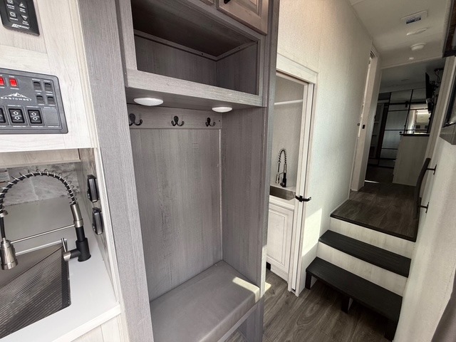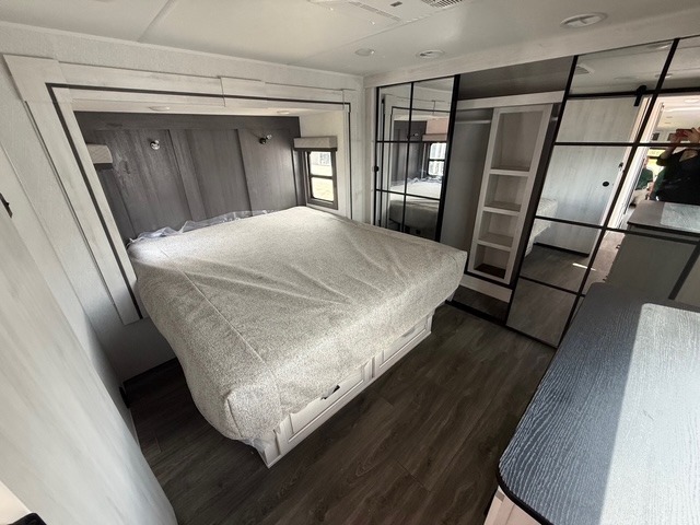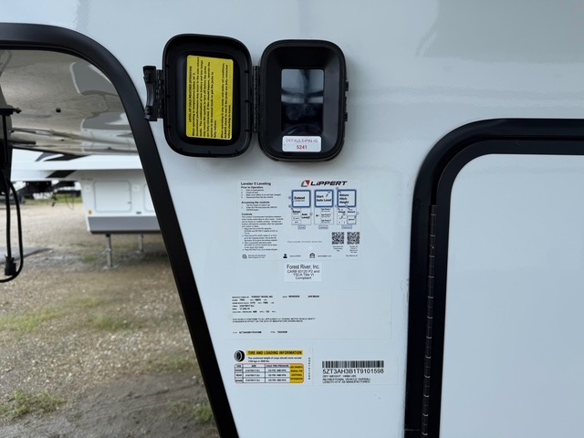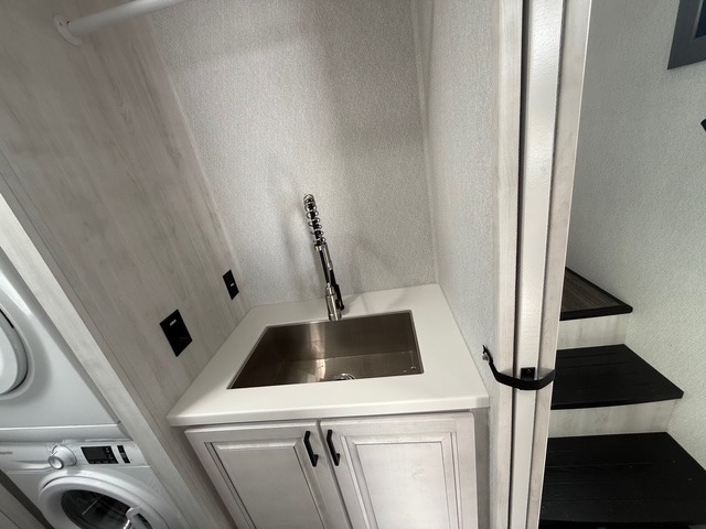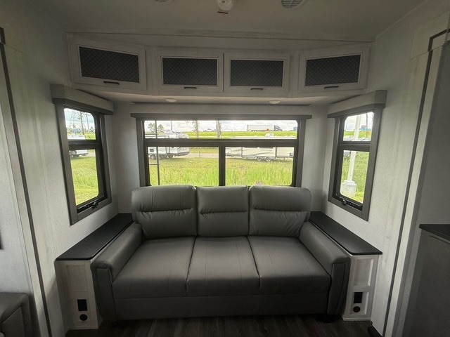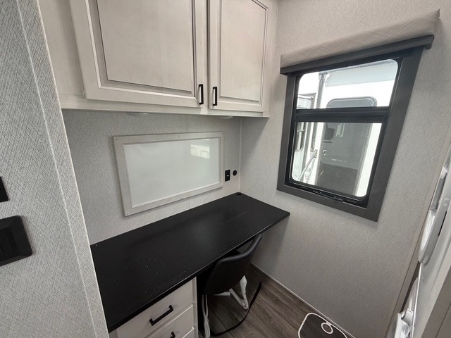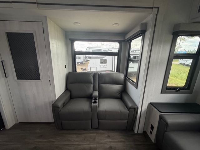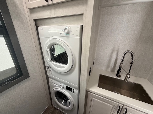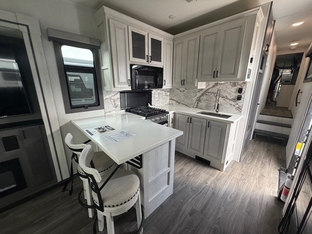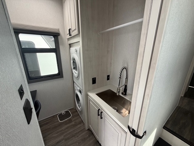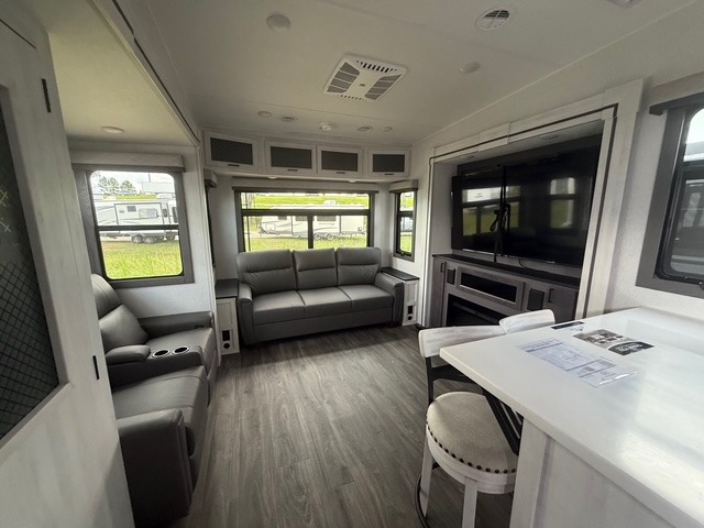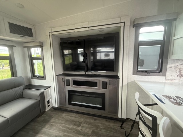 Head to the lake in this spacious fifth wheel for four! You will love the front private bedroom with a king bed slide out, sliding dresser top with hidden storage, and front closet to keep your clothes organized. The full bath is right next to the bedroom for easy access at night, and you're going to love having the utility room in this unit. There is stackable washer and dryer prep, a desk or laundry table, plus a sink with a mirror, making this room multi-functional! A full kitchen includes a u-shaped counter, a four burner range and an over-the-range microwave, plus a 16 cu. ft. refrigerator and walk-in pantry with a coffee bar and shelves. There is also a breakfast bar with seating here where you can visit with the chef while dinner is being made. Last but not least, the rear living area will be a favorite place to hang out with theater seating, a rear 78" EZ out sofa, and a TV with a fireplace!