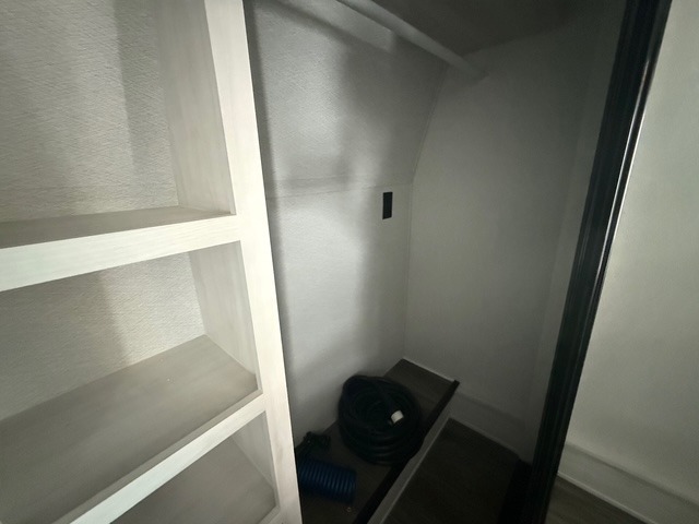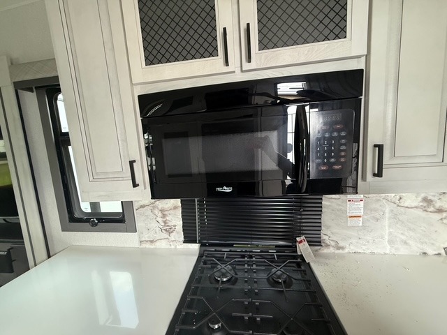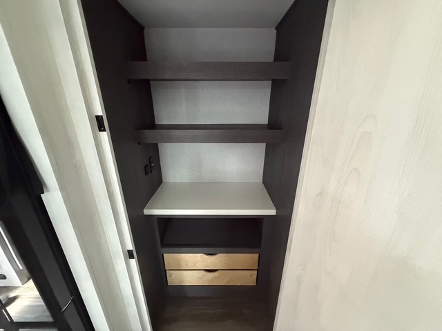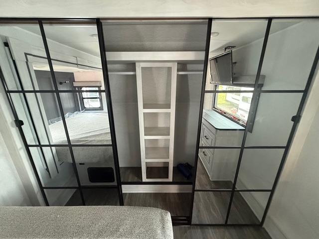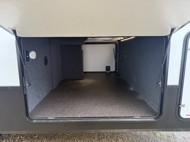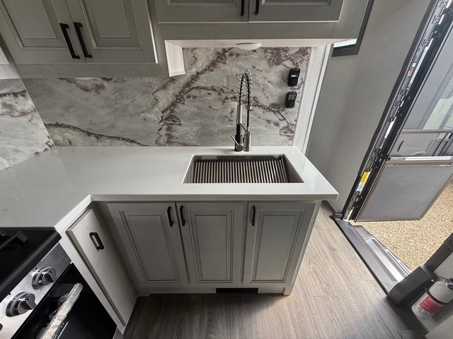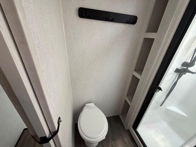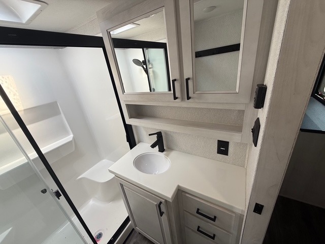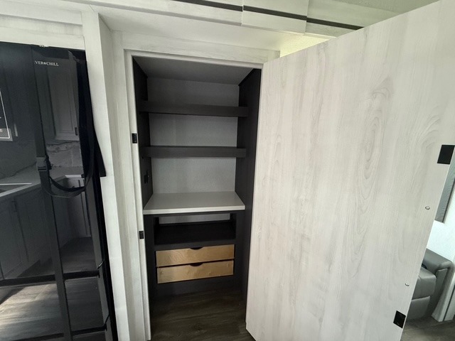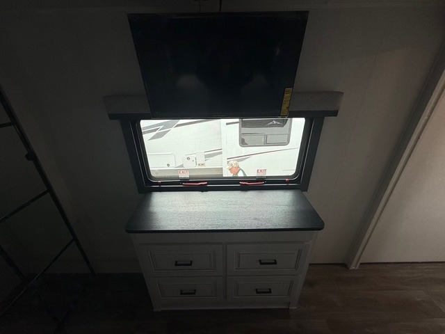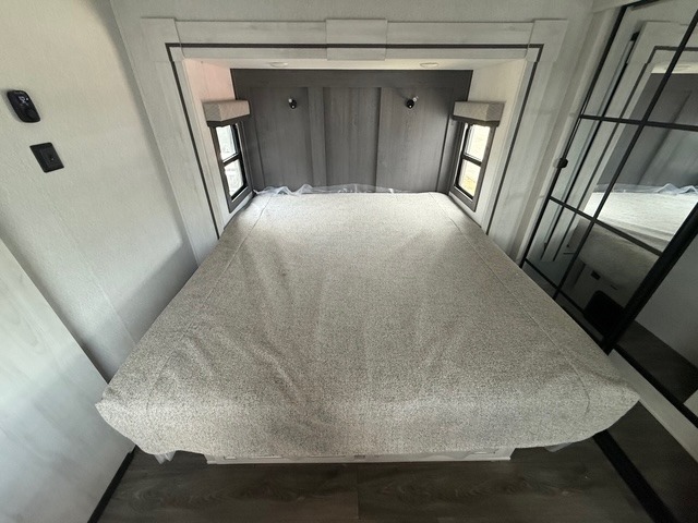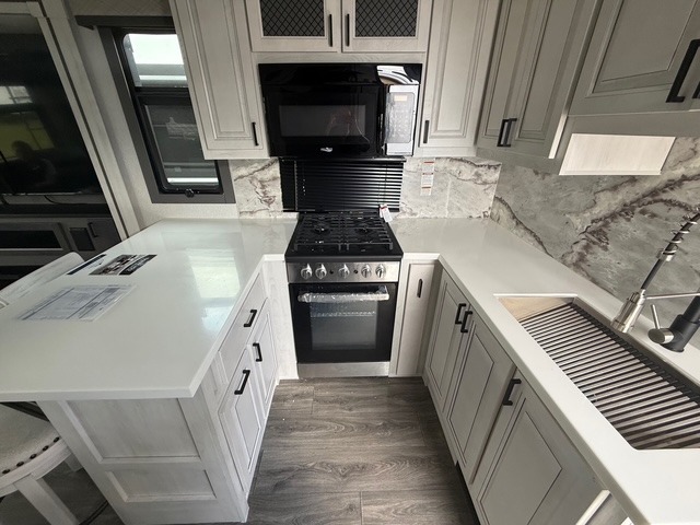 Head to the lake in this spacious fifth wheel for four! You will love the front private bedroom with a king bed slide out, sliding dresser top with hidden storage, and front closet to keep your clothes organized. The full bath is right next to the bedroom for easy access at night, and you're going to love having the utility room in this unit. There is stackable washer and dryer prep, a desk or laundry table, plus a sink with a mirror, making this room multi-functional! A full kitchen includes a u-shaped counter, a four burner range and an over-the-range microwave, plus a 16 cu. ft. refrigerator and walk-in pantry with a coffee bar and shelves. There is also a breakfast bar with seating here where you can visit with the chef while dinner is being made. Last but not least, the rear living area will be a favorite place to hang out with theater seating, a rear 78" EZ out sofa, and a TV with a fireplace!