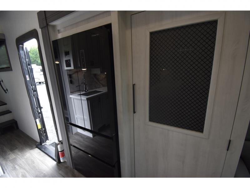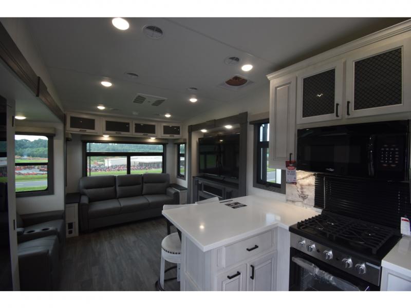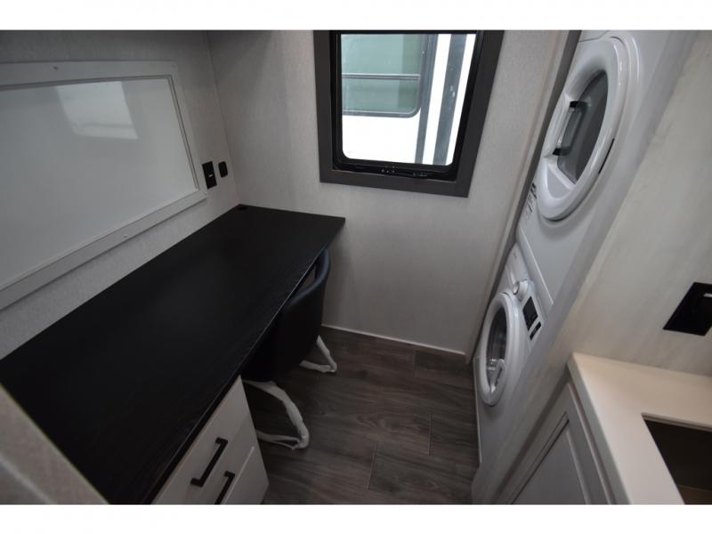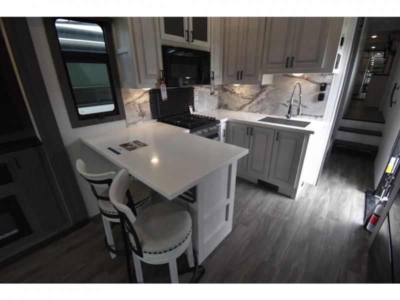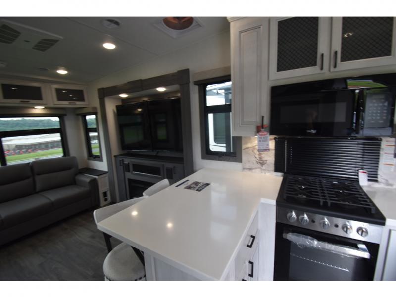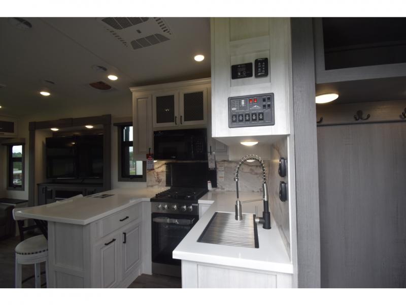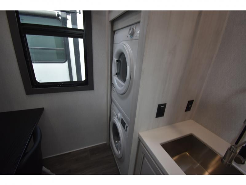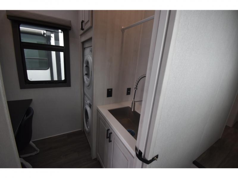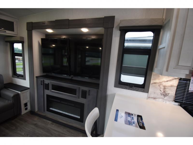 Head to the lake in this spacious fifth wheel for four! You will love the front private bedroom with a king bed slide out, sliding dresser top with hidden storage, and front closet to keep your clothes organized. The full bath is right next to the bedroom for easy access at night, and you're going to love having the utility room in this unit. There is stackable washer and dryer prep, a desk or laundry table, plus a sink with a mirror, making this room multi-functional! A full kitchen includes a u-shaped counter, a four burner range and an over-the-range microwave, plus a 16 cu. ft. refrigerator and walk-in pantry with a coffee bar and shelves. There is also a breakfast bar with seating here where you can visit with the chef while dinner is being made. Last but not least, the rear living area will be a favorite place to hang out with theater seating, a rear 78" EZ out sofa, and a TV with a fireplace!