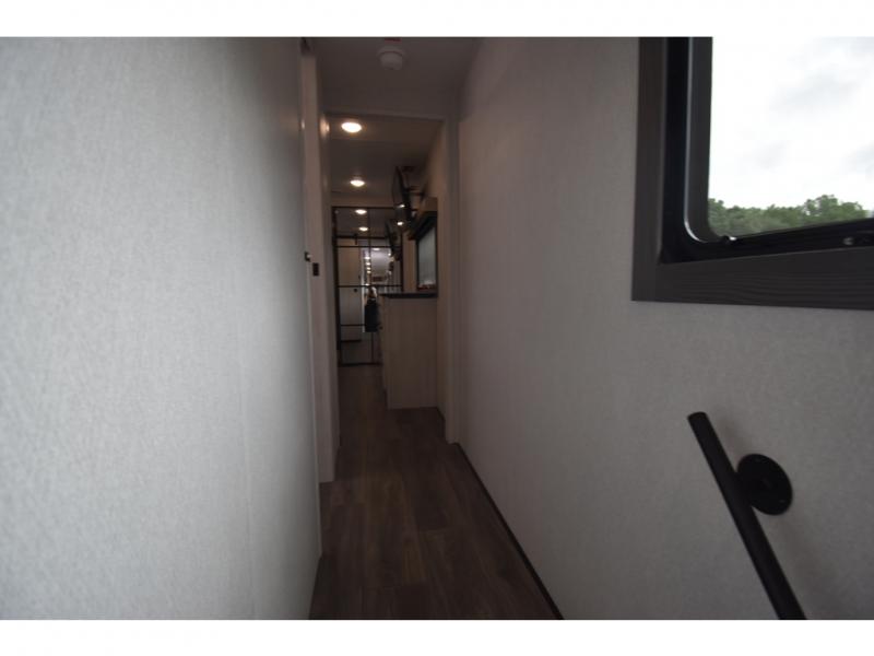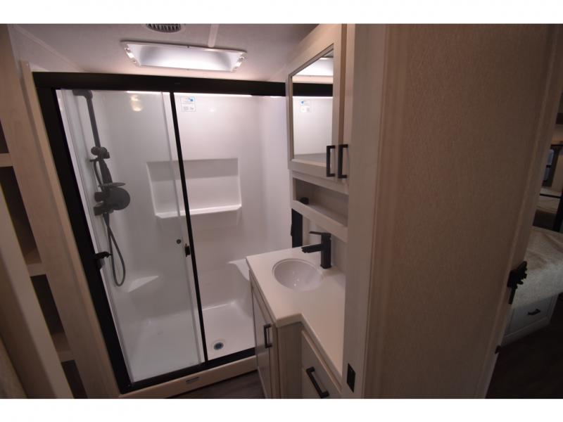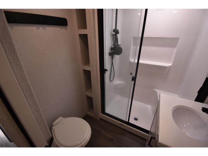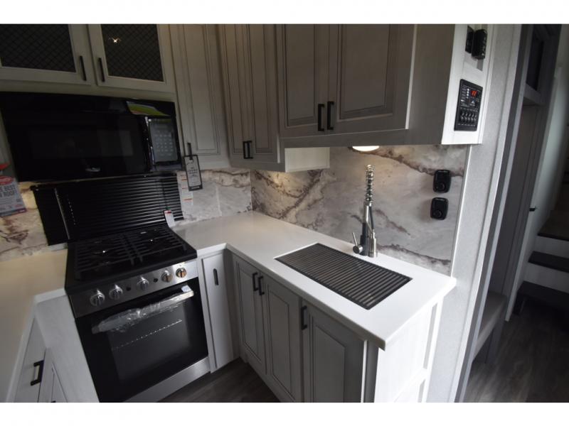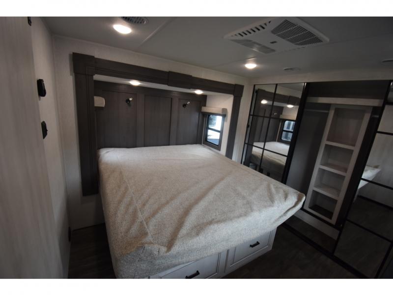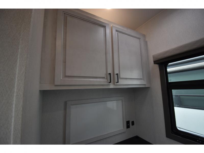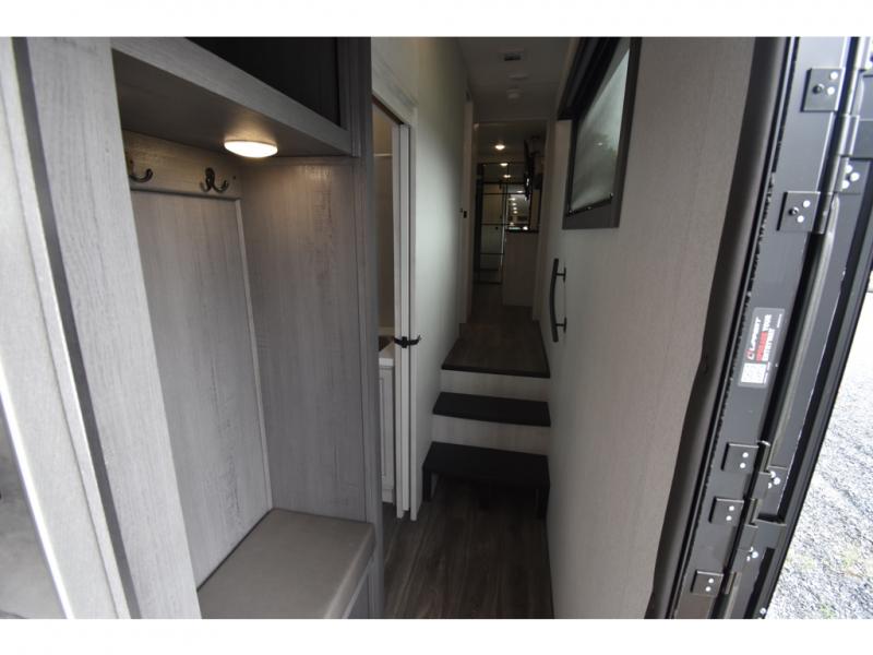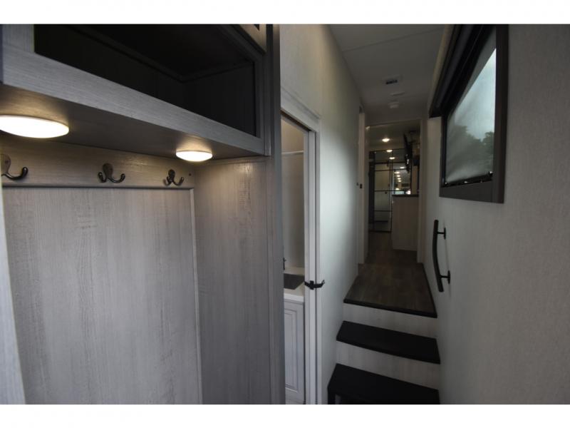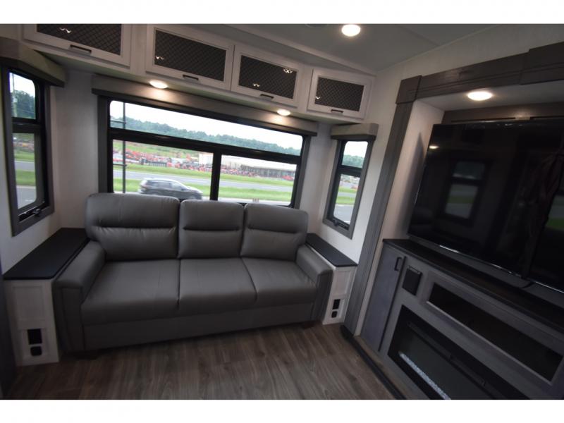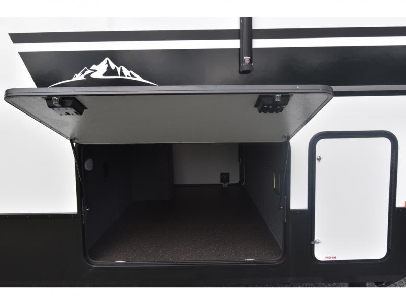 Head to the lake in this spacious fifth wheel for four! You will love the front private bedroom with a king bed slide out, sliding dresser top with hidden storage, and front closet to keep your clothes organized. The full bath is right next to the bedroom for easy access at night, and you're going to love having the utility room in this unit. There is stackable washer and dryer prep, a desk or laundry table, plus a sink with a mirror, making this room multi-functional! A full kitchen includes a u-shaped counter, a four burner range and an over-the-range microwave, plus a 16 cu. ft. refrigerator and walk-in pantry with a coffee bar and shelves. There is also a breakfast bar with seating here where you can visit with the chef while dinner is being made. Last but not least, the rear living area will be a favorite place to hang out with theater seating, a rear 78" EZ out sofa, and a TV with a fireplace!
