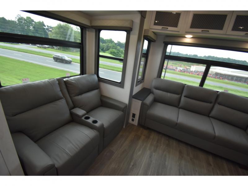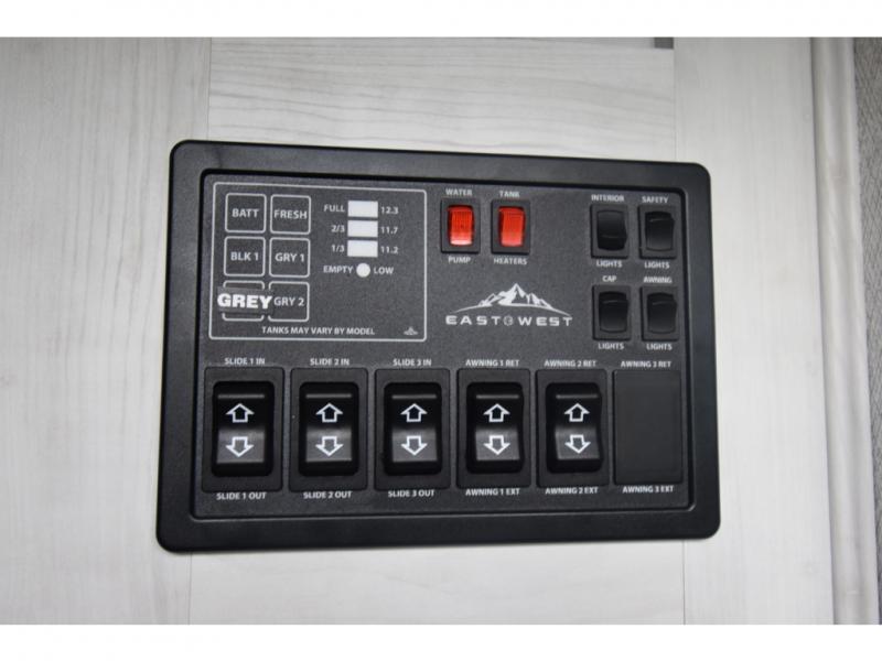 There is just too much luxury to name on the EAST TO WEST Ahara fifth wheel! These units are quite impressive, and once you see them, you'll know what we mean. The Ahara first grabs your attention with its fully painted aerodynamic fiberglass front cap, 102" wide-body chassis, and deep tint square frameless windows. For towing, you'll find a MORryde CRE 3000 suspension, LED marker lights, LED taillights with back-up lights, and rear view camera prep. Traveling in different climates is also made easy with the high-efficiency triple A/C system, 40,000 BTU high-capacity furnace, plus heated, insulated, and enclosed underbelly found within the Climate Package. Head inside to enjoy Slow Rise roller shades, a flush floor kitchen slide to help prevent trips, and solid surface countertops in the kitchen and bath to name a few luxuries!