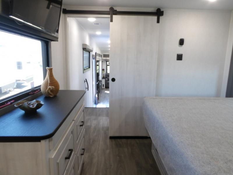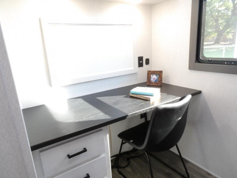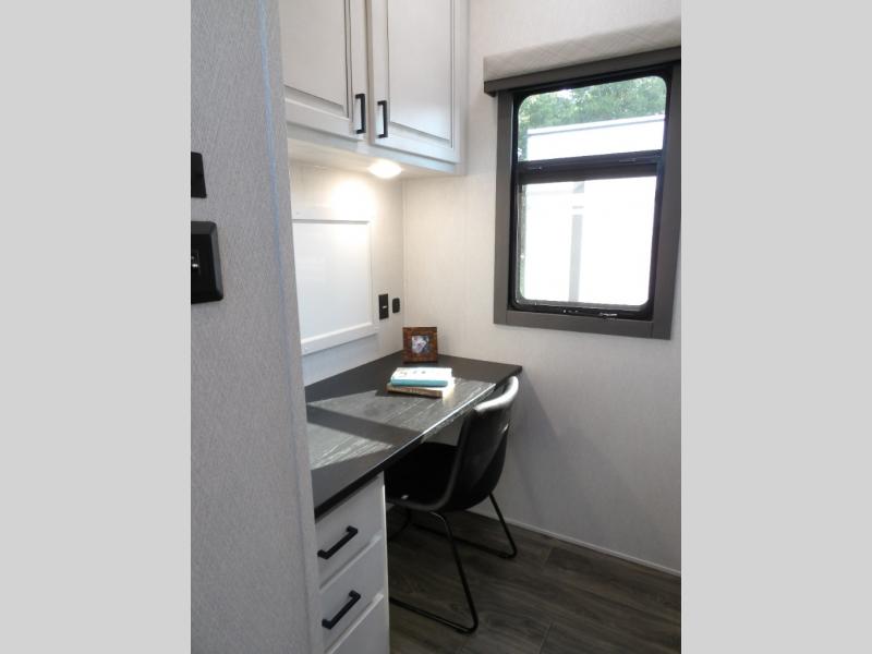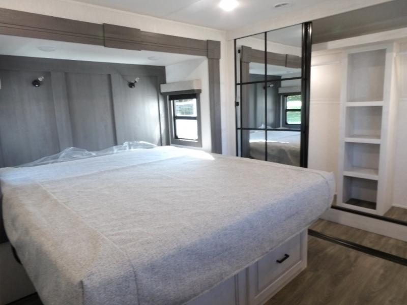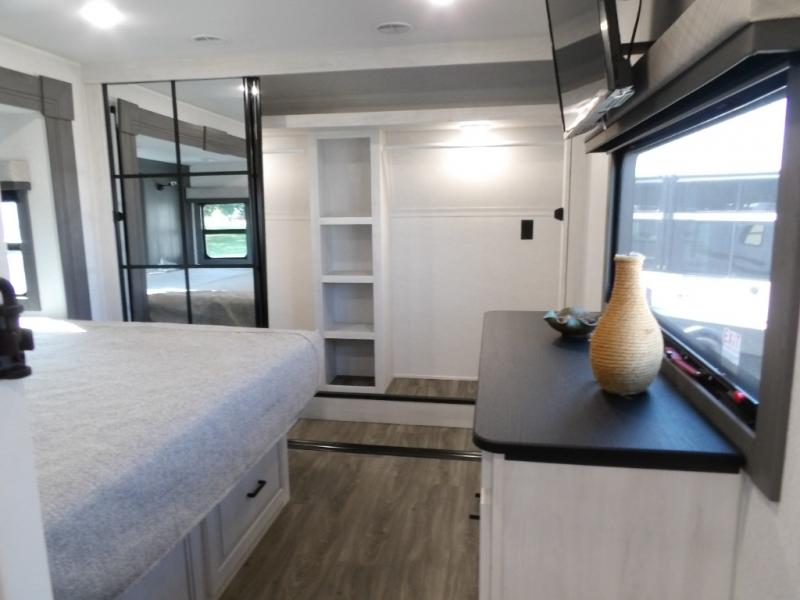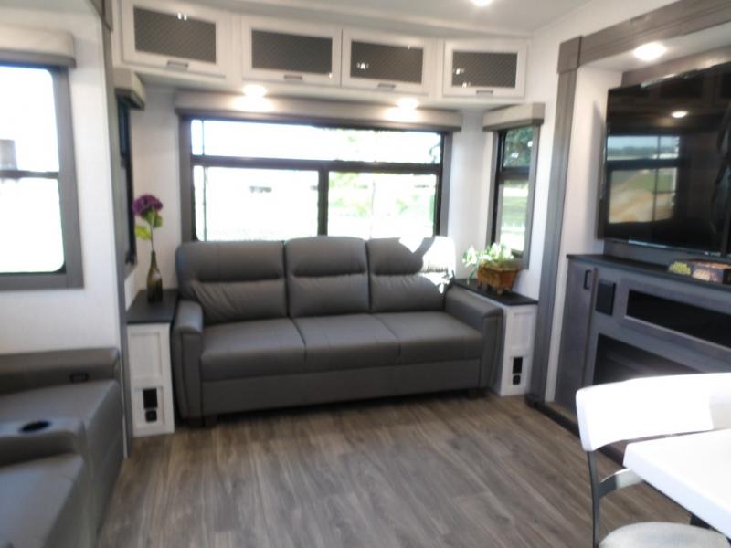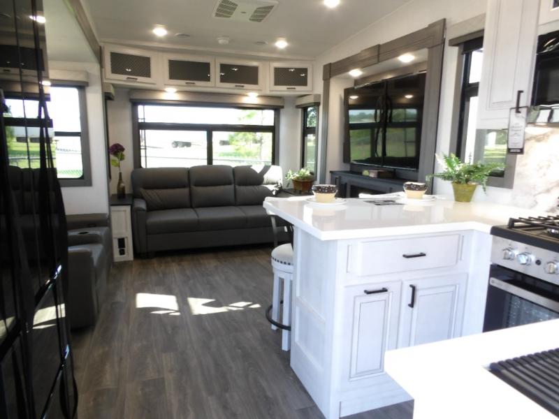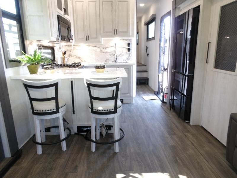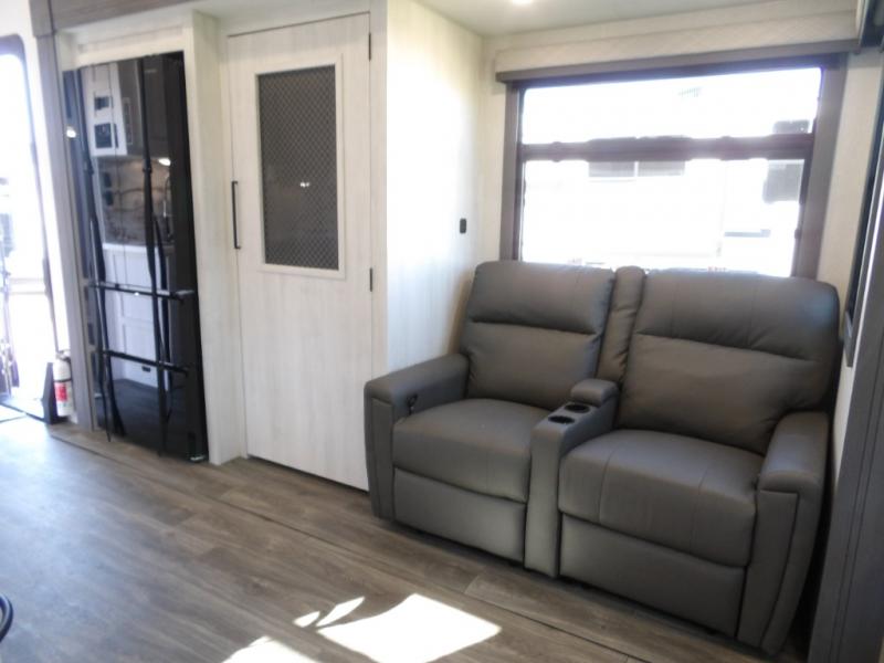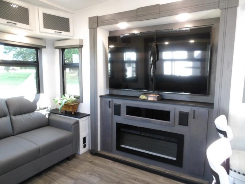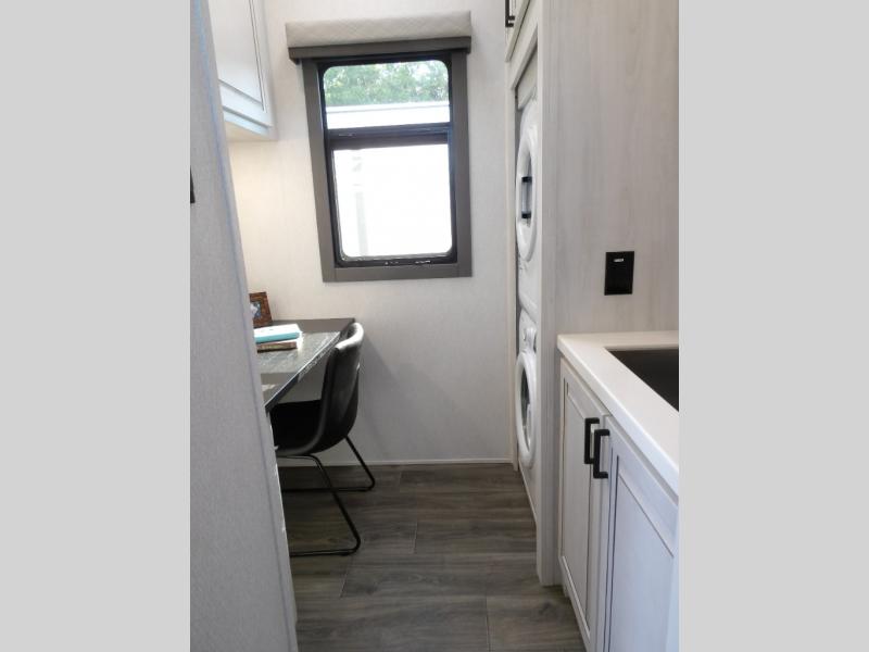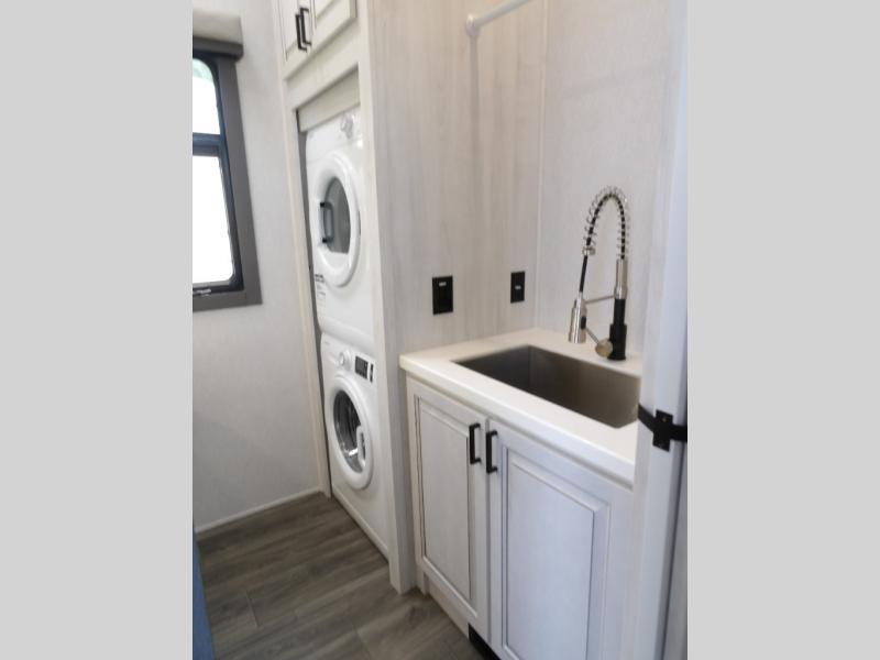 Head to the lake in this spacious fifth wheel for four! You will love the front private bedroom with a king bed slide out, sliding dresser top with hidden storage, and front closet to keep your clothes organized. The full bath is right next to the bedroom for easy access at night, and you're going to love having the utility room in this unit. There is stackable washer and dryer prep, a desk or laundry table, plus a sink with a mirror, making this room multi-functional! A full kitchen includes a u-shaped counter, a four burner range and an over-the-range microwave, plus a 16 cu. ft. refrigerator and walk-in pantry with a coffee bar and shelves. There is also a breakfast bar with seating here where you can visit with the chef while dinner is being made. Last but not least, the rear living area will be a favorite place to hang out with theater seating, a rear 78" EZ out sofa, and a TV with a fireplace!