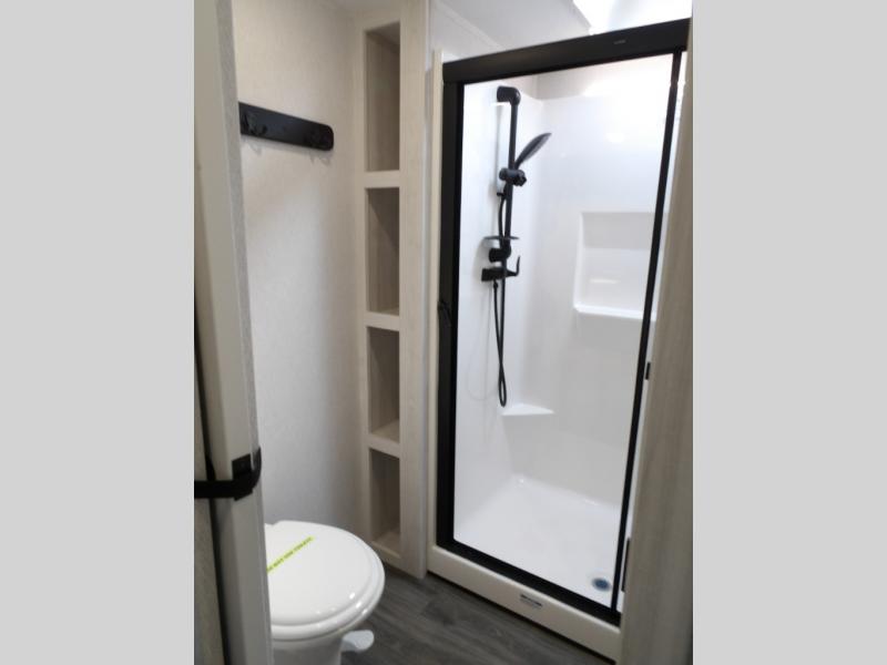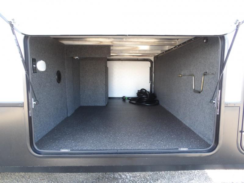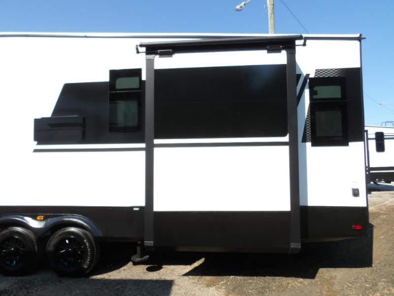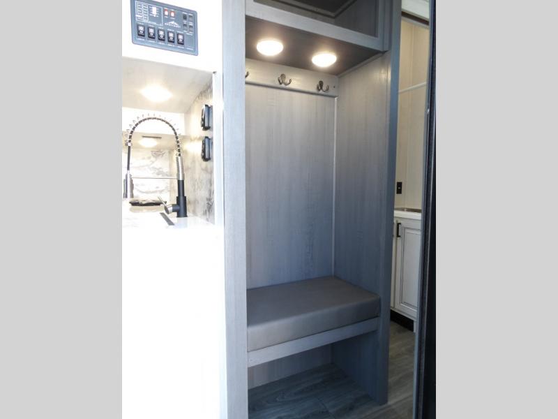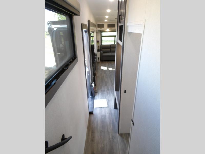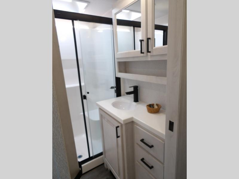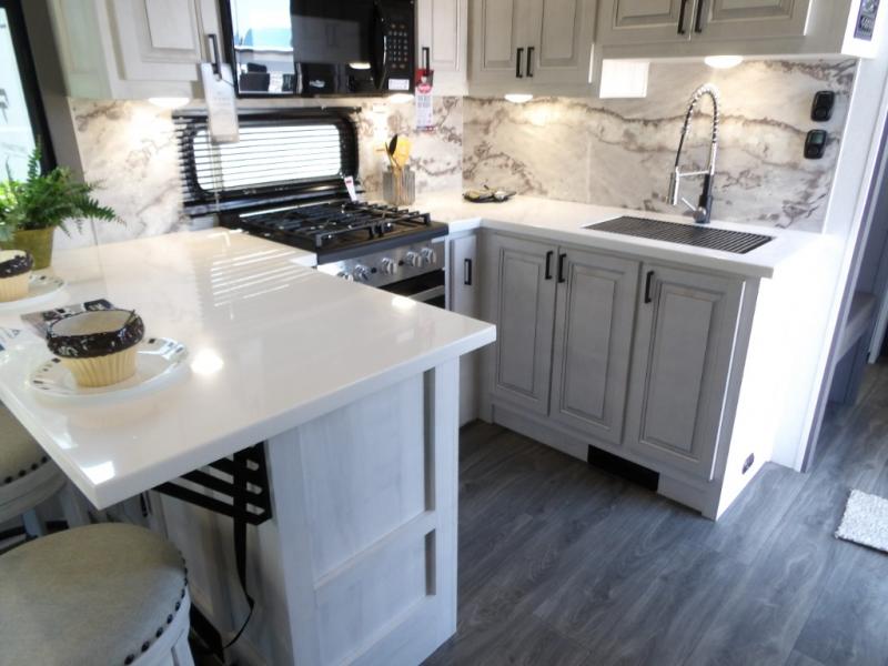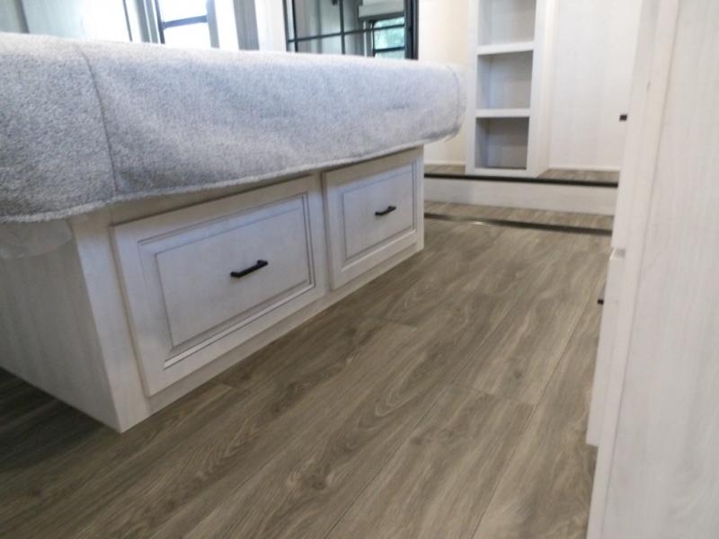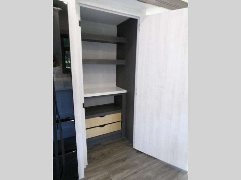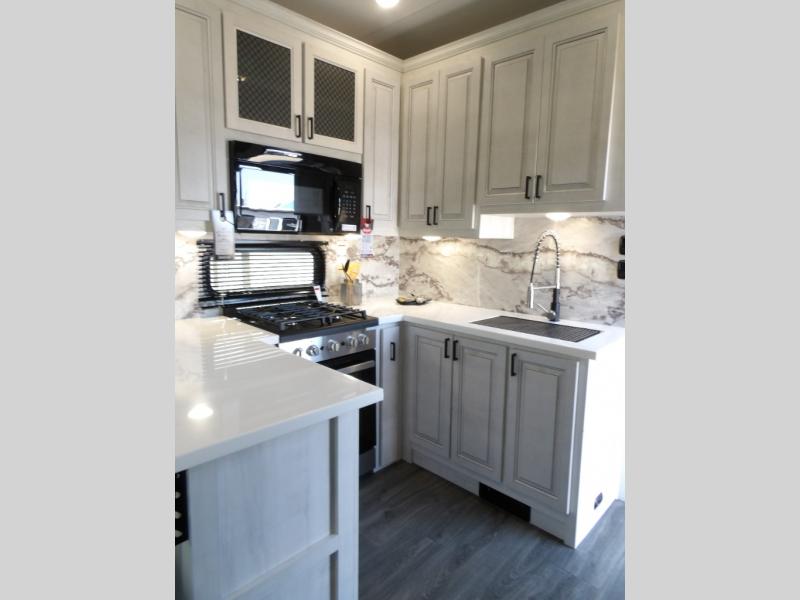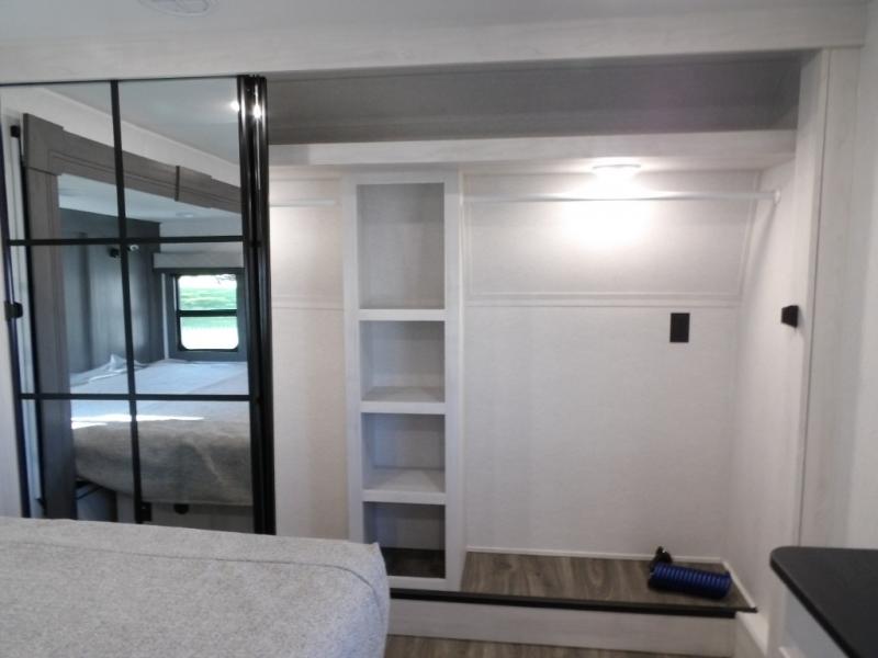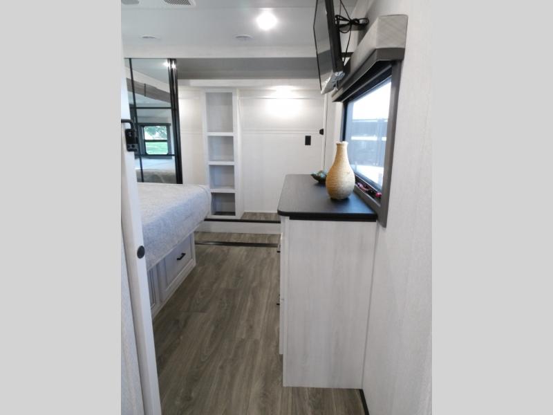 Head to the lake in this spacious fifth wheel for four! You will love the front private bedroom with a king bed slide out, sliding dresser top with hidden storage, and front closet to keep your clothes organized. The full bath is right next to the bedroom for easy access at night, and you're going to love having the utility room in this unit. There is stackable washer and dryer prep, a desk or laundry table, plus a sink with a mirror, making this room multi-functional! A full kitchen includes a u-shaped counter, a four burner range and an over-the-range microwave, plus a 16 cu. ft. refrigerator and walk-in pantry with a coffee bar and shelves. There is also a breakfast bar with seating here where you can visit with the chef while dinner is being made. Last but not least, the rear living area will be a favorite place to hang out with theater seating, a rear 78" EZ out sofa, and a TV with a fireplace!