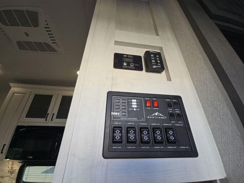 There is just too much luxury to name on the EAST TO WEST Ahara fifth wheel! These units are quite impressive, and once you see them, you'll know what we mean. The Ahara first grabs your attention with its fully painted aerodynamic fiberglass front cap, 102" wide-body chassis, and deep tint square frameless windows. For towing, you'll find a MORryde CRE 3000 suspension, LED marker lights, LED taillights with back-up lights, and rear view camera prep. Traveling in different climates is also made easy with the high-efficiency triple A/C system, 40,000 BTU high-capacity furnace, plus heated, insulated, and enclosed underbelly found within the Climate Package. Head inside to enjoy Slow Rise roller shades, a flush floor kitchen slide to help prevent trips, and solid surface countertops in the kitchen and bath to name a few luxuries!