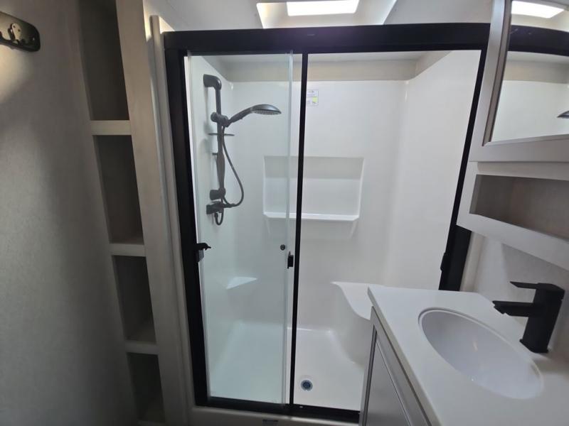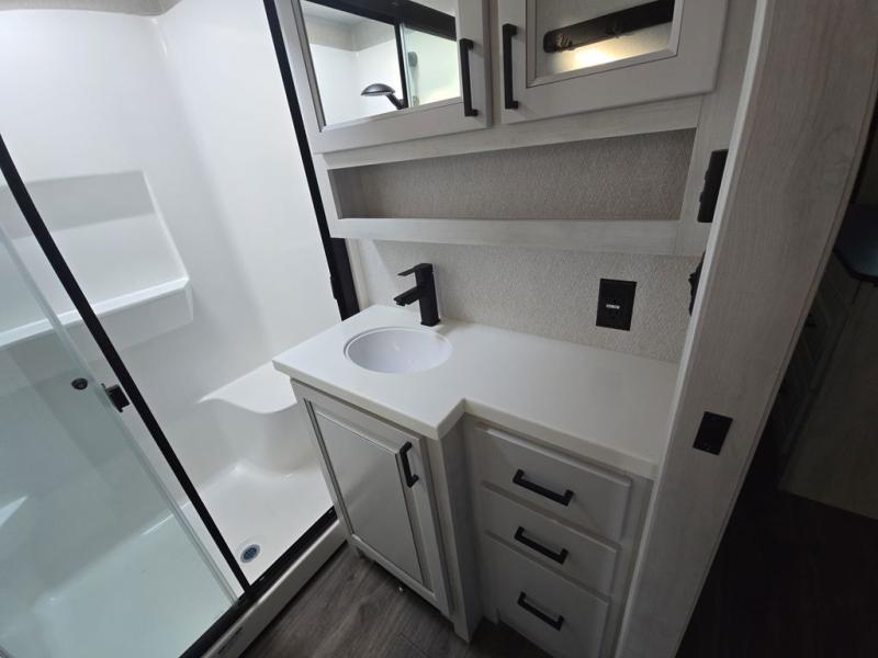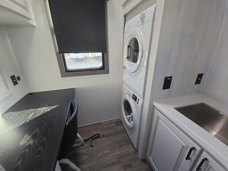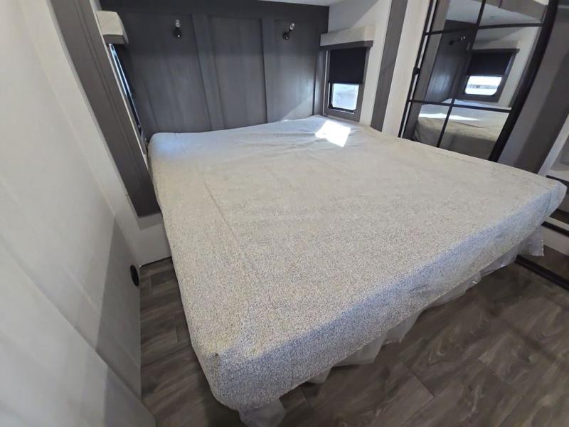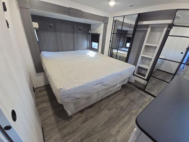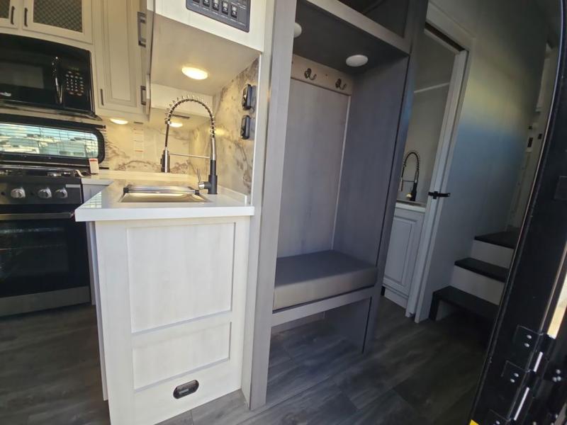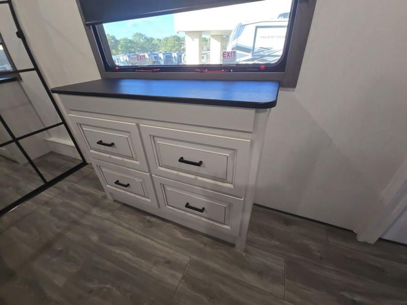 Head to the lake in this spacious fifth wheel for four! You will love the front private bedroom with a king bed slide out, sliding dresser top with hidden storage, and front closet to keep your clothes organized. The full bath is right next to the bedroom for easy access at night, and you're going to love having the utility room in this unit. There is stackable washer and dryer prep, a desk or laundry table, plus a sink with a mirror, making this room multi-functional! A full kitchen includes a u-shaped counter, a four burner range and an over-the-range microwave, plus a 16 cu. ft. refrigerator and walk-in pantry with a coffee bar and shelves. There is also a breakfast bar with seating here where you can visit with the chef while dinner is being made. Last but not least, the rear living area will be a favorite place to hang out with theater seating, a rear 78" EZ out sofa, and a TV with a fireplace!