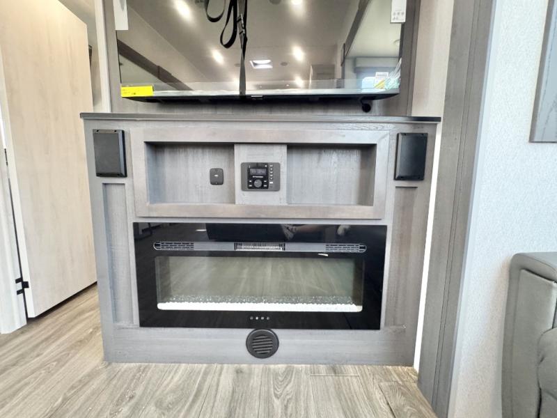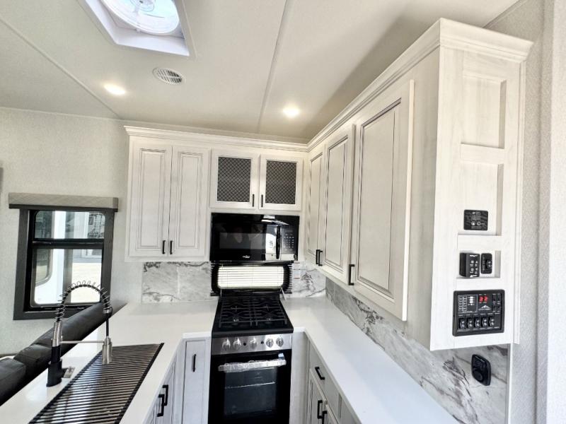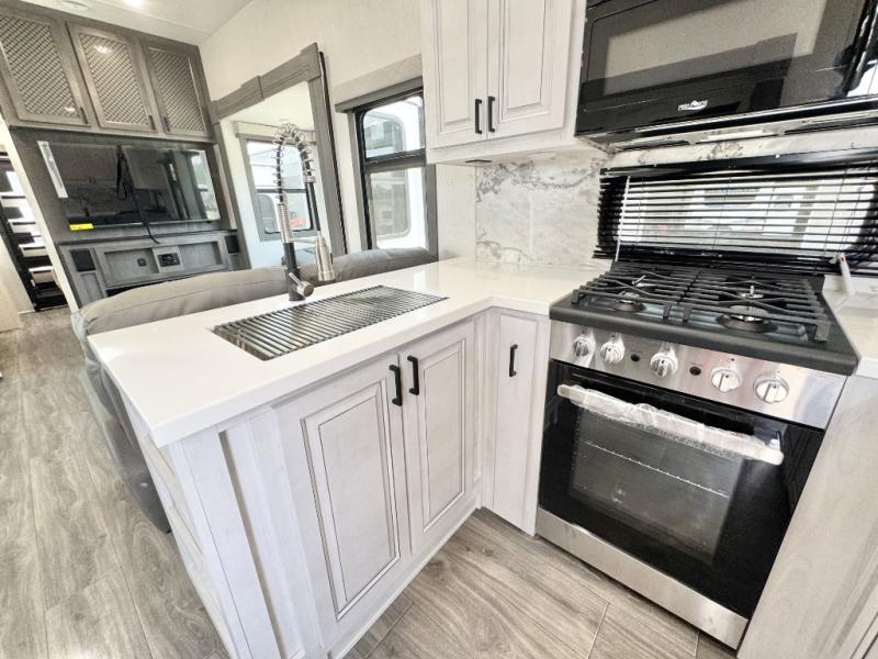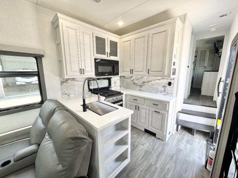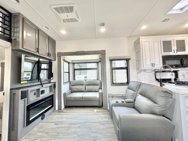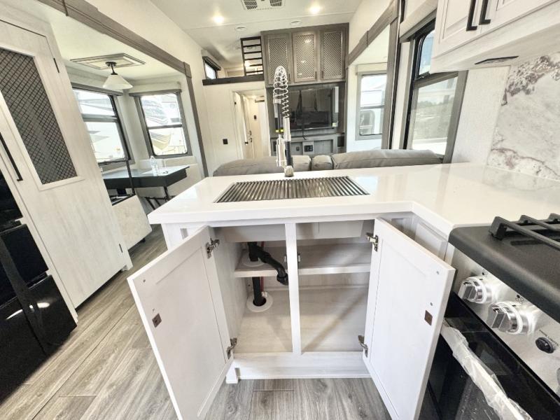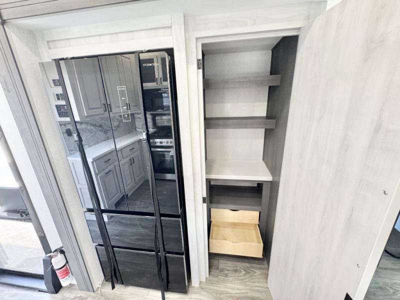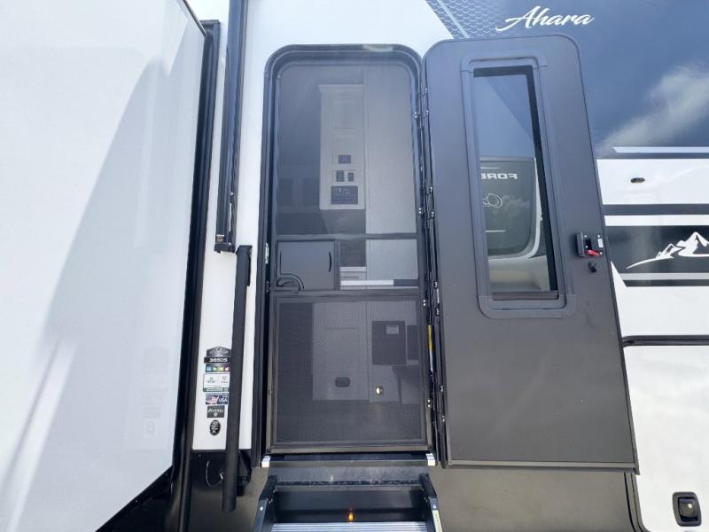If you're looking for a luxury fifth wheel with more space for friends and family, you've found it in this Ahara! The main entry door opens up to the living area with dual opposing slides, a 50" LED TV with a fireplace, plus a full kitchen with residential appliances, a hutch, and even a pantry for dry goods and snacks. Everyone can meet here in the evenings to dine at the free-standing dinette or relax on the theater seating. You'll love the rear master suite with its king bed slide out, drawers under the bed, and full rear bath with the unique rear second entry door. And check out the Ahara Sky Suite loft above this room for even more sleeping or storage space! Your guests will find the front private bedroom to be accommodating since it includes a king bed slide out, drawers under the bed, pus a large wardrobe to keep clothes tidy. There is also a closet with washer and dryer pre. Who knows, you may just choose this bedroom for your own!