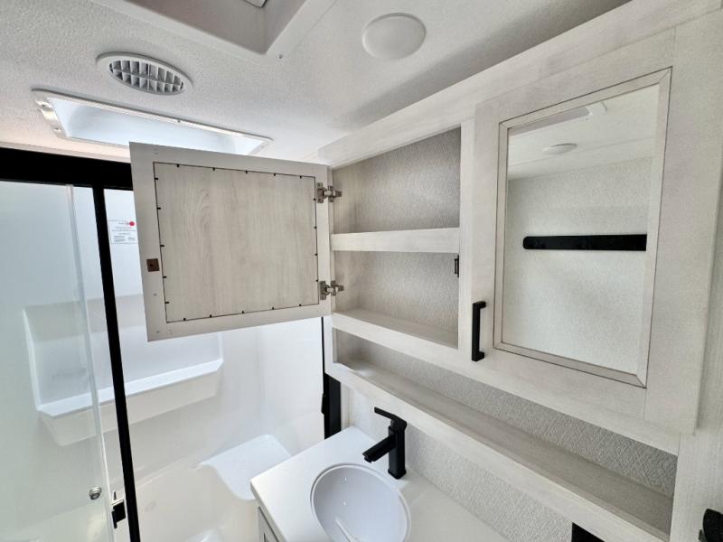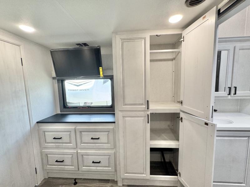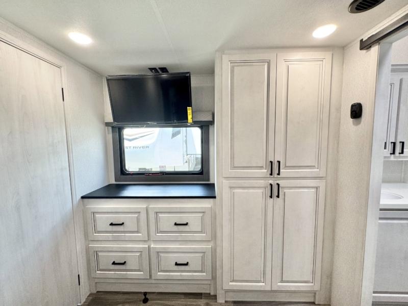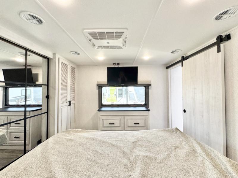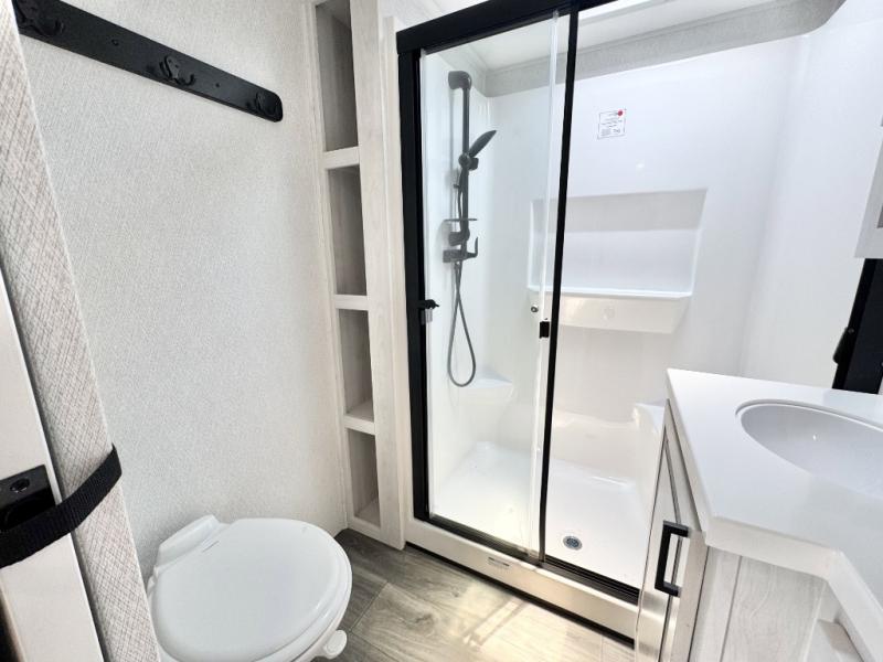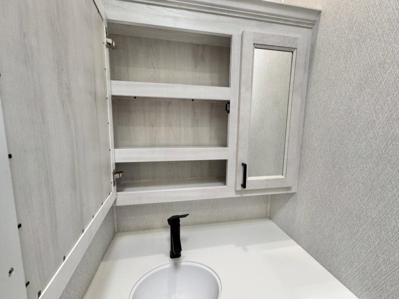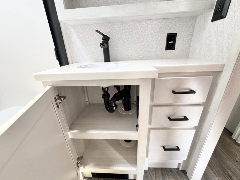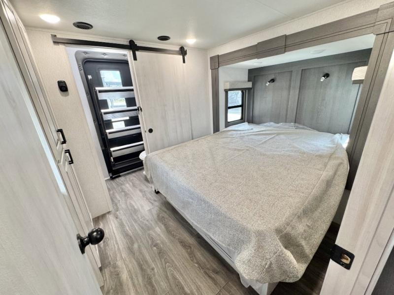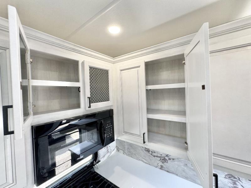 If you're looking for a luxury fifth wheel with more space for friends and family, you've found it in this Ahara! The main entry door opens up to the living area with dual opposing slides, a 50" LED TV with a fireplace, plus a full kitchen with residential appliances, a hutch, and even a pantry for dry goods and snacks. Everyone can meet here in the evenings to dine at the free-standing dinette or relax on the theater seating. You'll love the rear master suite with its king bed slide out, drawers under the bed, and full rear bath with the unique rear second entry door. And check out the Ahara Sky Suite loft above this room for even more sleeping or storage space! Your guests will find the front private bedroom to be accommodating since it includes a king bed slide out, drawers under the bed, pus a large wardrobe to keep clothes tidy. There is also a closet with washer and dryer pre. Who knows, you may just choose this bedroom for your own!