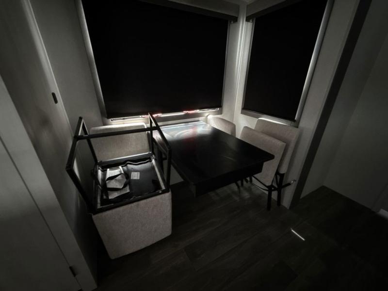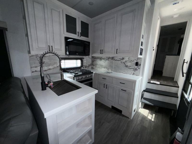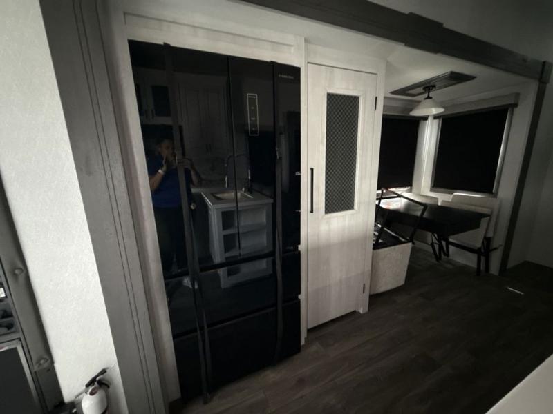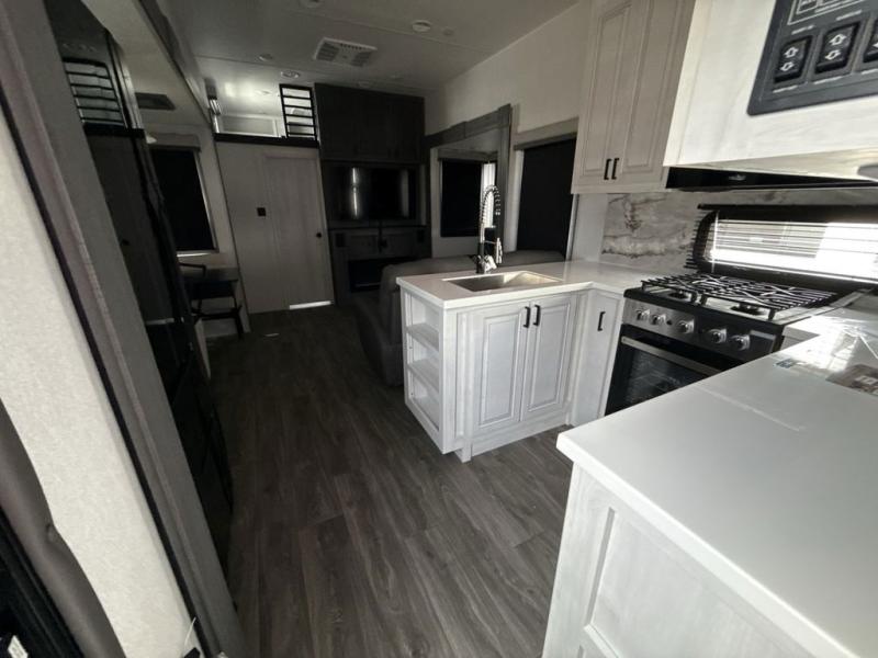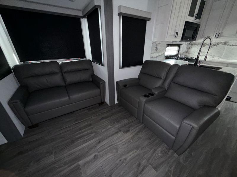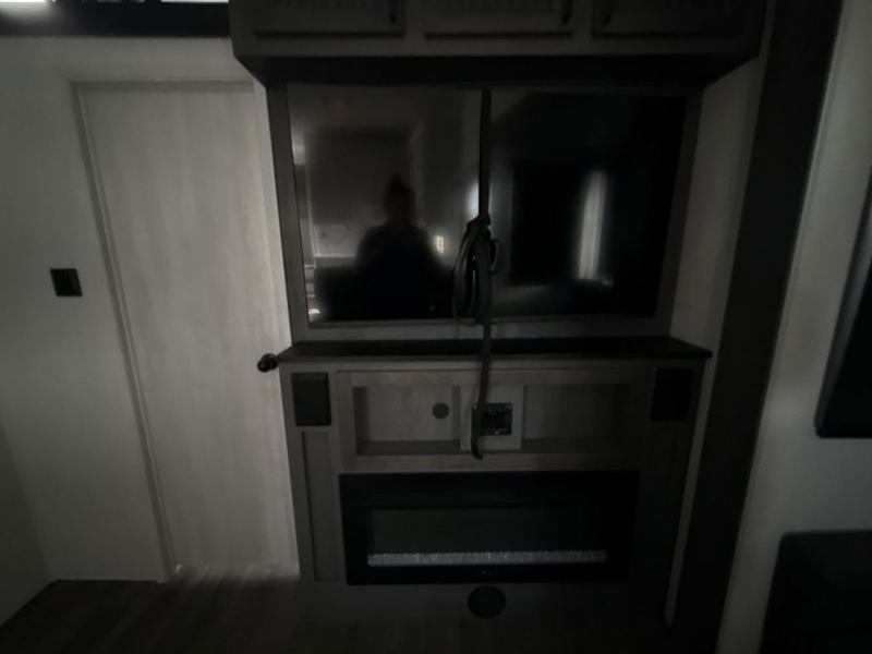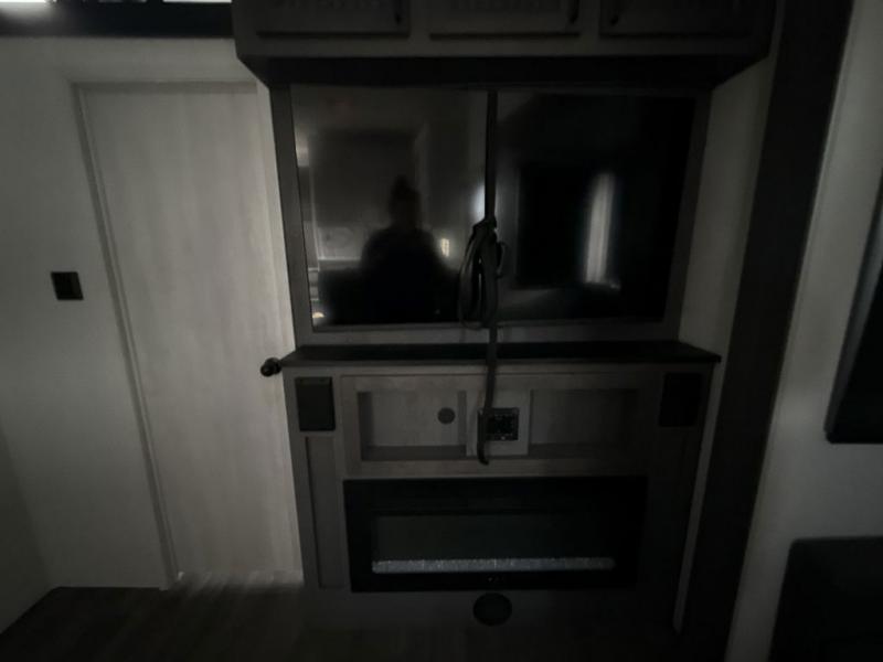 If you enjoy camping with a larger group of family or friends, this dual entry fifth wheel is for you! There is a front bedroom with a king bed slide and storage, plus a second bedroom in the back, complete with a full rear bath, a queen bed slide and storage space. A loft with a ladder is above the rear bedroom, which includes two bunk mats, loft cabinets, and TV prep if the little ones want to watch movies at night. Head to the middle of the unit to enjoy cooking on the four burner range and utilizing the generous counter space in the kitchen. There is also a walk-in pantry with a coffee bar and shelves, plus a 16 cu. ft. 12V refrigerator for food storage. Theater seating in the living room is in direct view of the TV and fireplace, and there is a tri-fold sofa slide out here as well for even more seating and sleeping space!
