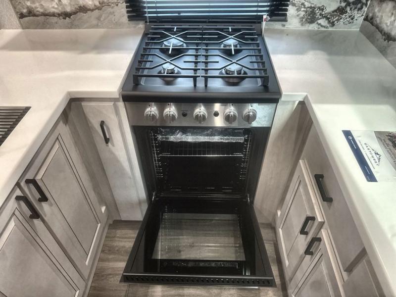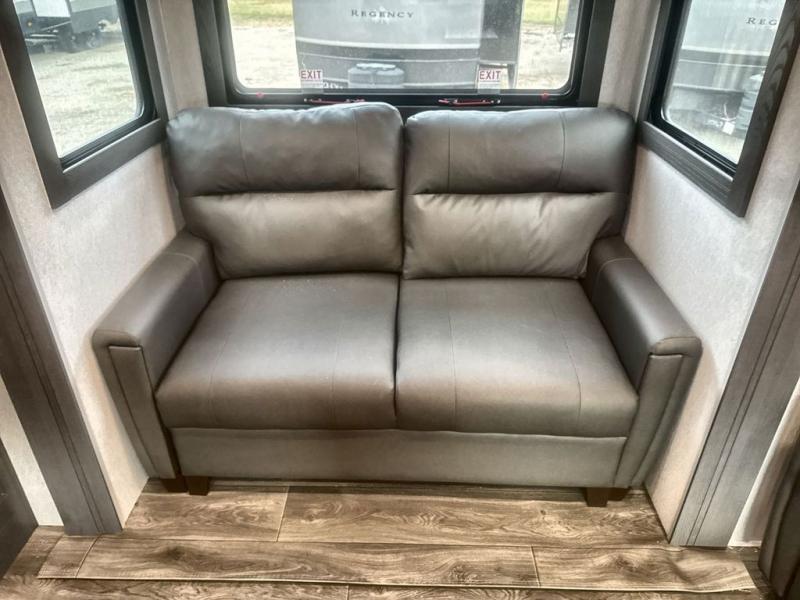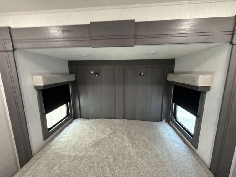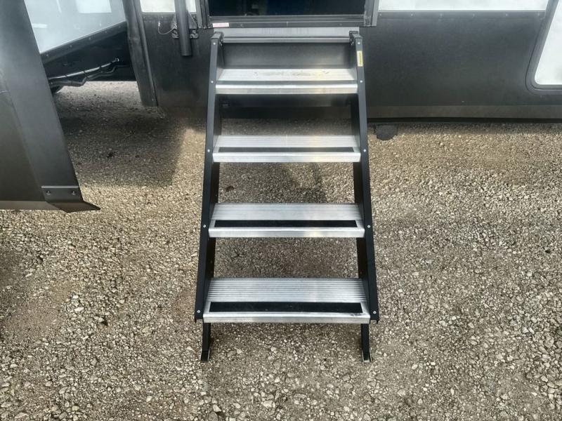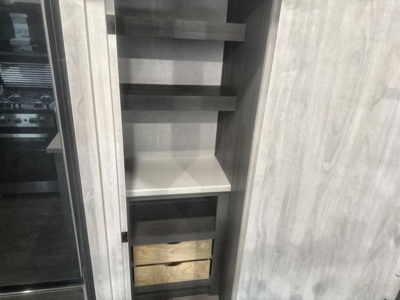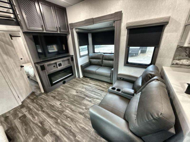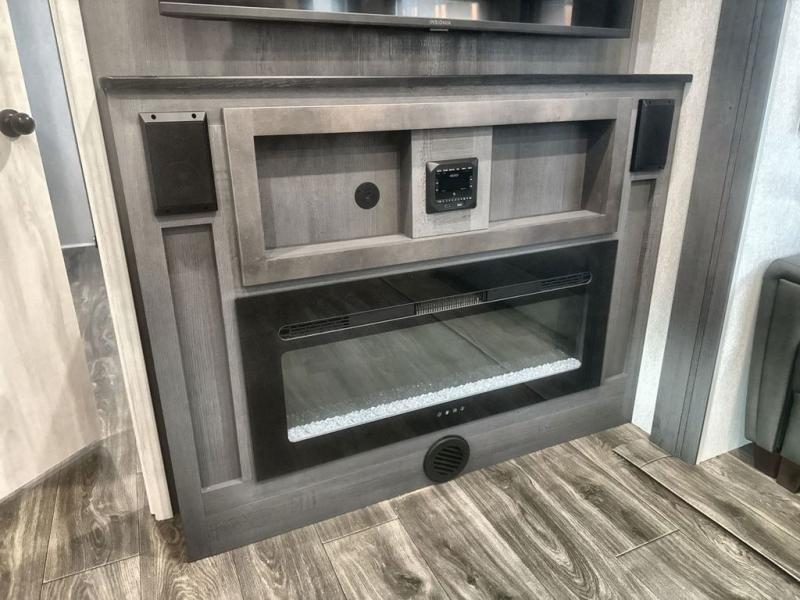If you enjoy camping with a larger group of family or friends, this dual entry fifth wheel is for you! There is a front bedroom with a king bed slide and storage, plus a second bedroom in the back, complete with a full rear bath, a queen bed slide and storage space. A loft with a ladder is above the rear bedroom, which includes two bunk mats, loft cabinets, and TV prep if the little ones want to watch movies at night. Head to the middle of the unit to enjoy cooking on the four burner range and utilizing the generous counter space in the kitchen. There is also a walk-in pantry with a coffee bar and shelves, plus a 16 cu. ft. 12V refrigerator for food storage. Theater seating in the living room is in direct view of the TV and fireplace, and there is a tri-fold sofa slide out here as well for even more seating and sleeping space!