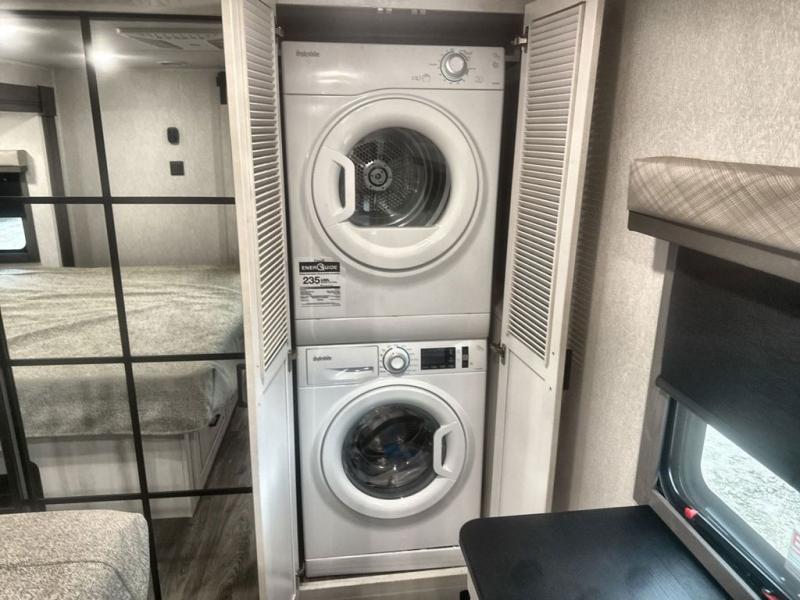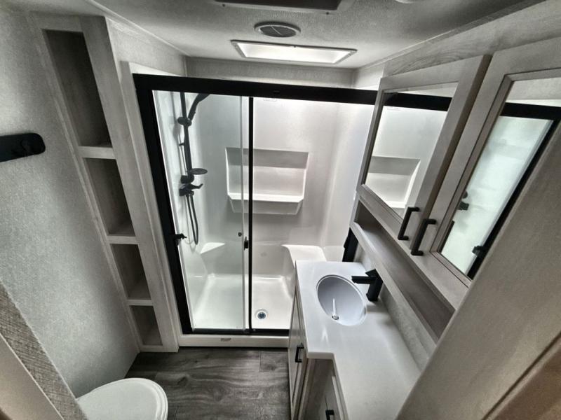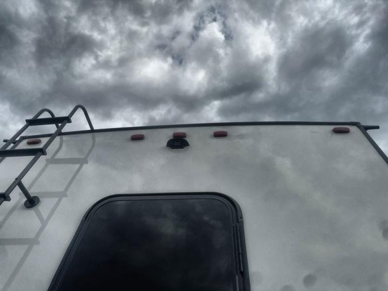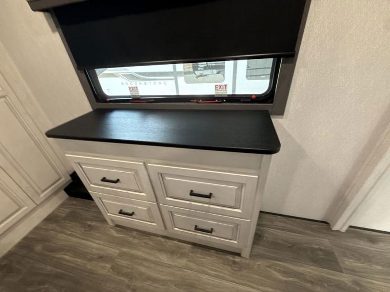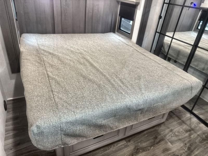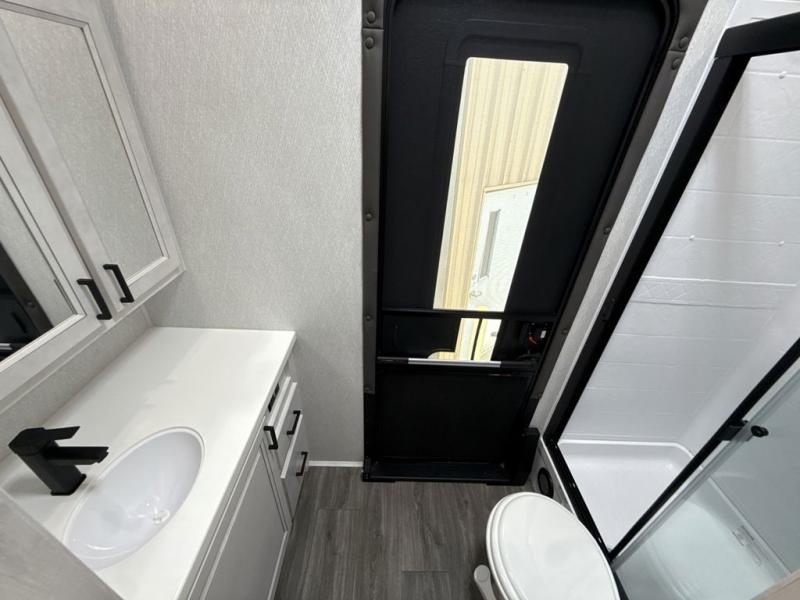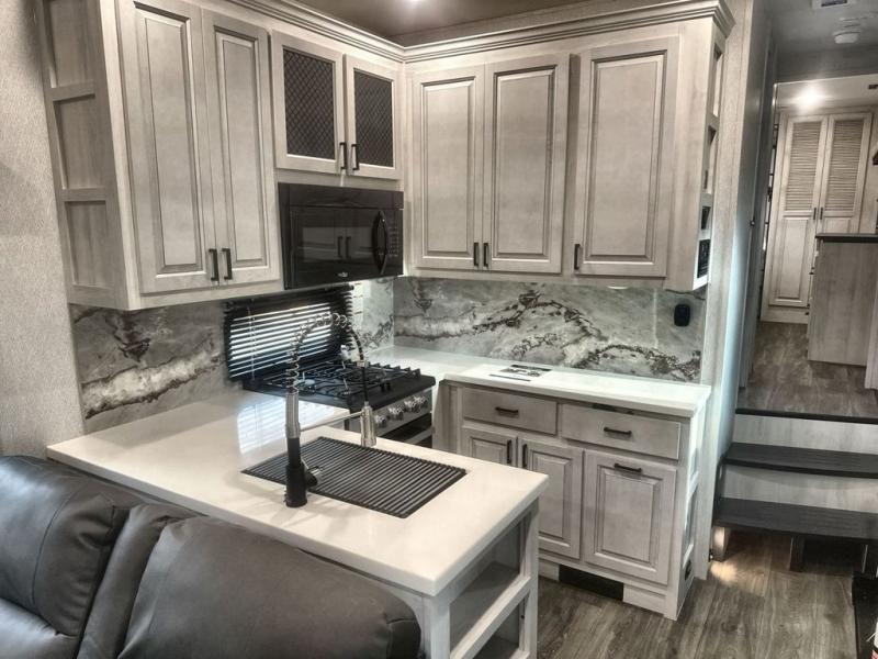 If you enjoy camping with a larger group of family or friends, this dual entry fifth wheel is for you! There is a front bedroom with a king bed slide and storage, plus a second bedroom in the back, complete with a full rear bath, a queen bed slide and storage space. A loft with a ladder is above the rear bedroom, which includes two bunk mats, loft cabinets, and TV prep if the little ones want to watch movies at night. Head to the middle of the unit to enjoy cooking on the four burner range and utilizing the generous counter space in the kitchen. There is also a walk-in pantry with a coffee bar and shelves, plus a 16 cu. ft. 12V refrigerator for food storage. Theater seating in the living room is in direct view of the TV and fireplace, and there is a tri-fold sofa slide out here as well for even more seating and sleeping space!