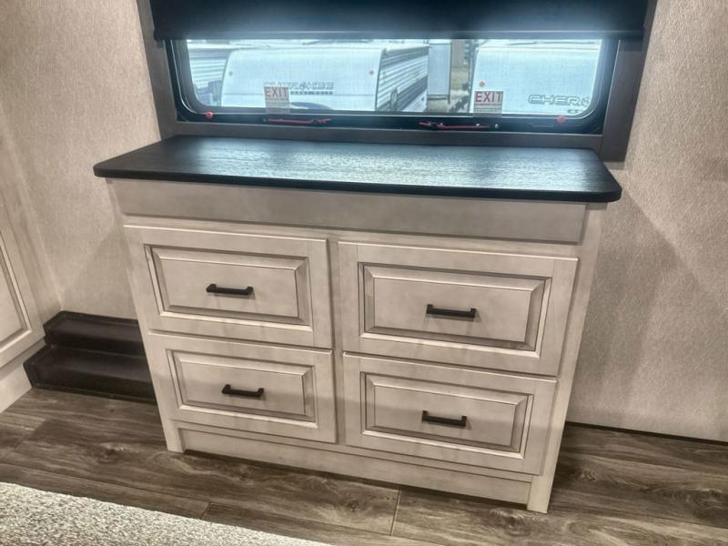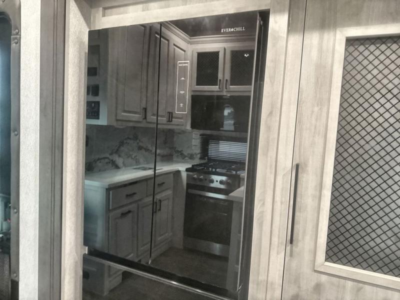 There is just too much luxury to name on the EAST TO WEST Ahara fifth wheel! These units are quite impressive, and once you see them, you'll know what we mean. The Ahara first grabs your attention with its fully painted aerodynamic fiberglass front cap, 102" wide-body chassis, and deep tint square frameless windows. For towing, you'll find a MORryde CRE 3000 suspension, LED marker lights, LED taillights with back-up lights, and rear view camera prep. Traveling in different climates is also made easy with the high-efficiency triple A/C system, 40,000 BTU high-capacity furnace, plus heated, insulated, and enclosed underbelly found within the Climate Package. Head inside to enjoy Slow Rise roller shades, a flush floor kitchen slide to help prevent trips, and solid surface countertops in the kitchen and bath to name a few luxuries!