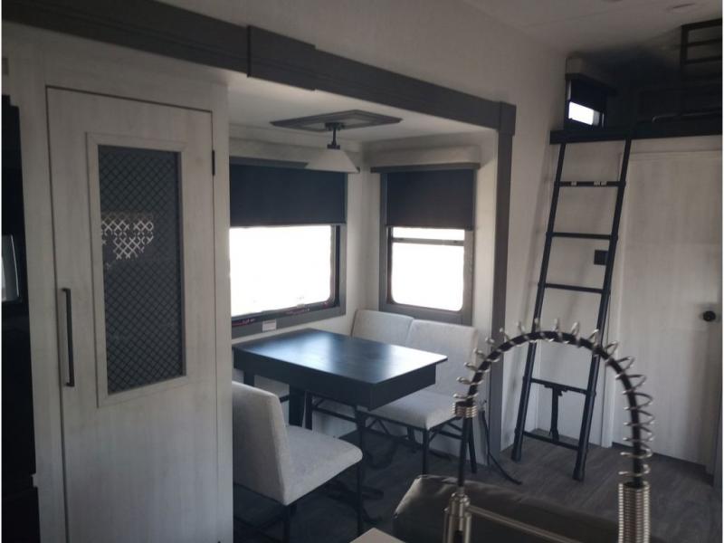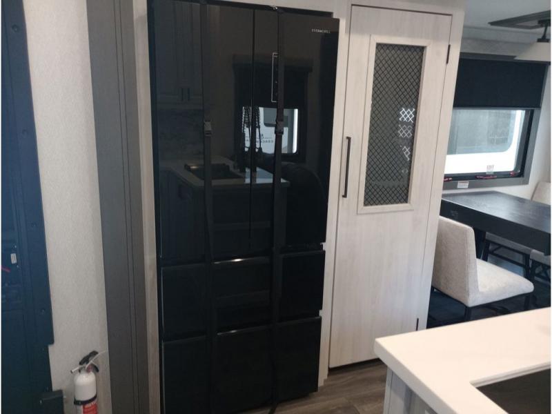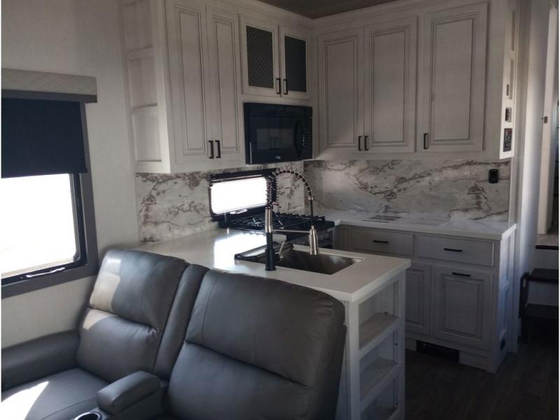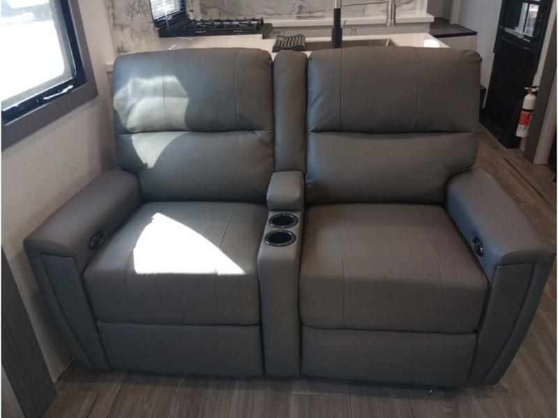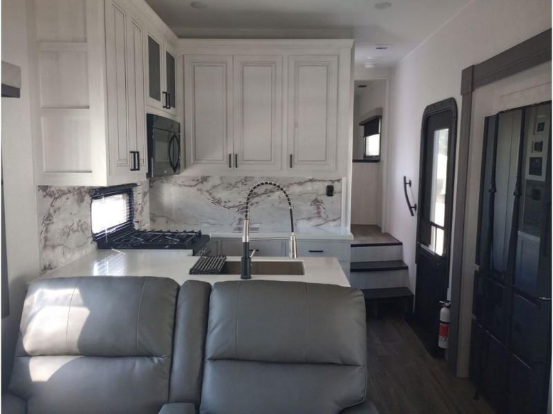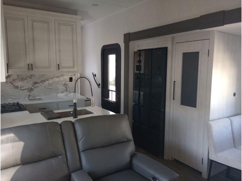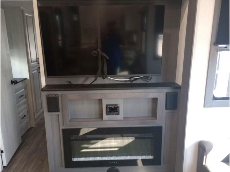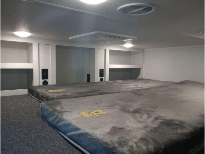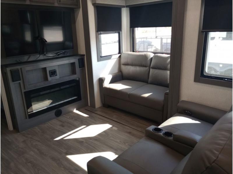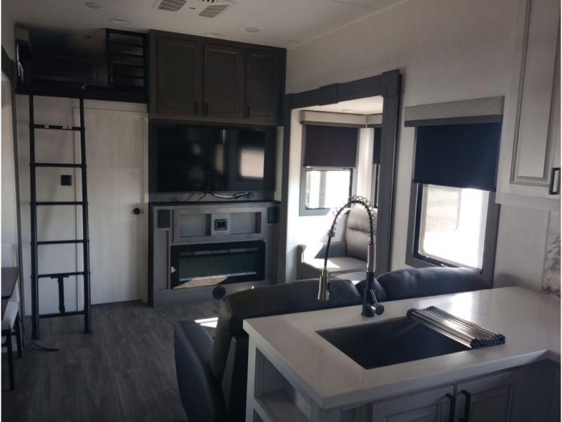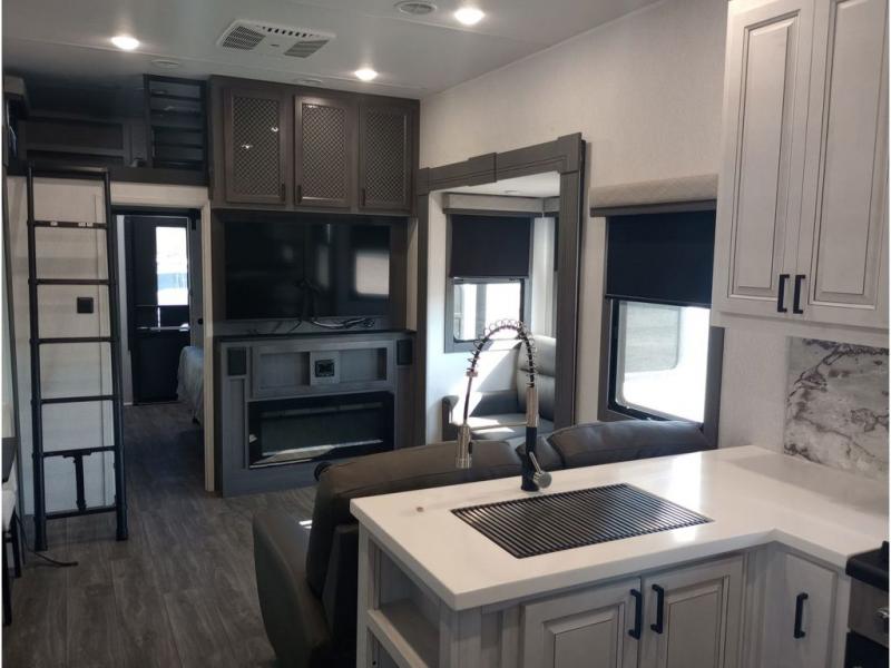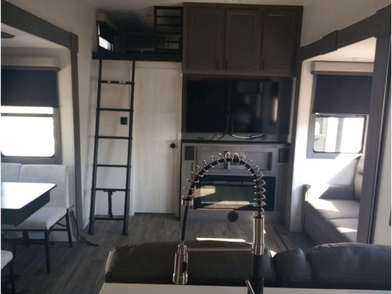 If you enjoy camping with a larger group of family or friends, this dual entry fifth wheel is for you! There is a front bedroom with a king bed slide and storage, plus a second bedroom in the back, complete with a full rear bath, a queen bed slide and storage space. A loft with a ladder is above the rear bedroom, which includes two bunk mats, loft cabinets, and TV prep if the little ones want to watch movies at night. Head to the middle of the unit to enjoy cooking on the four burner range and utilizing the generous counter space in the kitchen. There is also a walk-in pantry with a coffee bar and shelves, plus a 16 cu. ft. 12V refrigerator for food storage. Theater seating in the living room is in direct view of the TV and fireplace, and there is a tri-fold sofa slide out here as well for even more seating and sleeping space!