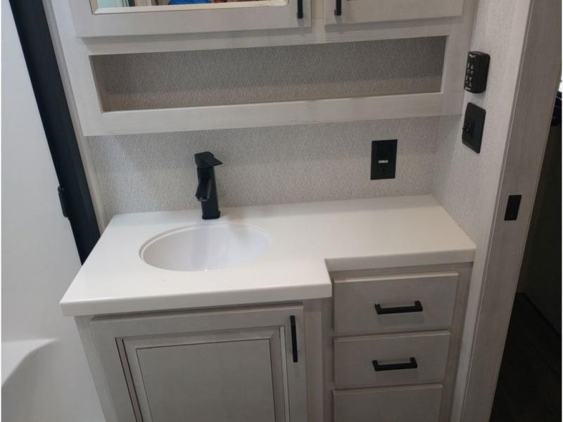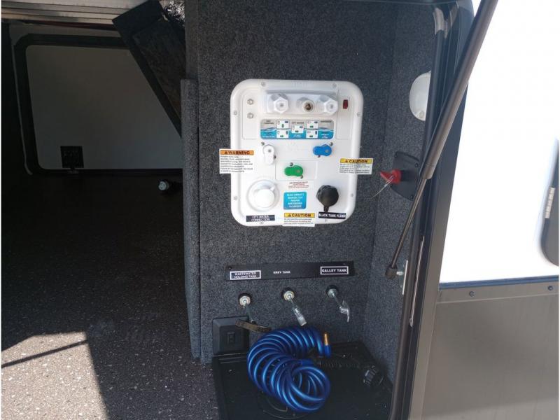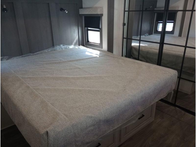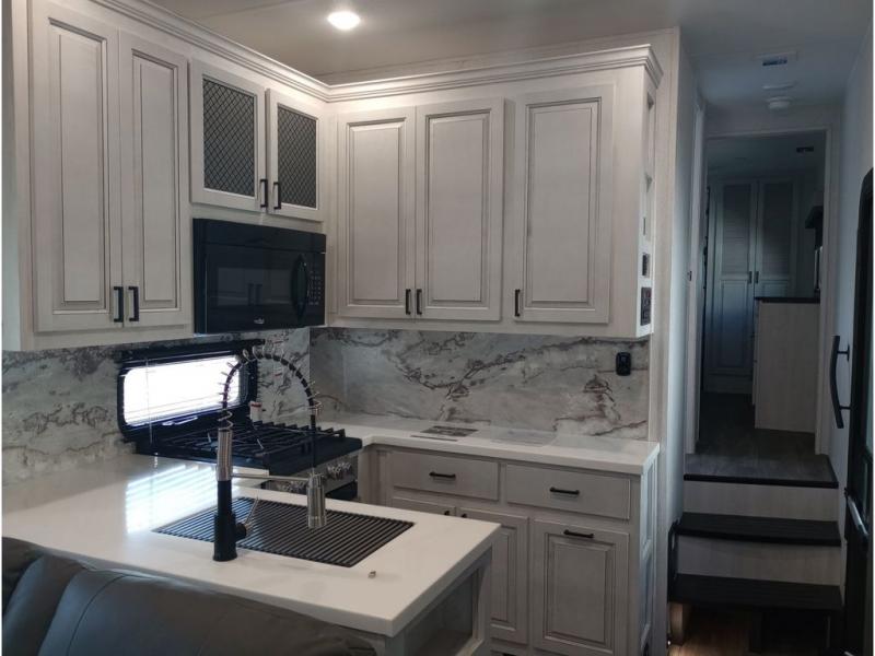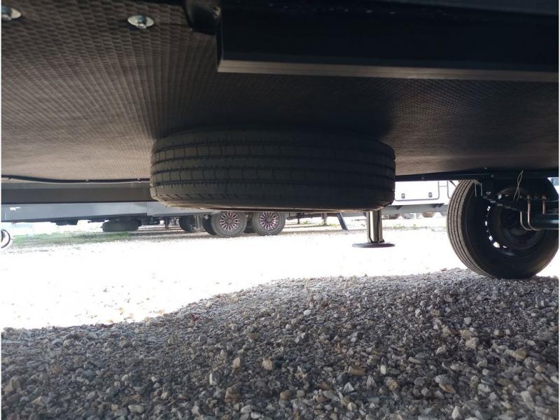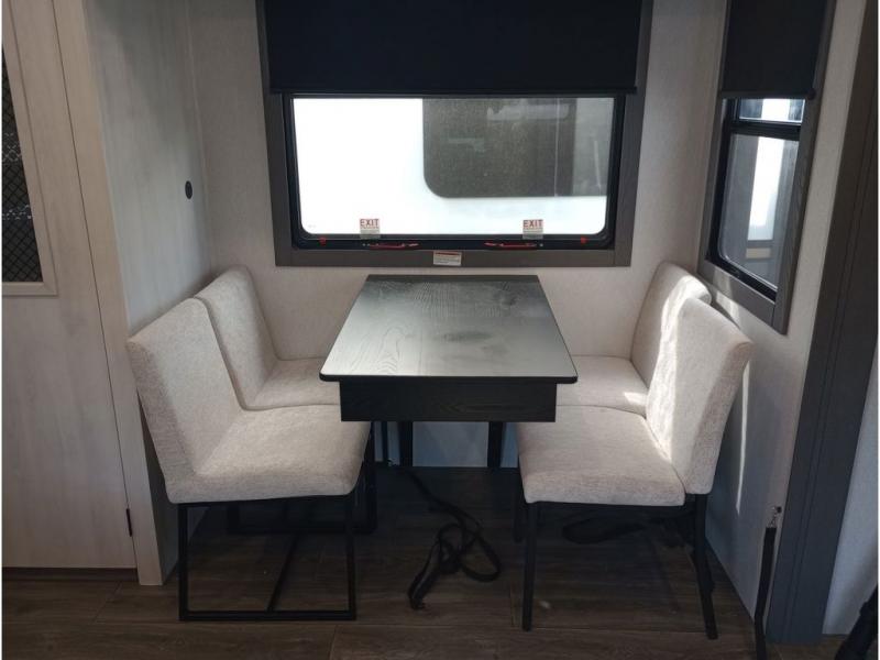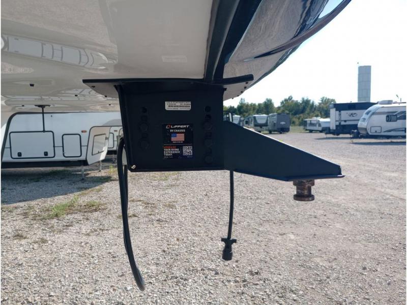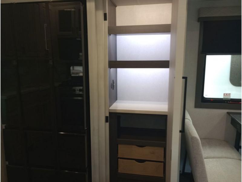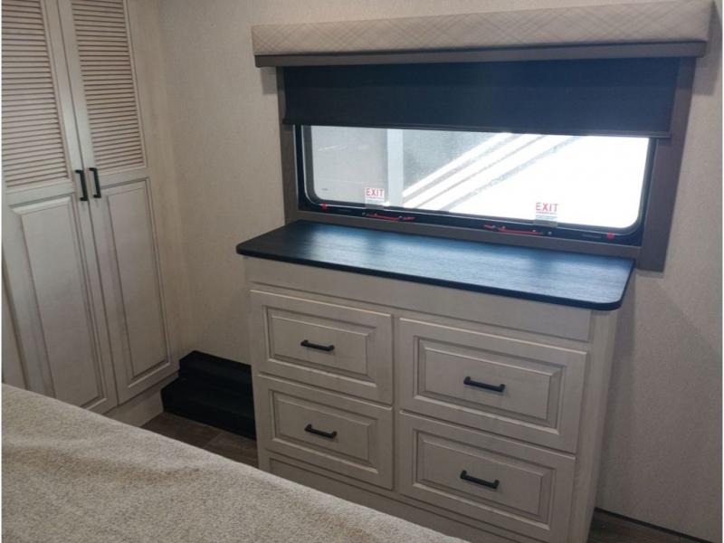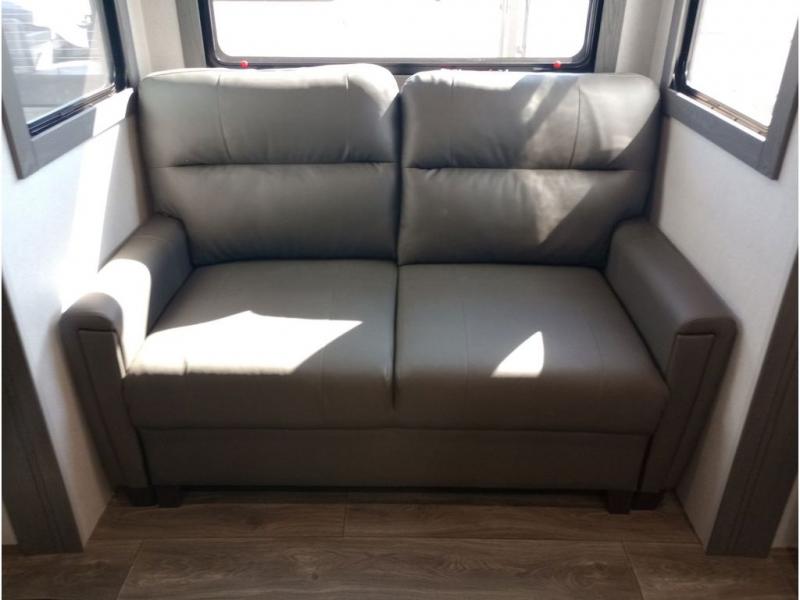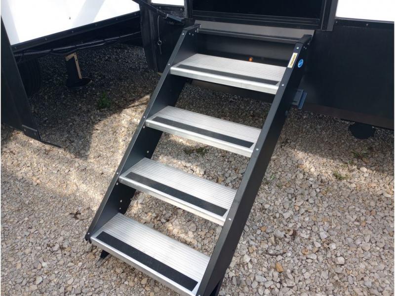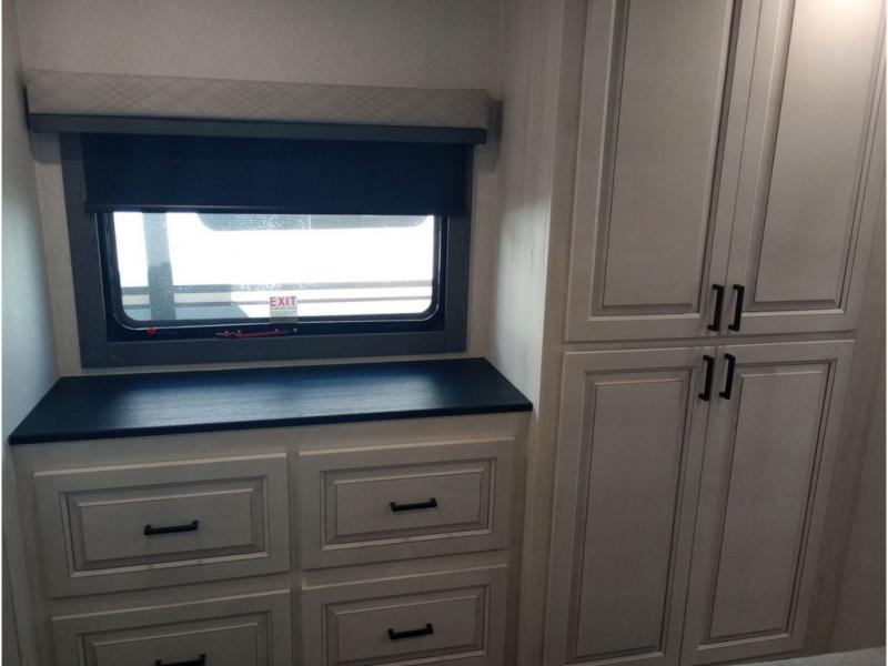 If you enjoy camping with a larger group of family or friends, this dual entry fifth wheel is for you! There is a front bedroom with a king bed slide and storage, plus a second bedroom in the back, complete with a full rear bath, a queen bed slide and storage space. A loft with a ladder is above the rear bedroom, which includes two bunk mats, loft cabinets, and TV prep if the little ones want to watch movies at night. Head to the middle of the unit to enjoy cooking on the four burner range and utilizing the generous counter space in the kitchen. There is also a walk-in pantry with a coffee bar and shelves, plus a 16 cu. ft. 12V refrigerator for food storage. Theater seating in the living room is in direct view of the TV and fireplace, and there is a tri-fold sofa slide out here as well for even more seating and sleeping space!