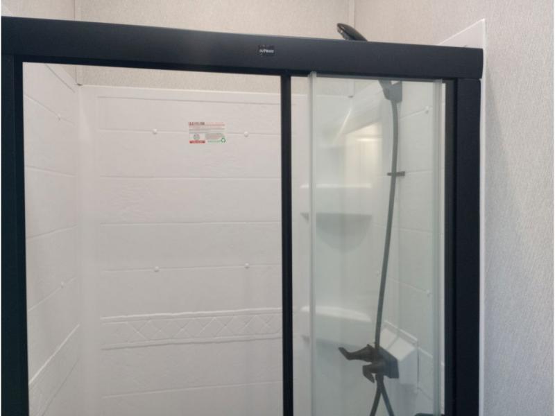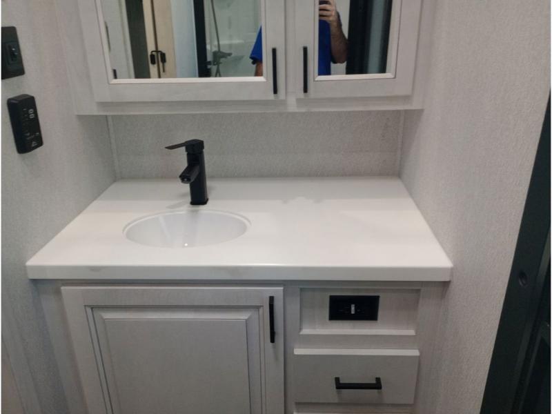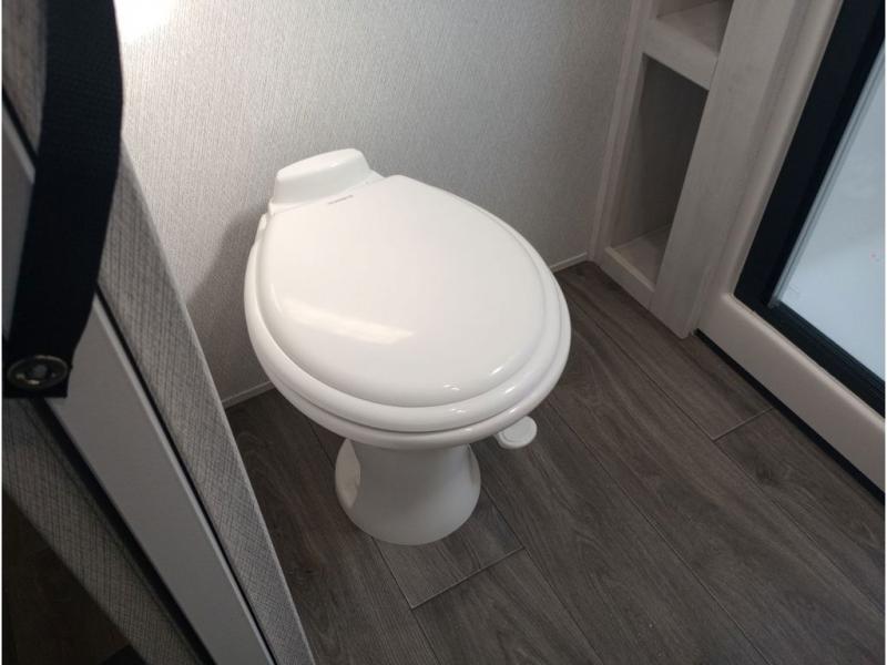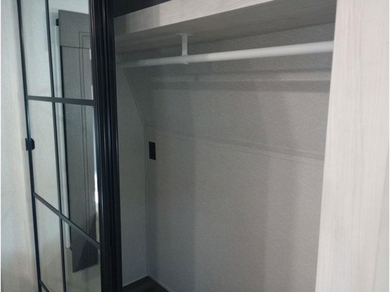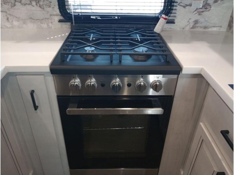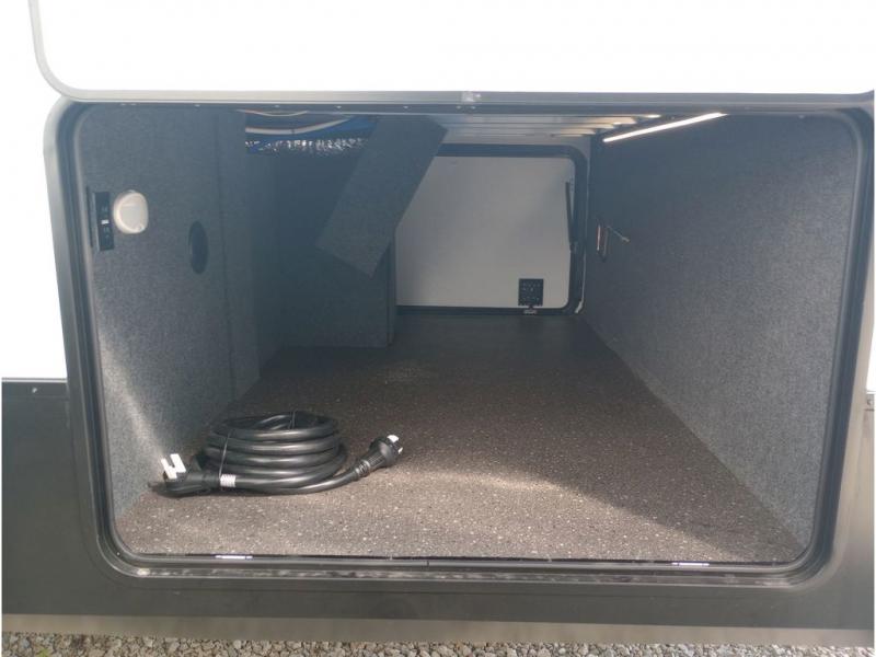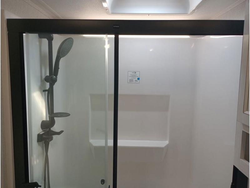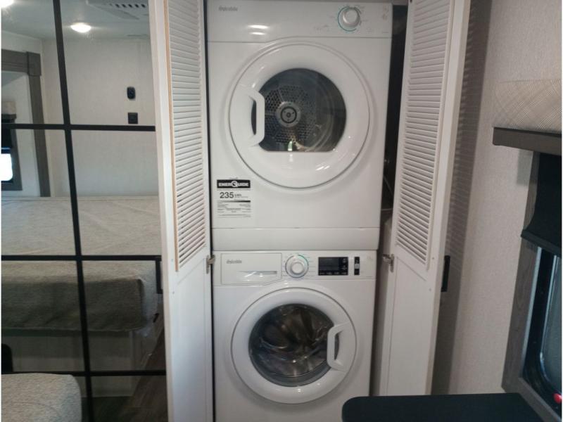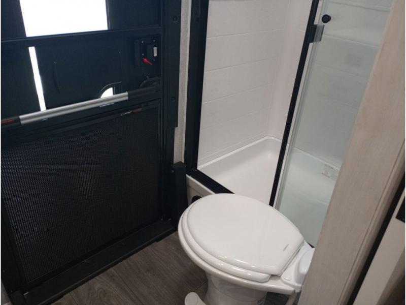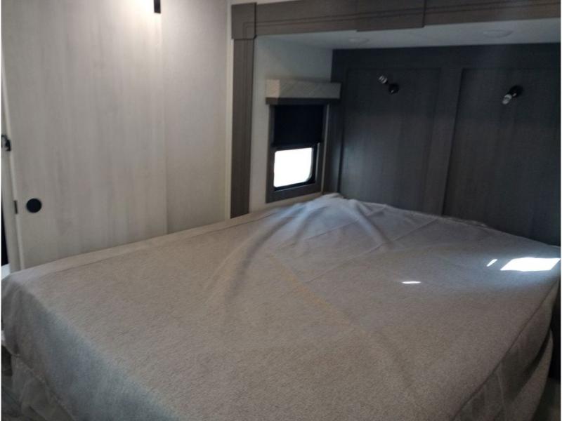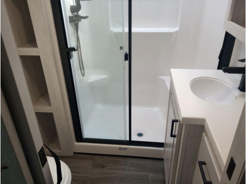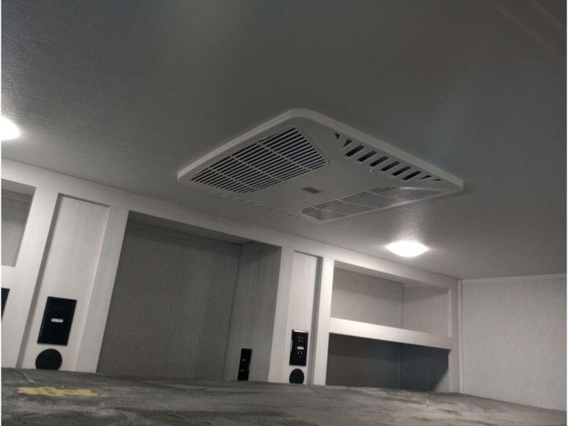 If you enjoy camping with a larger group of family or friends, this dual entry fifth wheel is for you! There is a front bedroom with a king bed slide and storage, plus a second bedroom in the back, complete with a full rear bath, a queen bed slide and storage space. A loft with a ladder is above the rear bedroom, which includes two bunk mats, loft cabinets, and TV prep if the little ones want to watch movies at night. Head to the middle of the unit to enjoy cooking on the four burner range and utilizing the generous counter space in the kitchen. There is also a walk-in pantry with a coffee bar and shelves, plus a 16 cu. ft. 12V refrigerator for food storage. Theater seating in the living room is in direct view of the TV and fireplace, and there is a tri-fold sofa slide out here as well for even more seating and sleeping space!