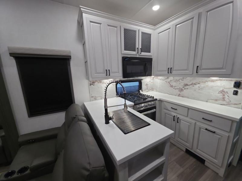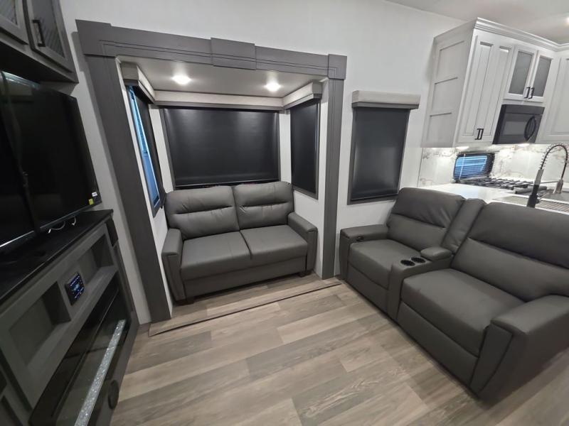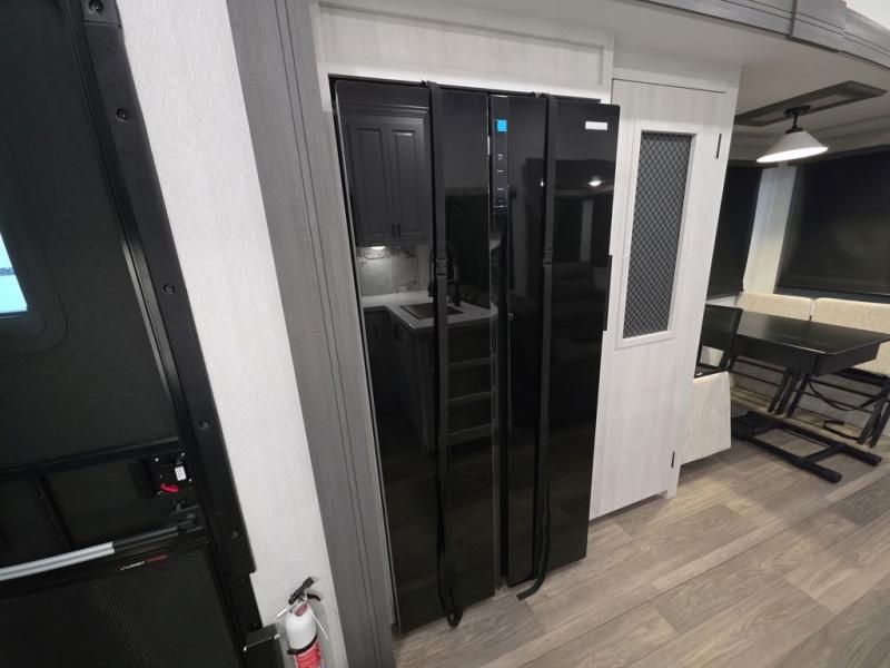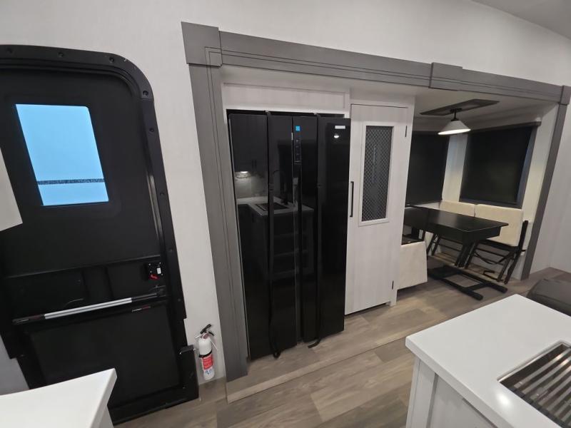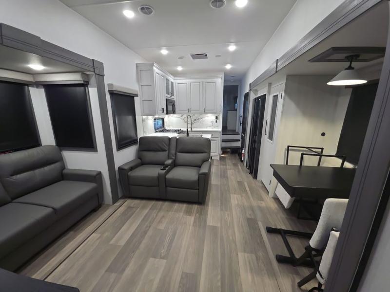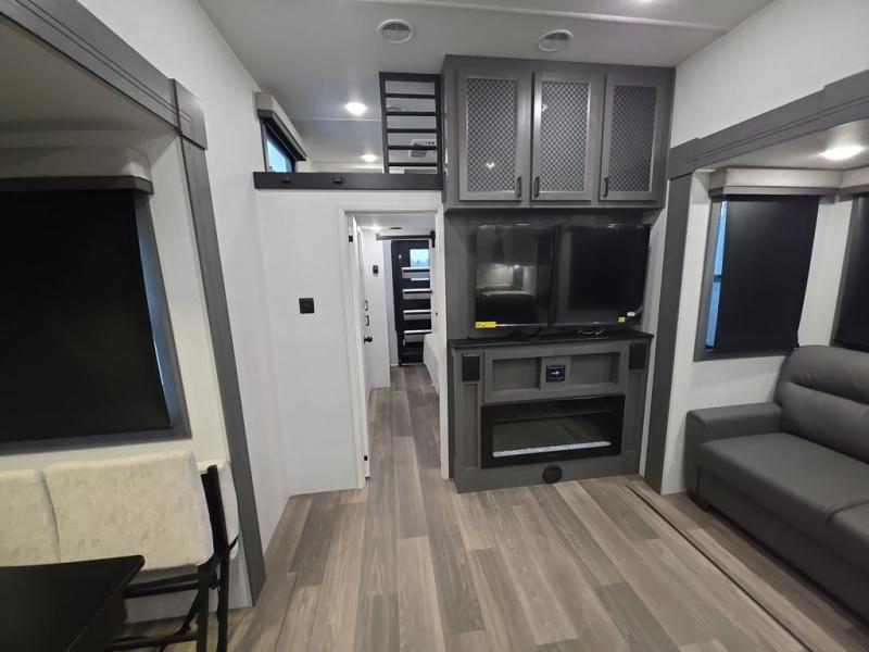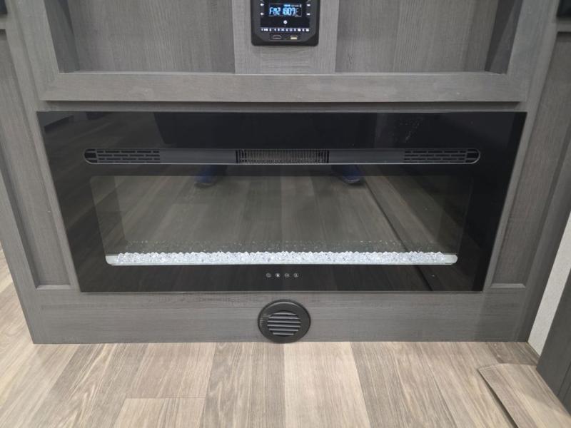 If you enjoy camping with a larger group of family or friends, this dual entry fifth wheel is for you! There is a front bedroom with a king bed slide and storage, plus a second bedroom in the back, complete with a full rear bath, a queen bed slide and storage space. A loft with a ladder is above the rear bedroom, which includes two bunk mats, loft cabinets, and TV prep if the little ones want to watch movies at night. Head to the middle of the unit to enjoy cooking on the four burner range and utilizing the generous counter space in the kitchen. There is also a walk-in pantry with a coffee bar and shelves, plus a 16 cu. ft. 12V refrigerator for food storage. Theater seating in the living room is in direct view of the TV and fireplace, and there is a tri-fold sofa slide out here as well for even more seating and sleeping space!