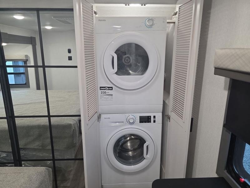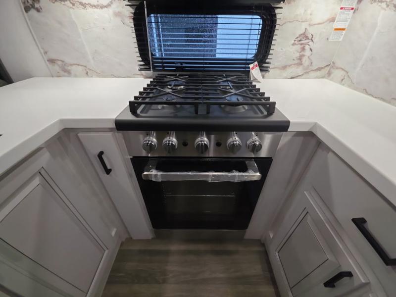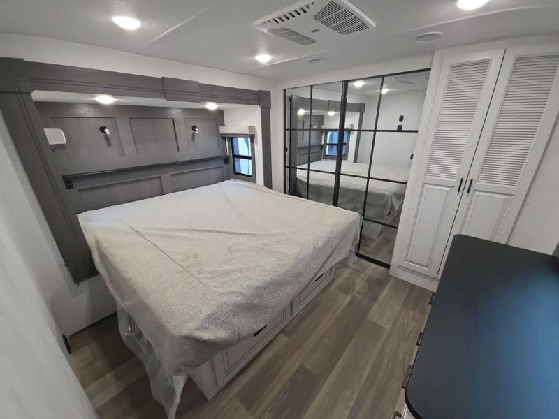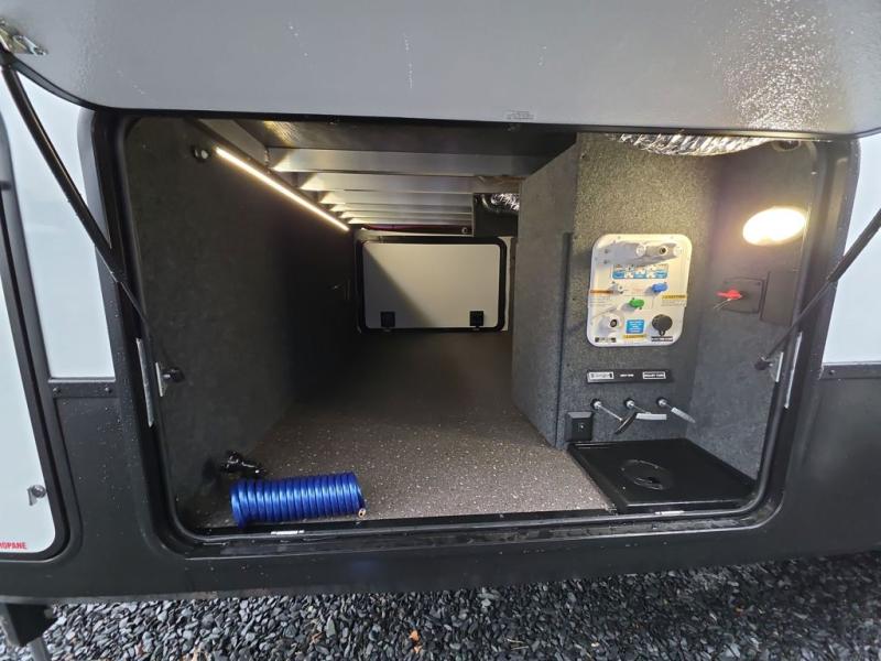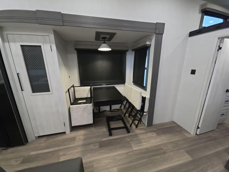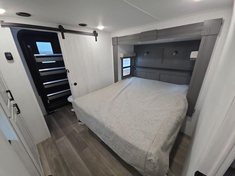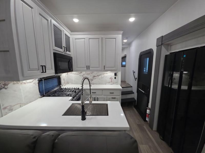 If you enjoy camping with a larger group of family or friends, this dual entry fifth wheel is for you! There is a front bedroom with a king bed slide and storage, plus a second bedroom in the back, complete with a full rear bath, a queen bed slide and storage space. A loft with a ladder is above the rear bedroom, which includes two bunk mats, loft cabinets, and TV prep if the little ones want to watch movies at night. Head to the middle of the unit to enjoy cooking on the four burner range and utilizing the generous counter space in the kitchen. There is also a walk-in pantry with a coffee bar and shelves, plus a 16 cu. ft. 12V refrigerator for food storage. Theater seating in the living room is in direct view of the TV and fireplace, and there is a tri-fold sofa slide out here as well for even more seating and sleeping space!