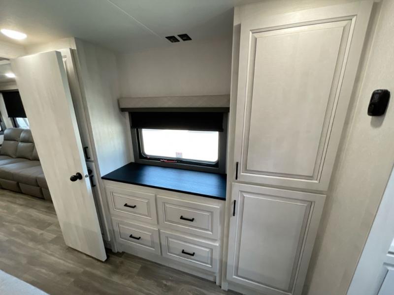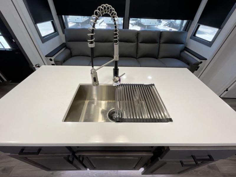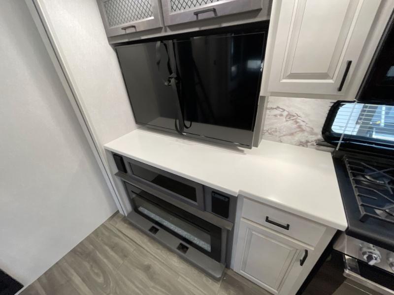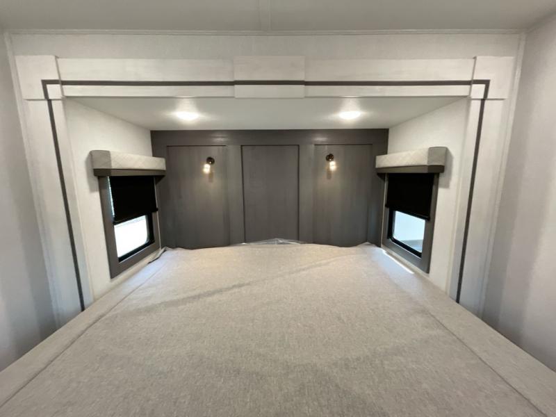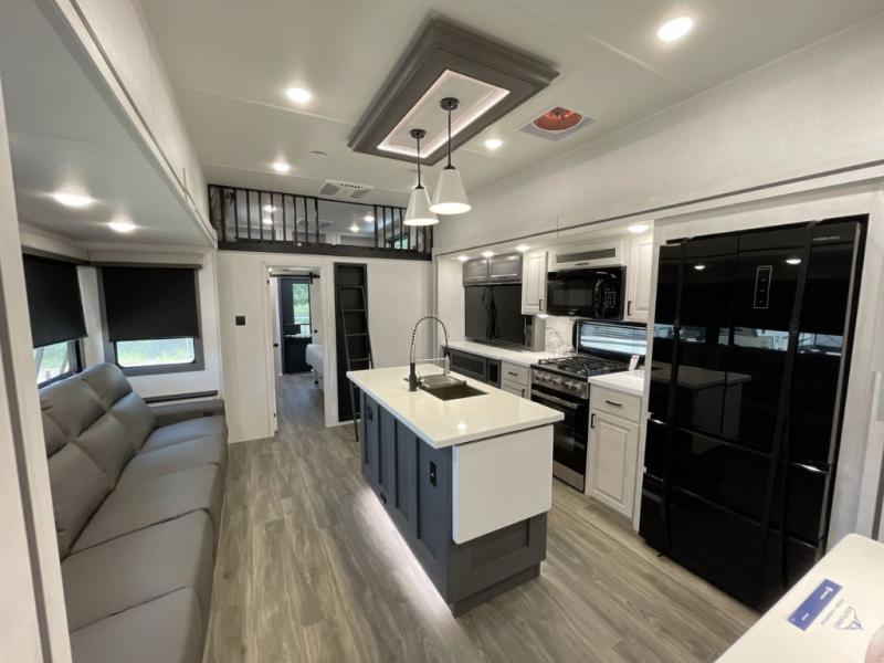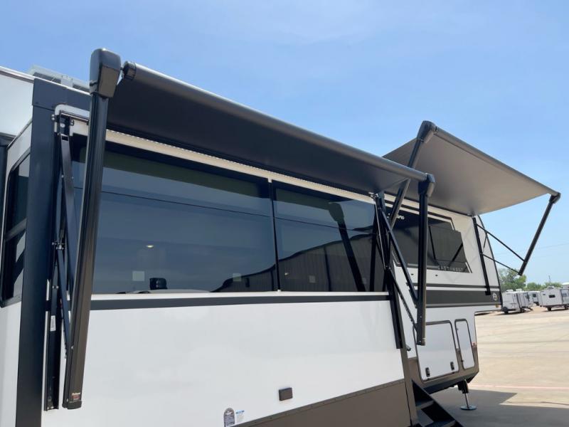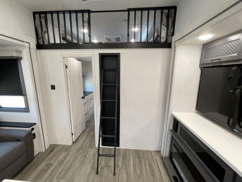 If you're looking for a luxury fifth wheel with more space for friends and family, you've found it in this Ahara! The main entry door opens up to the living area with dual opposing slides, a 50" LED TV with a fireplace, plus a full kitchen with residential appliances, a hutch, and even a pantry for dry goods and snacks. Everyone can meet here in the evenings to dine at the free-standing dinette or relax on the theater seating. You'll love the rear master suite with its king bed slide out, drawers under the bed, and full rear bath with the unique rear second entry door. And check out the Ahara Sky Suite loft above this room for even more sleeping or storage space! Your guests will find the front private bedroom to be accommodating since it includes a king bed slide out, drawers under the bed, plus a large wardrobe to keep clothes tidy. There is also a closet with washer and dryer prep. Who knows, you may just choose this bedroom for your own!