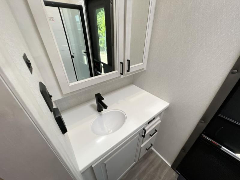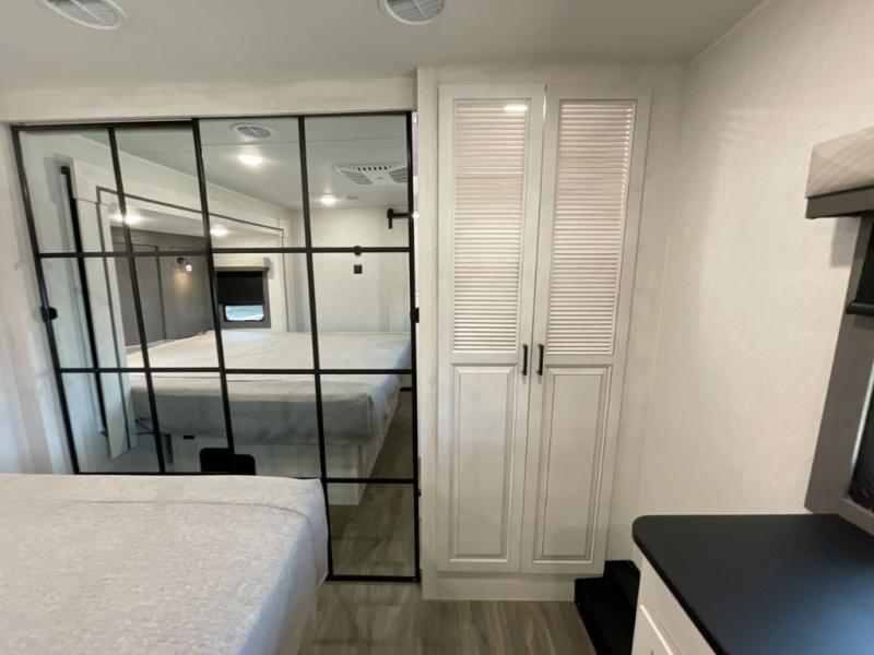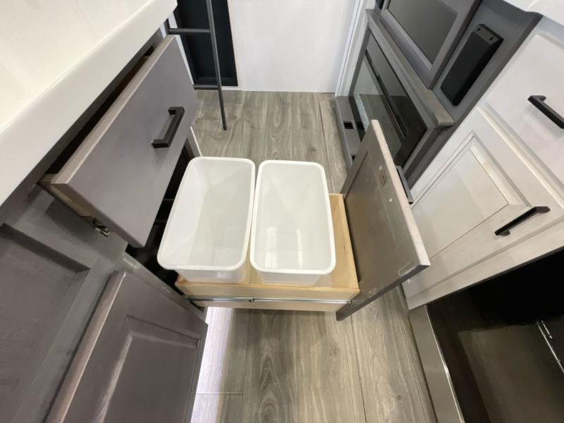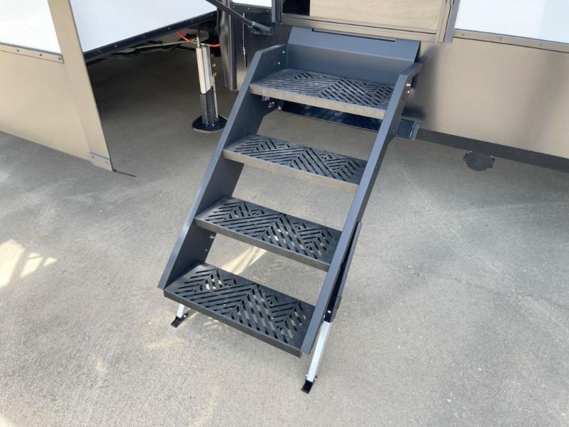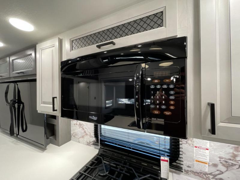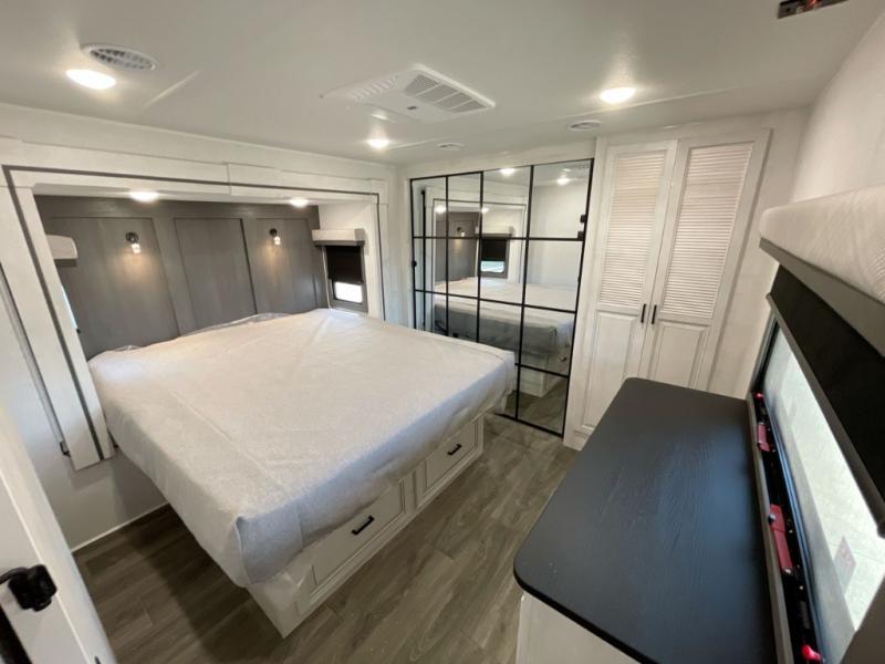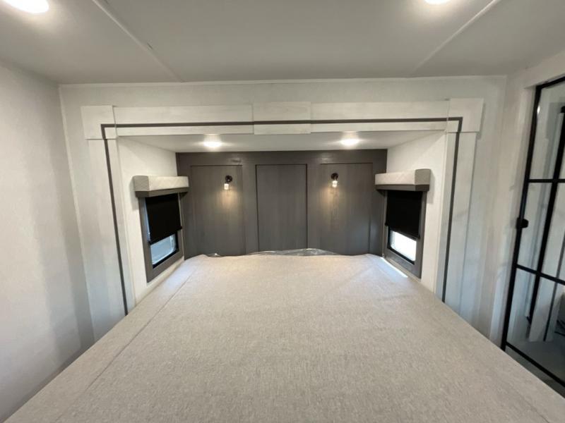If you're looking for a luxury fifth wheel with more space for friends and family, you've found it in this Ahara! The main entry door opens up to the living area with dual opposing slides, a 50" LED TV with a fireplace, plus a full kitchen with residential appliances, a hutch, and even a pantry for dry goods and snacks. Everyone can meet here in the evenings to dine at the free-standing dinette or relax on the theater seating. You'll love the rear master suite with its king bed slide out, drawers under the bed, and full rear bath with the unique rear second entry door. And check out the Ahara Sky Suite loft above this room for even more sleeping or storage space! Your guests will find the front private bedroom to be accommodating since it includes a king bed slide out, drawers under the bed, plus a large wardrobe to keep clothes tidy. There is also a closet with washer and dryer prep. Who knows, you may just choose this bedroom for your own!