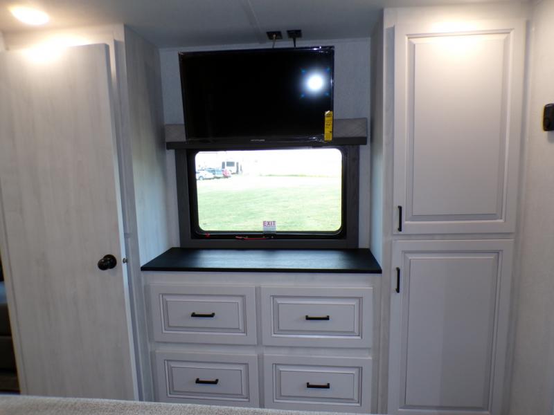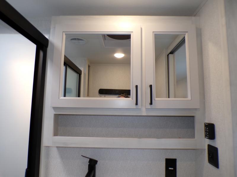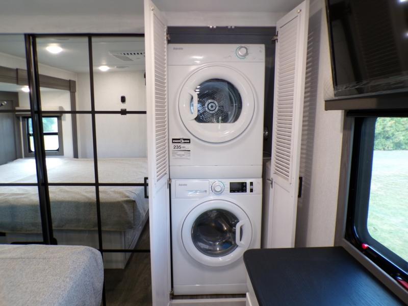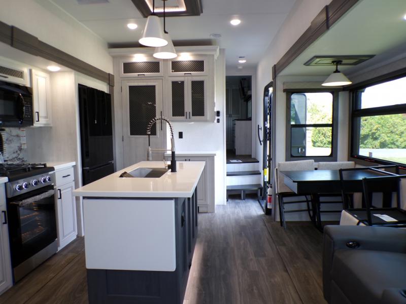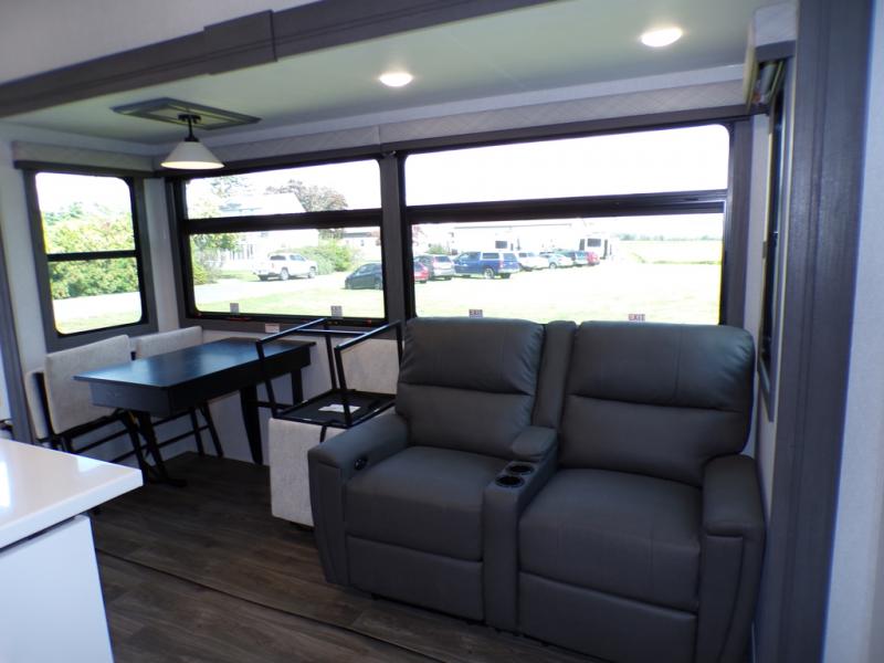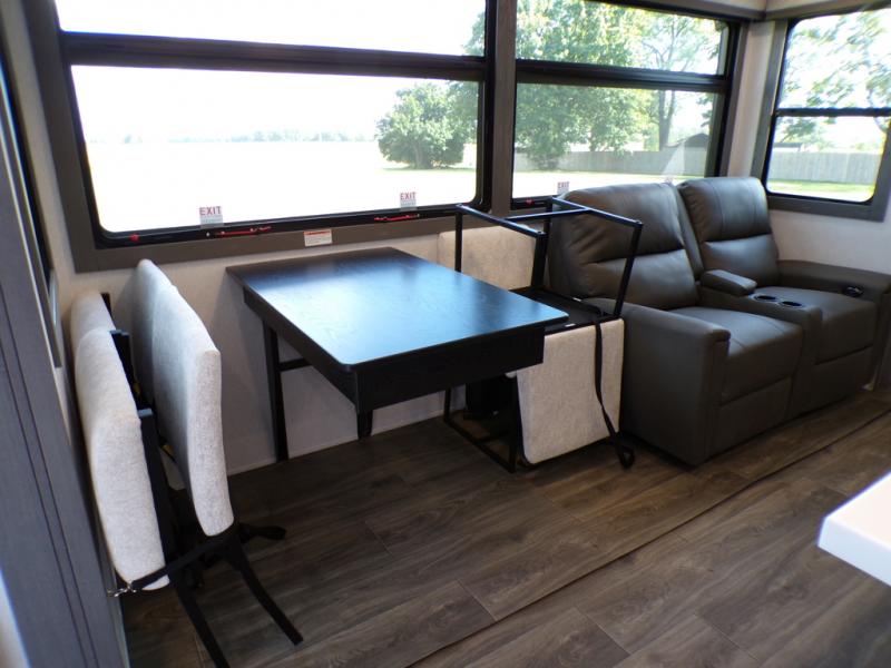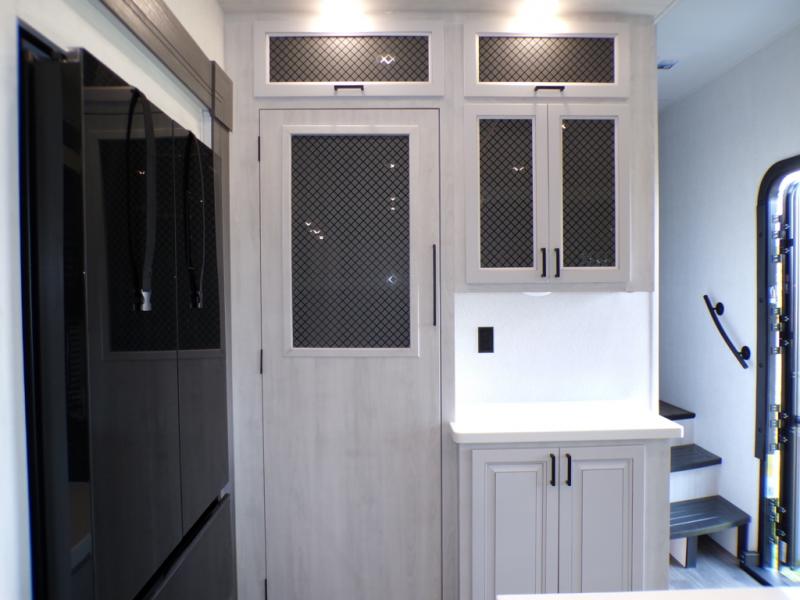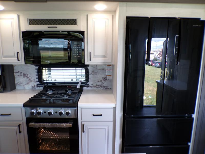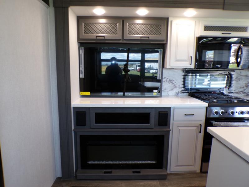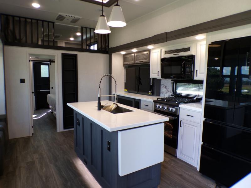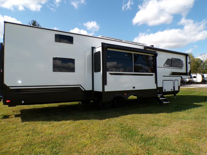 If you're looking for a luxury fifth wheel with more space for friends and family, you've found it in this Ahara! The main entry door opens up to the living area with dual opposing slides, a 50" LED TV with a fireplace, plus a full kitchen with residential appliances, a hutch, and even a pantry for dry goods and snacks. Everyone can meet here in the evenings to dine at the free-standing dinette or relax on the theater seating. You'll love the rear master suite with its king bed slide out, drawers under the bed, and full rear bath with the unique rear second entry door. And check out the Ahara Sky Suite loft above this room for even more sleeping or storage space! Your guests will find the front private bedroom to be accommodating since it includes a king bed slide out, drawers under the bed, plus a large wardrobe to keep clothes tidy. There is also a closet with washer and dryer prep. Who knows, you may just choose this bedroom for your own!