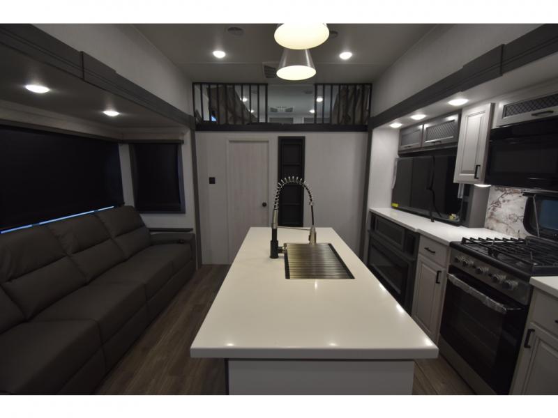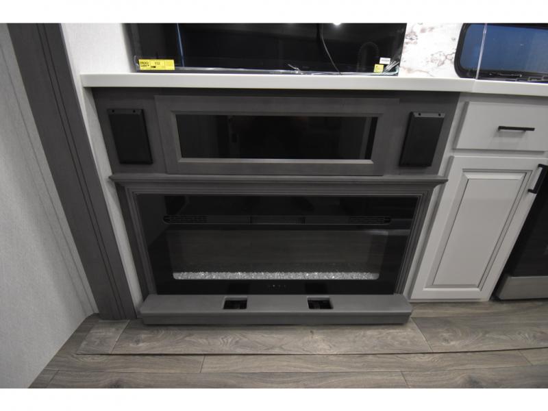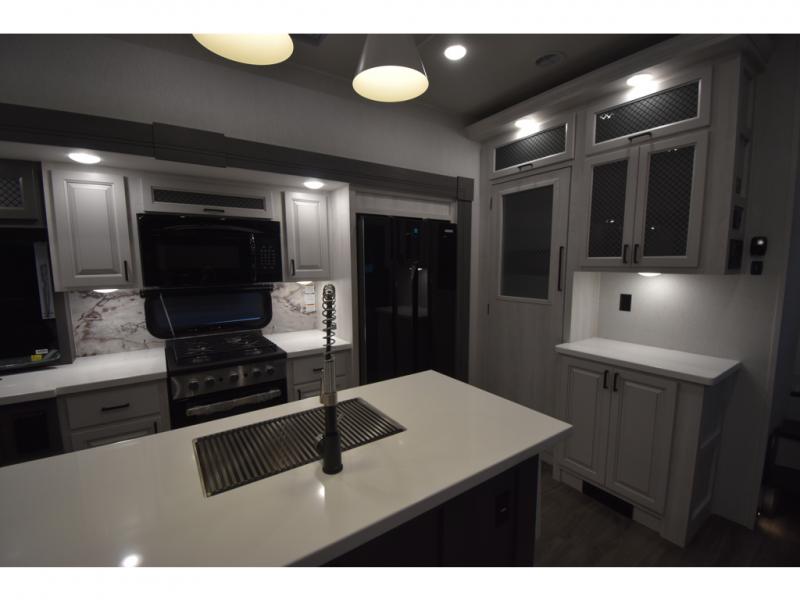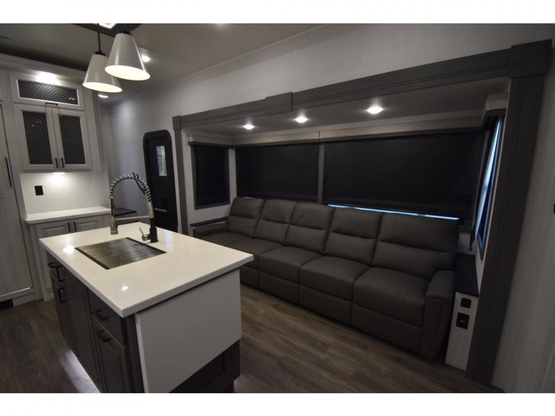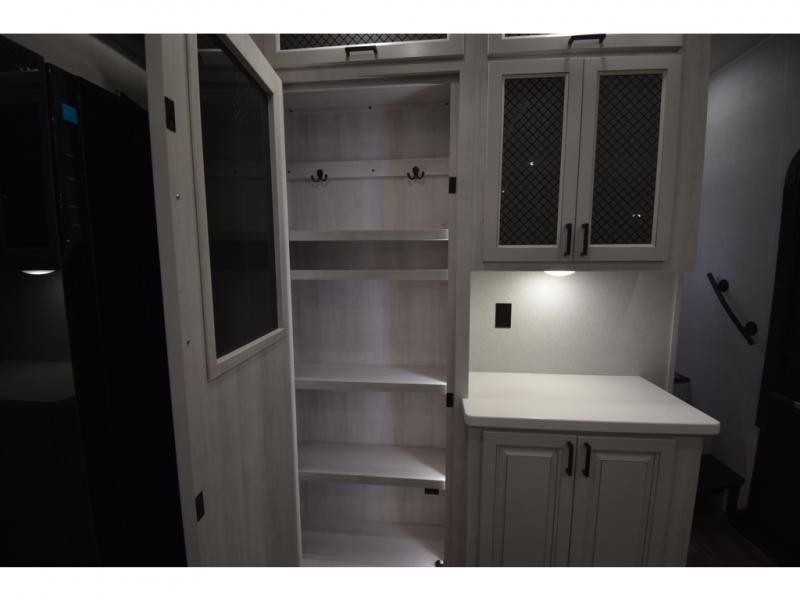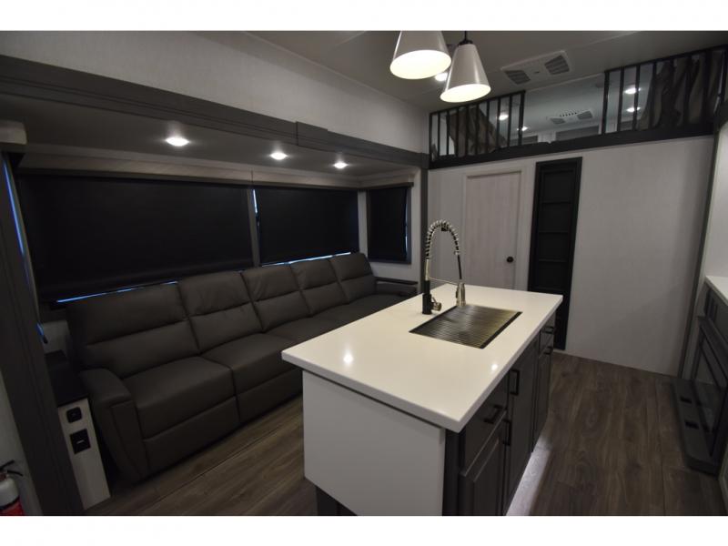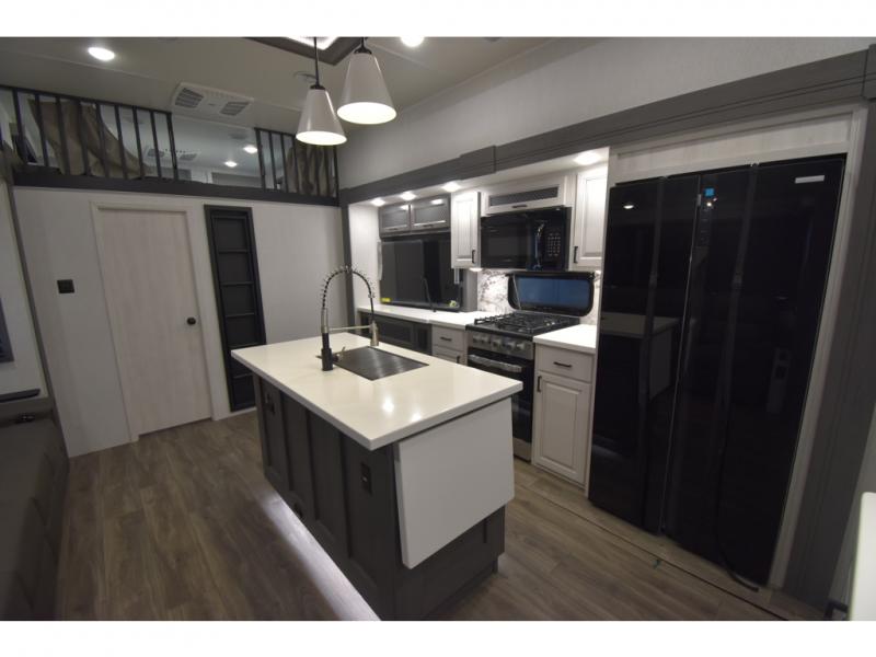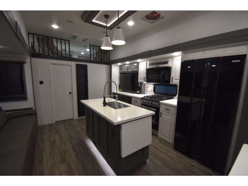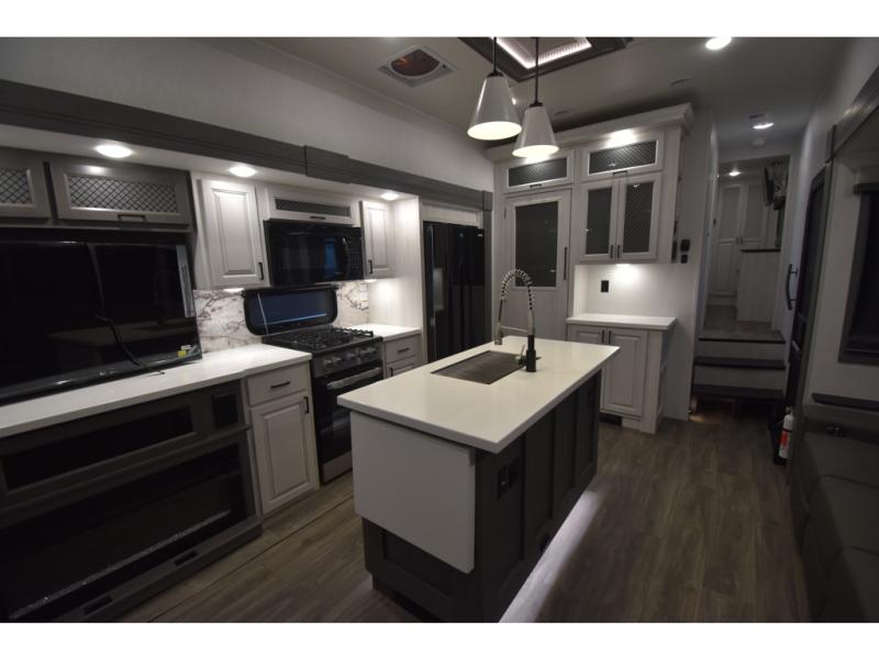 If you're looking for a luxury fifth wheel with more space for friends and family, you've found it in this Ahara! The main entry door opens up to the living area with dual opposing slides, a 50" LED TV with a fireplace, plus a full kitchen with residential appliances, a hutch, and even a pantry for dry goods and snacks. Everyone can meet here in the evenings to dine at the free-standing dinette or relax on the theater seating. You'll love the rear master suite with its king bed slide out, drawers under the bed, and full rear bath with the unique rear second entry door. And check out the Ahara Sky Suite loft above this room for even more sleeping or storage space! Your guests will find the front private bedroom to be accommodating since it includes a king bed slide out, drawers under the bed, plus a large wardrobe to keep clothes tidy. There is also a closet with washer and dryer prep. Who knows, you may just choose this bedroom for your own!