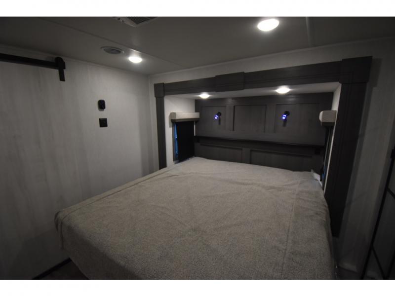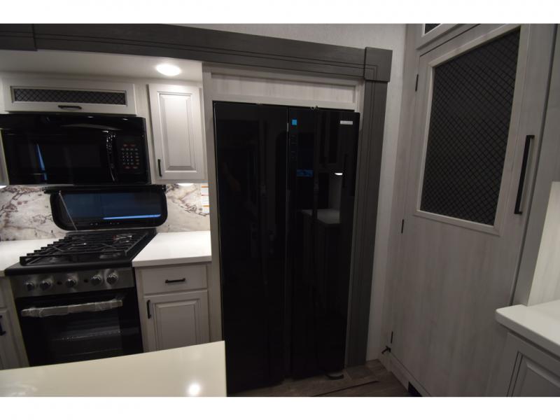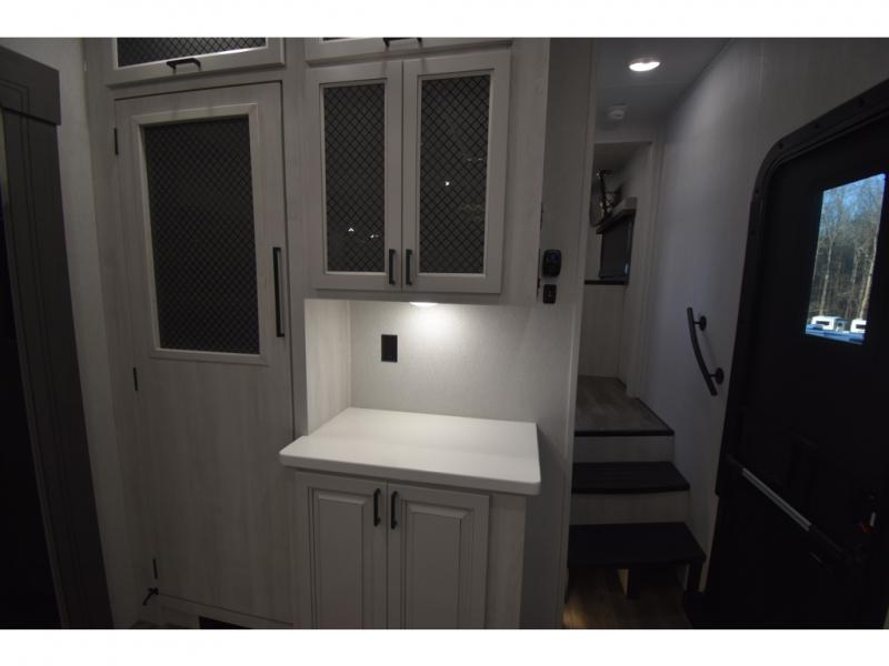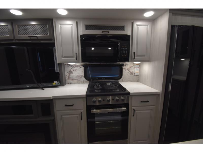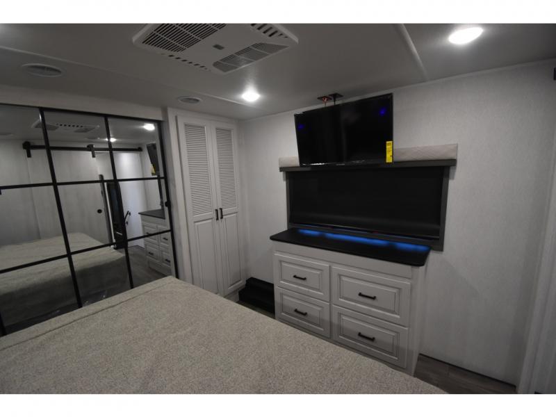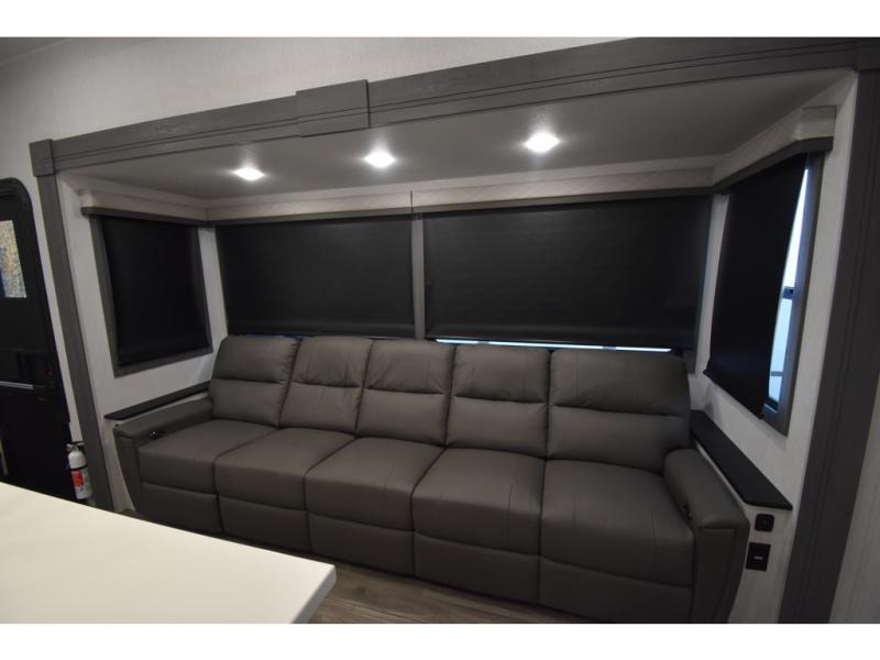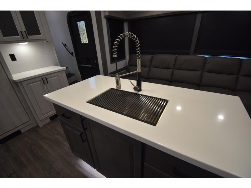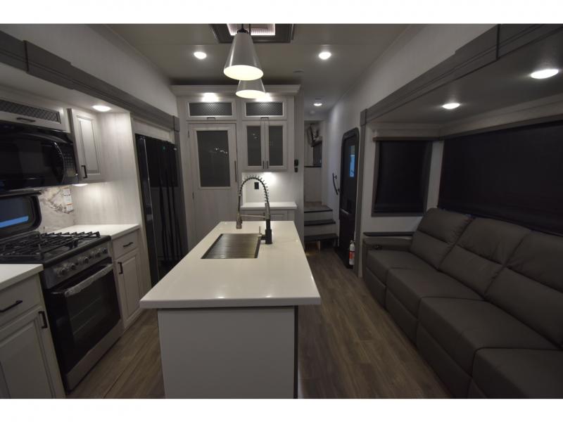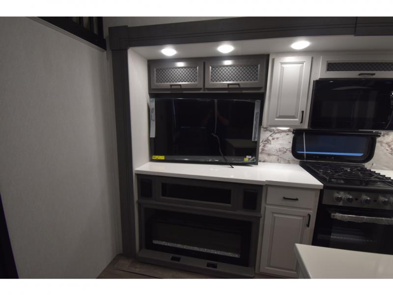 If you're looking for a luxury fifth wheel with more space for friends and family, you've found it in this Ahara! The main entry door opens up to the living area with dual opposing slides, a 50" LED TV with a fireplace, plus a full kitchen with residential appliances, a hutch, and even a pantry for dry goods and snacks. Everyone can meet here in the evenings to dine at the free-standing dinette or relax on the theater seating. You'll love the rear master suite with its king bed slide out, drawers under the bed, and full rear bath with the unique rear second entry door. And check out the Ahara Sky Suite loft above this room for even more sleeping or storage space! Your guests will find the front private bedroom to be accommodating since it includes a king bed slide out, drawers under the bed, plus a large wardrobe to keep clothes tidy. There is also a closet with washer and dryer prep. Who knows, you may just choose this bedroom for your own!