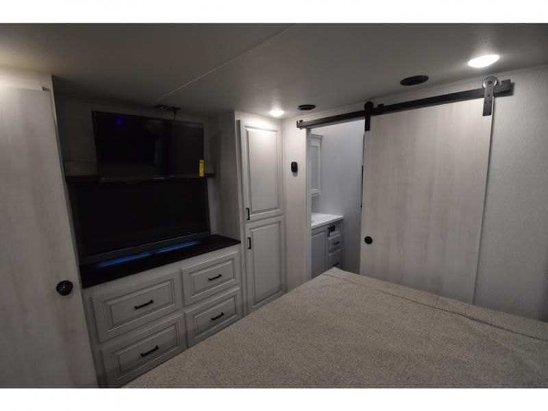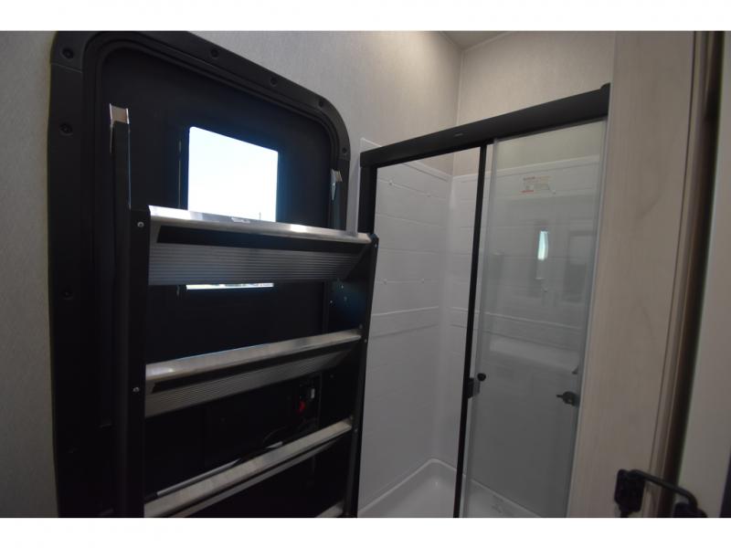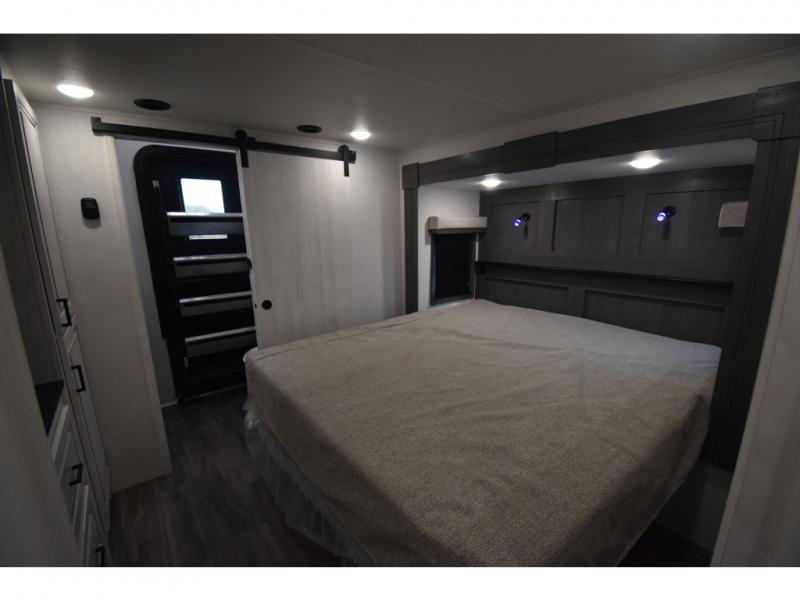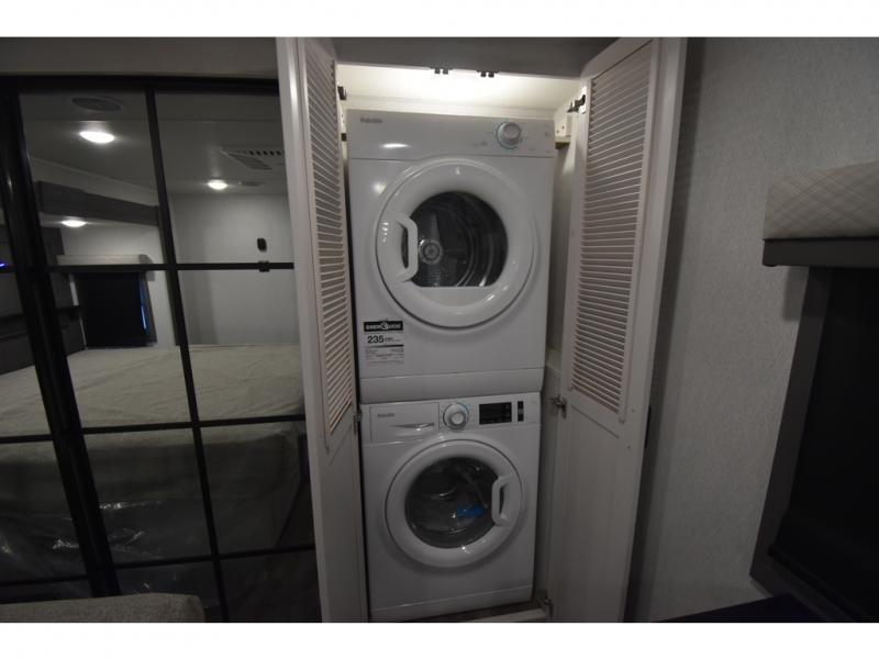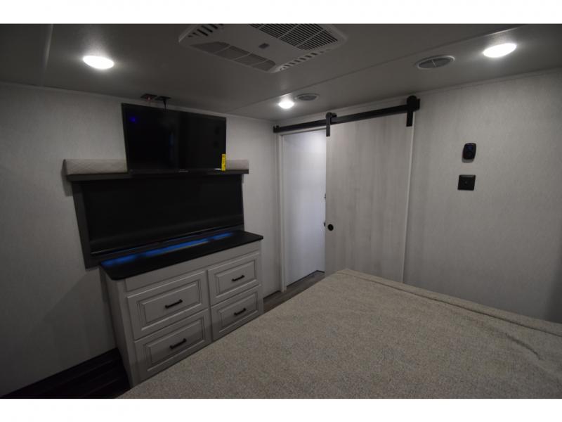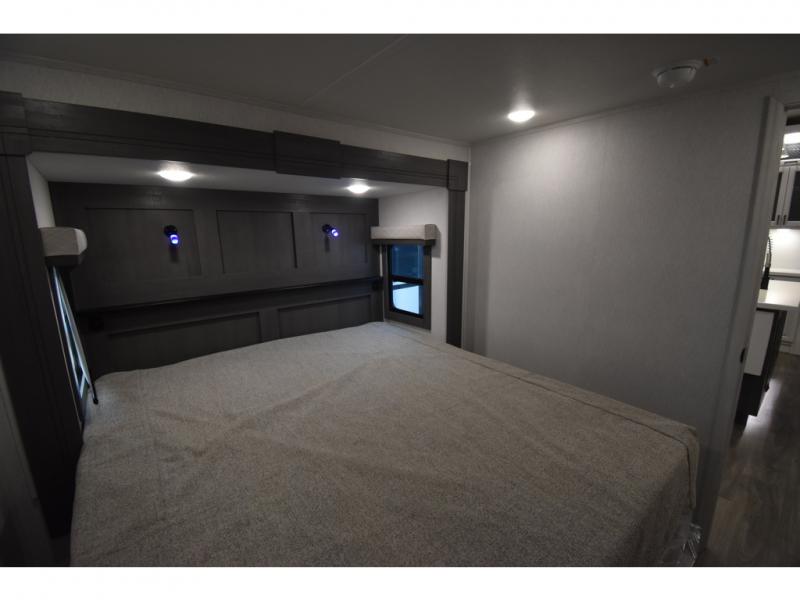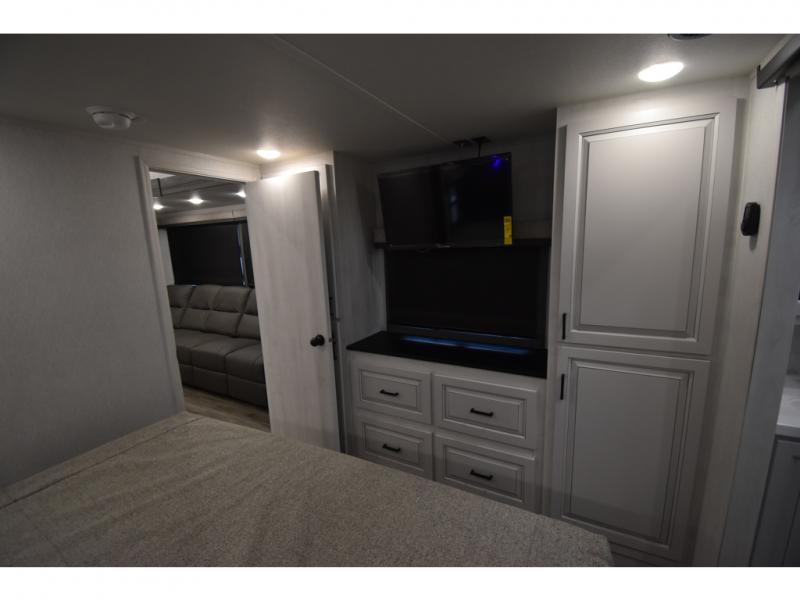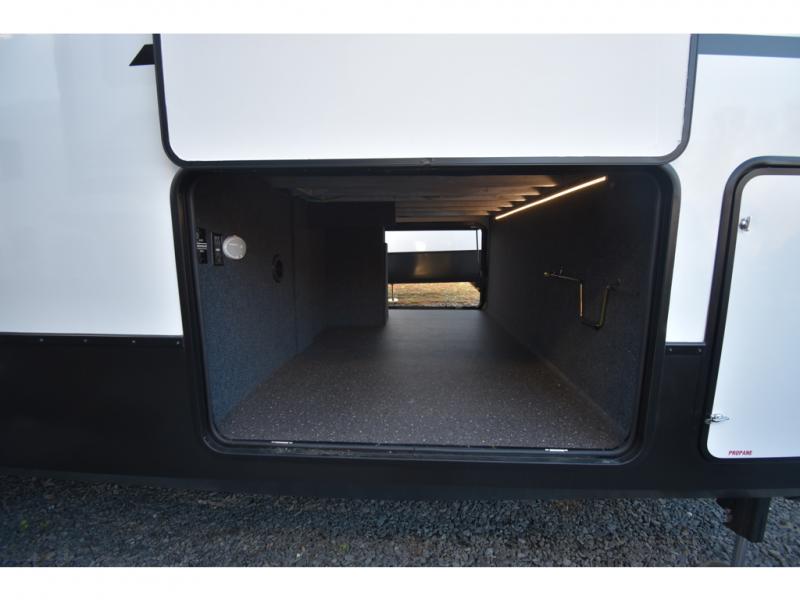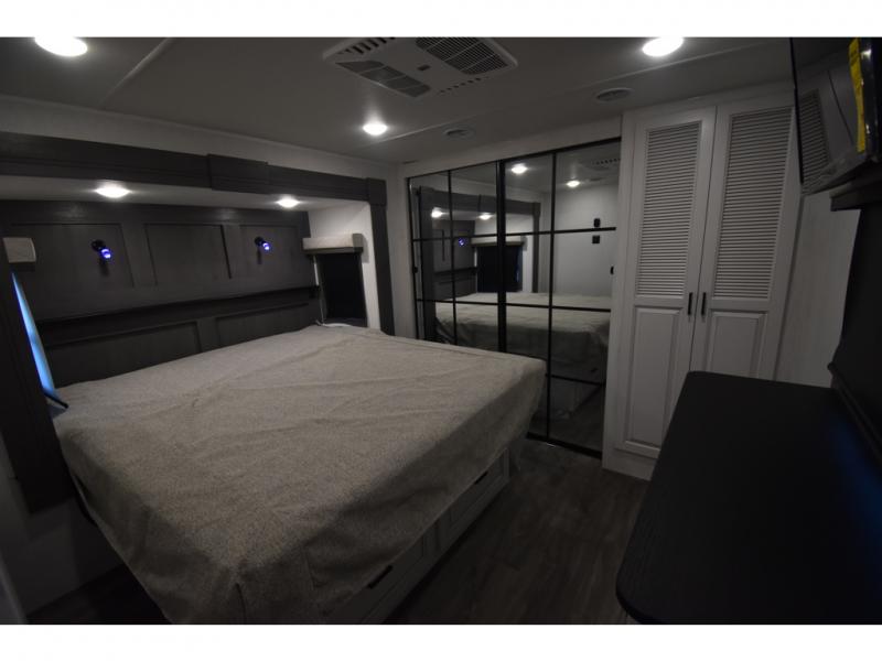 If you're looking for a luxury fifth wheel with more space for friends and family, you've found it in this Ahara! The main entry door opens up to the living area with dual opposing slides, a 50" LED TV with a fireplace, plus a full kitchen with residential appliances, a hutch, and even a pantry for dry goods and snacks. Everyone can meet here in the evenings to dine at the free-standing dinette or relax on the theater seating. You'll love the rear master suite with its king bed slide out, drawers under the bed, and full rear bath with the unique rear second entry door. And check out the Ahara Sky Suite loft above this room for even more sleeping or storage space! Your guests will find the front private bedroom to be accommodating since it includes a king bed slide out, drawers under the bed, plus a large wardrobe to keep clothes tidy. There is also a closet with washer and dryer prep. Who knows, you may just choose this bedroom for your own!