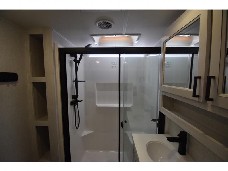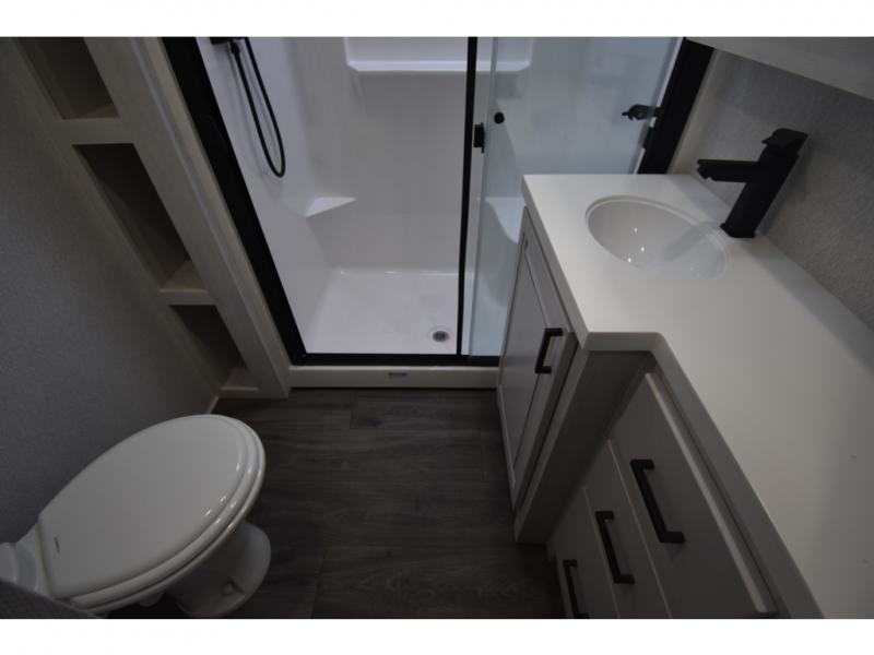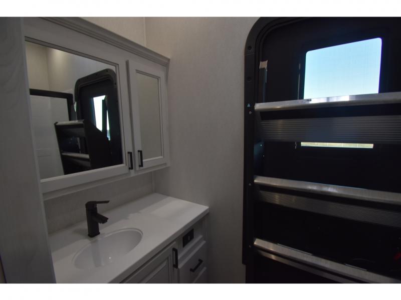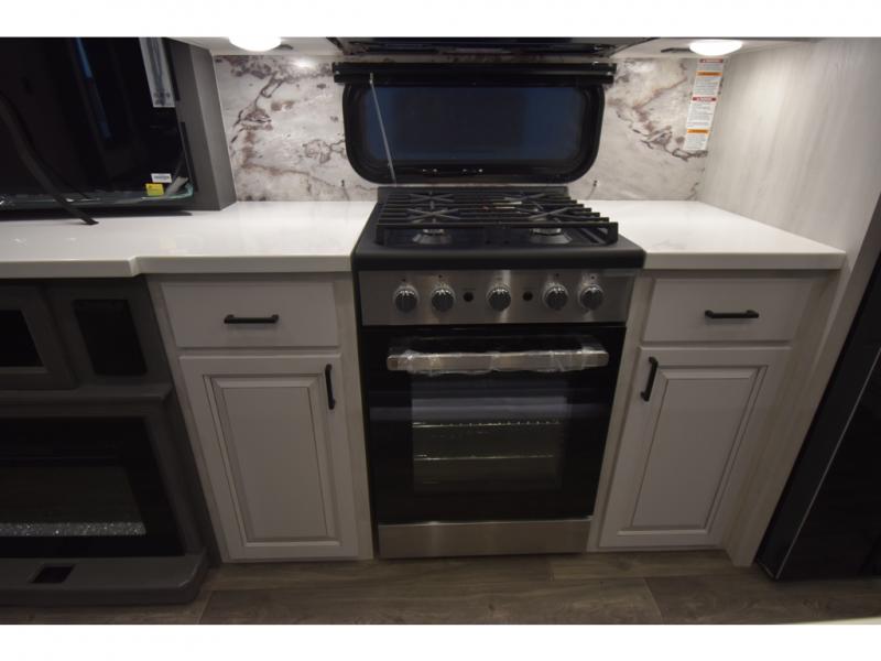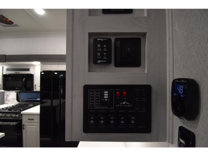 There is just too much luxury to name on the EAST TO WEST Ahara fifth wheel! These units are quite impressive, and once you see them, you'll know what we mean. The Ahara first grabs your attention with its fully painted aerodynamic fiberglass front cap, 102" wide-body chassis, and deep tint square frameless windows. For towing, you'll find a MORryde CRE 3000 suspension, LED marker lights, LED taillights with back-up lights, and rear view camera prep. Traveling in different climates is also made easy with the high-efficiency triple A/C system, 40,000 BTU high-capacity furnace, plus heated, insulated, and enclosed underbelly found within the Climate Package. Head inside to enjoy Slow Rise roller shades, a flush floor kitchen slide to help prevent trips, and solid surface countertops in the kitchen and bath to name a few luxuries!
