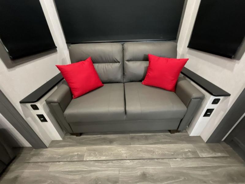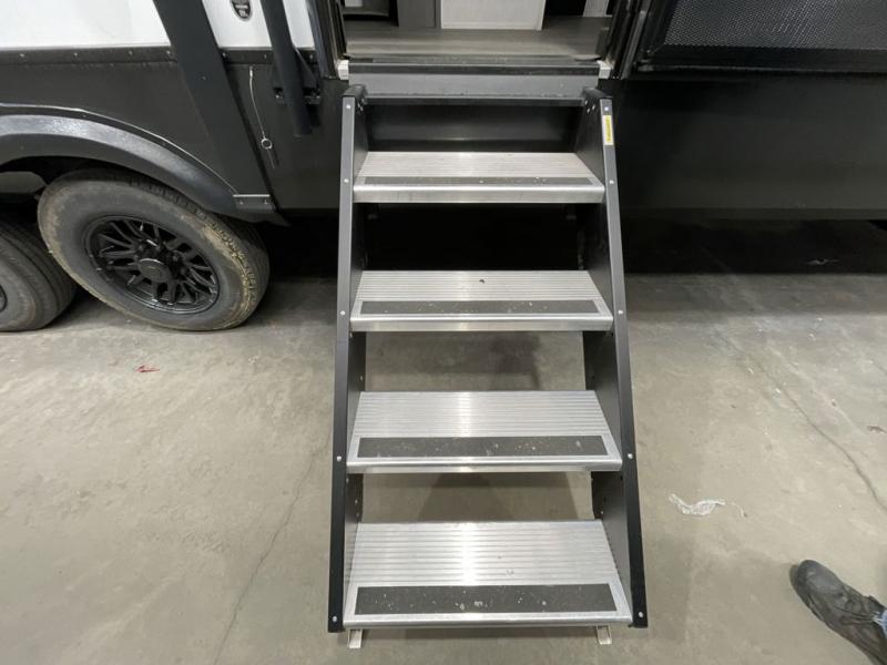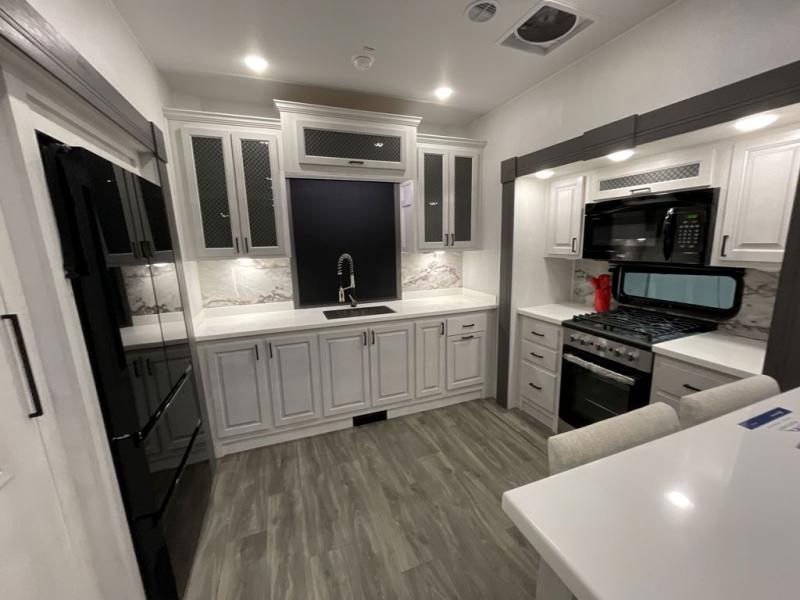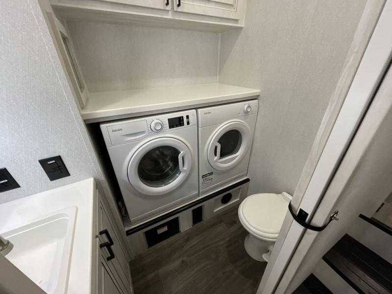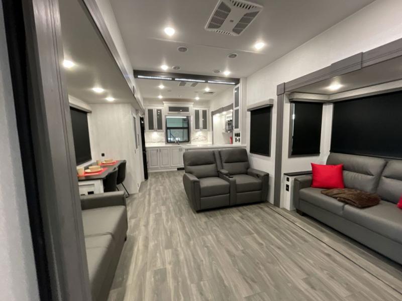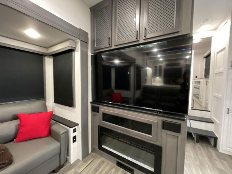 The spacious rear kitchen is equipped with a 30” microwave, 24” residential oven, overhead cabinets, breakfast bar with bar stools, walk-in pantry, and 16 cu. ft. refrigerator, perfect for cooking all your favorite dishes with the greatest convenience The living room is the heart of the home, featuring a desk with chairs, theater seating, two 60” trifold sofas, a TV with fireplace, and more. And when nature calls, you'll appreciate the convenient half bath with overhead cabinets and washer and dryer prep. The main bedroom is a serene retreat, featuring a king bed, drawers under the bed, a bedroom fireplace, and more. This is the perfect place to relax and recharge after a long day of adventure, and with a front full bathroom featuring a 30” x 40” shower, dual sink vanity, walk-in closet, dresser/drawers, you'll have everything you need to stay clean and comfortable on the go. Outside, you'll find not one, but two awnings to providing plenty of shade and protection from the elements.